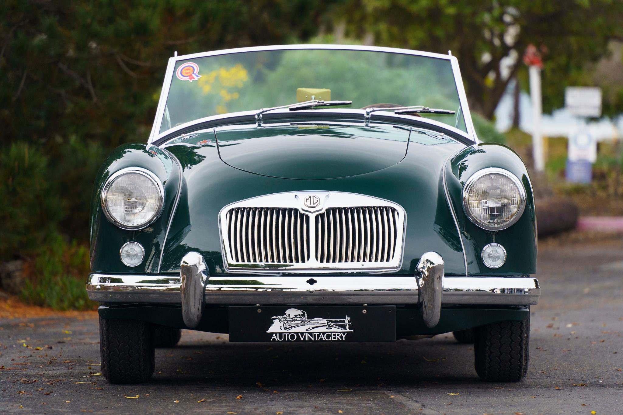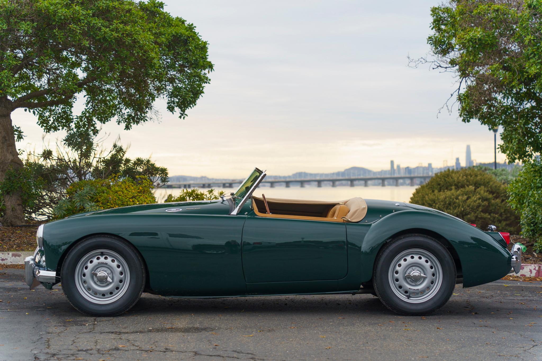 The frame, transmission tunnel, and gray Dunlop-branded 15×4″ steel wheels were powdercoated during the refurbishment. The wheels utilize two-ear knock-offs and are mounted with 165-series Vredestein Sprint Classic tires; a spare is located in the trunk. The four-wheel Dunlop disc braking system received replacement rotors and hydraulic lines. The suspension was overhauled with replated front components, a replacement front sway bar, and rebuilt rear springs.