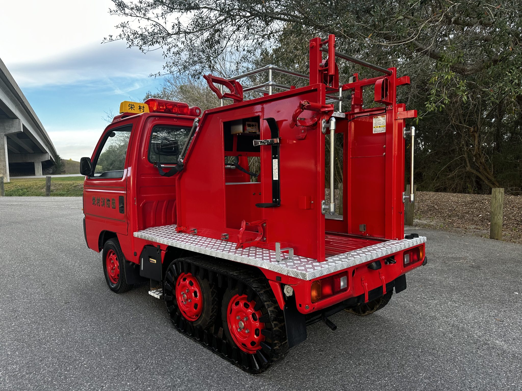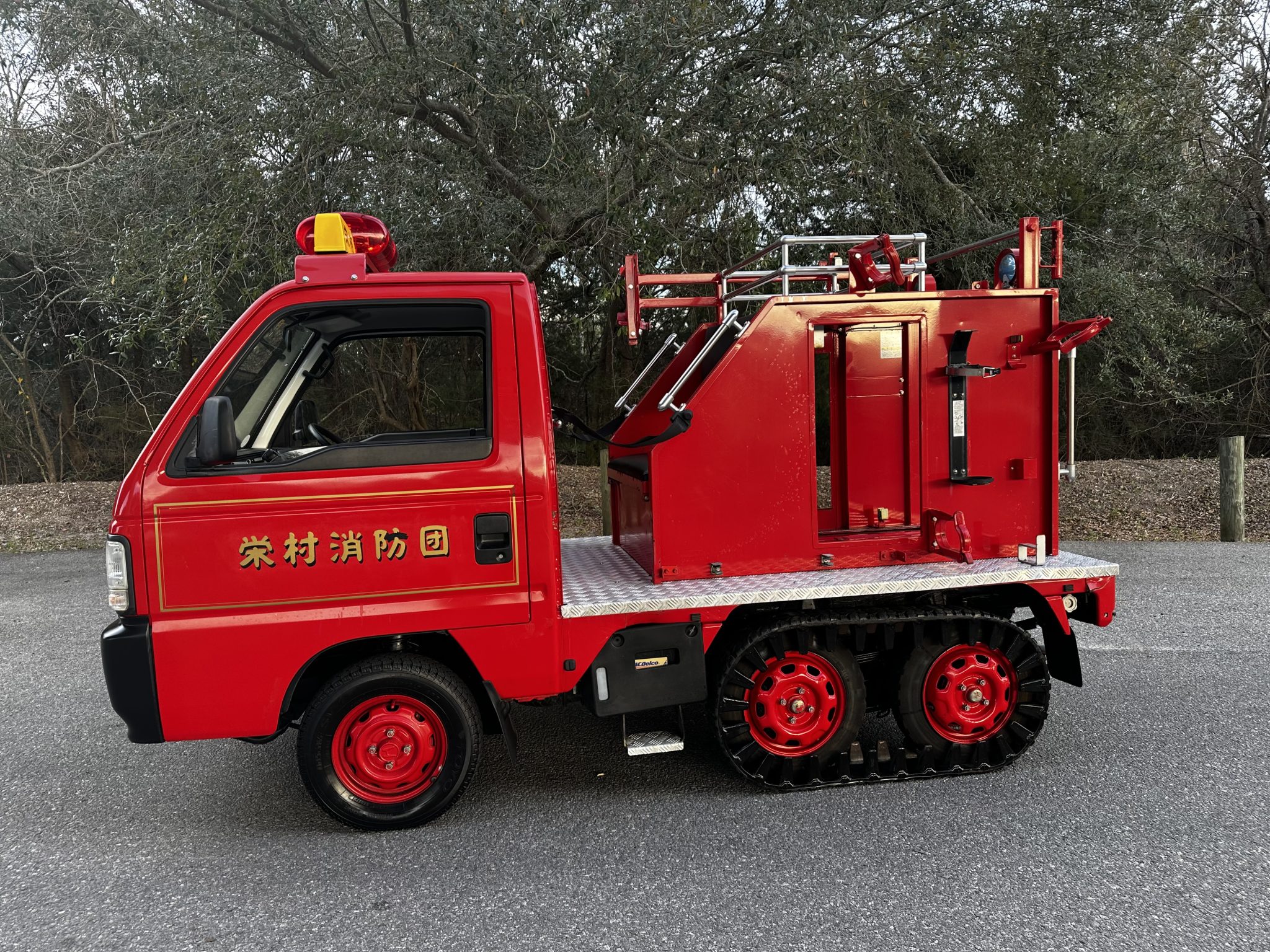 Red 12″ wheels are mounted with 145-width Toyo Observe SV-1 tires up front and Ohtsu solid rubber tires with rubber tracks out back. A spare is stored beneath the bed, and stopping power is provided by front disc and rear drum brakes. A spare set of four silver wheels with Bridgestone K305 tires is included in the sale and can be seen installed on the truck in the gallery below.