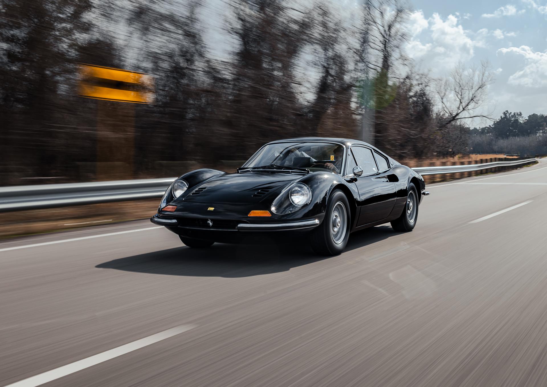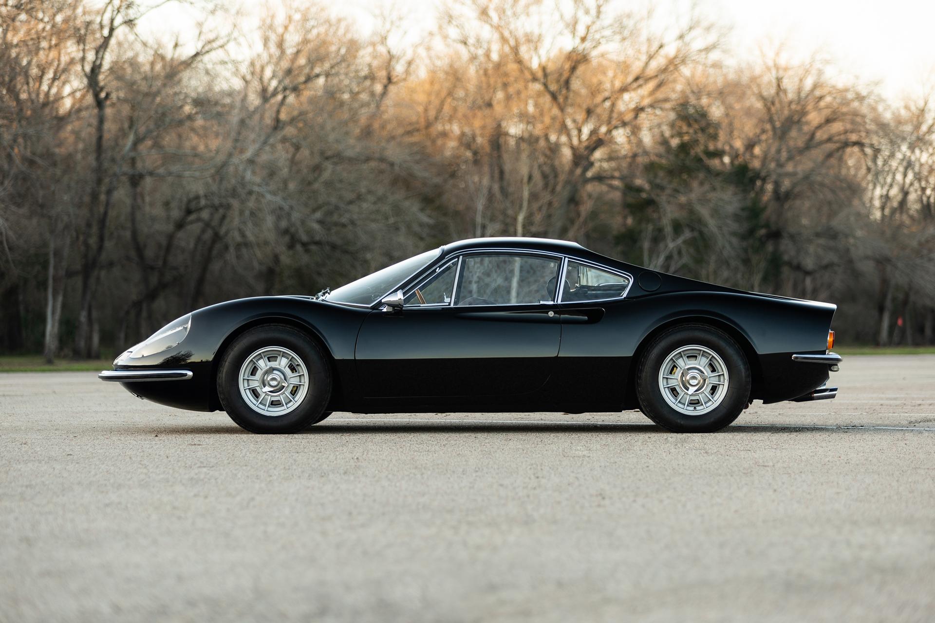 The Scaglietti-built bodywork on this example was delivered from the factory in Fly Yellow and underwent a color change to red in the 1970s before it was painted in its current black under previous ownership. Side marker lights were removed at the time of the repaint, and additional features include a prancing horse grille badge, headlights with plexiglass covers, and a quad-exit exhaust. Replacement door and body seals and moldings were installed by the selling dealer in 2022. Imperfections on the bumpers and body are detailed in the gallery.