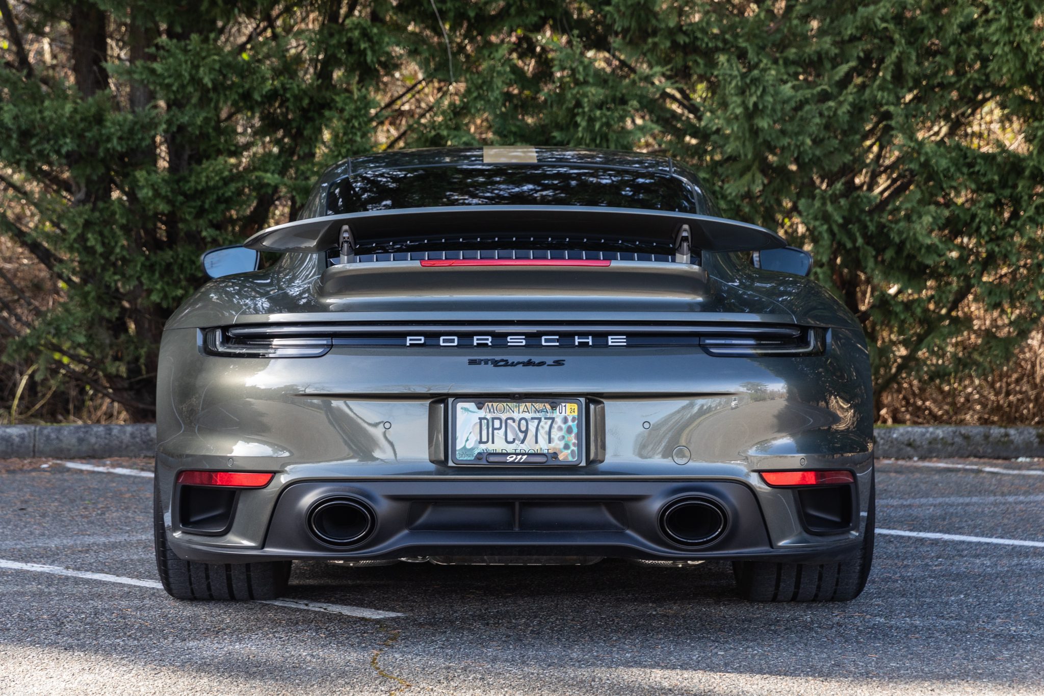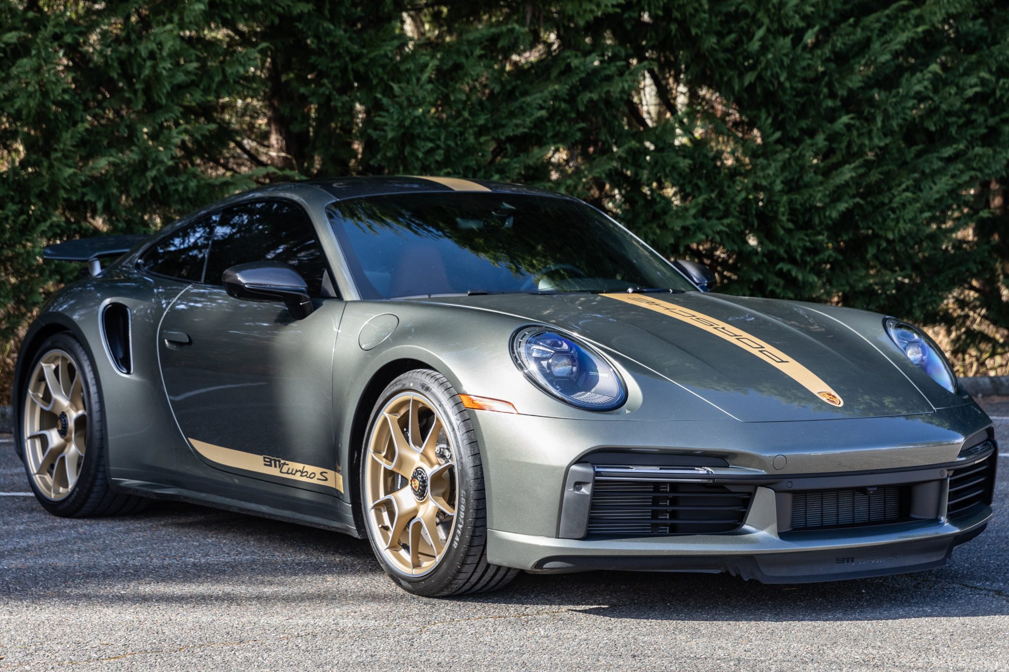 Optional 20″ and 21″ 911 Turbo S Exclusive Design center-lock wheels are finished in Satin Aurum and wear 255/35 front and 315/30 rear Goodyear Eagle F1 tires. The car is equipped with Porsche Active Suspension Management (PASM), and the Porsche Ceramic Composite Brakes (PCCB) utilize gloss-black six-piston calipers up front and four-piston units in the rear. The car was also optioned with a front axle-lift system and Power Steering Plus.