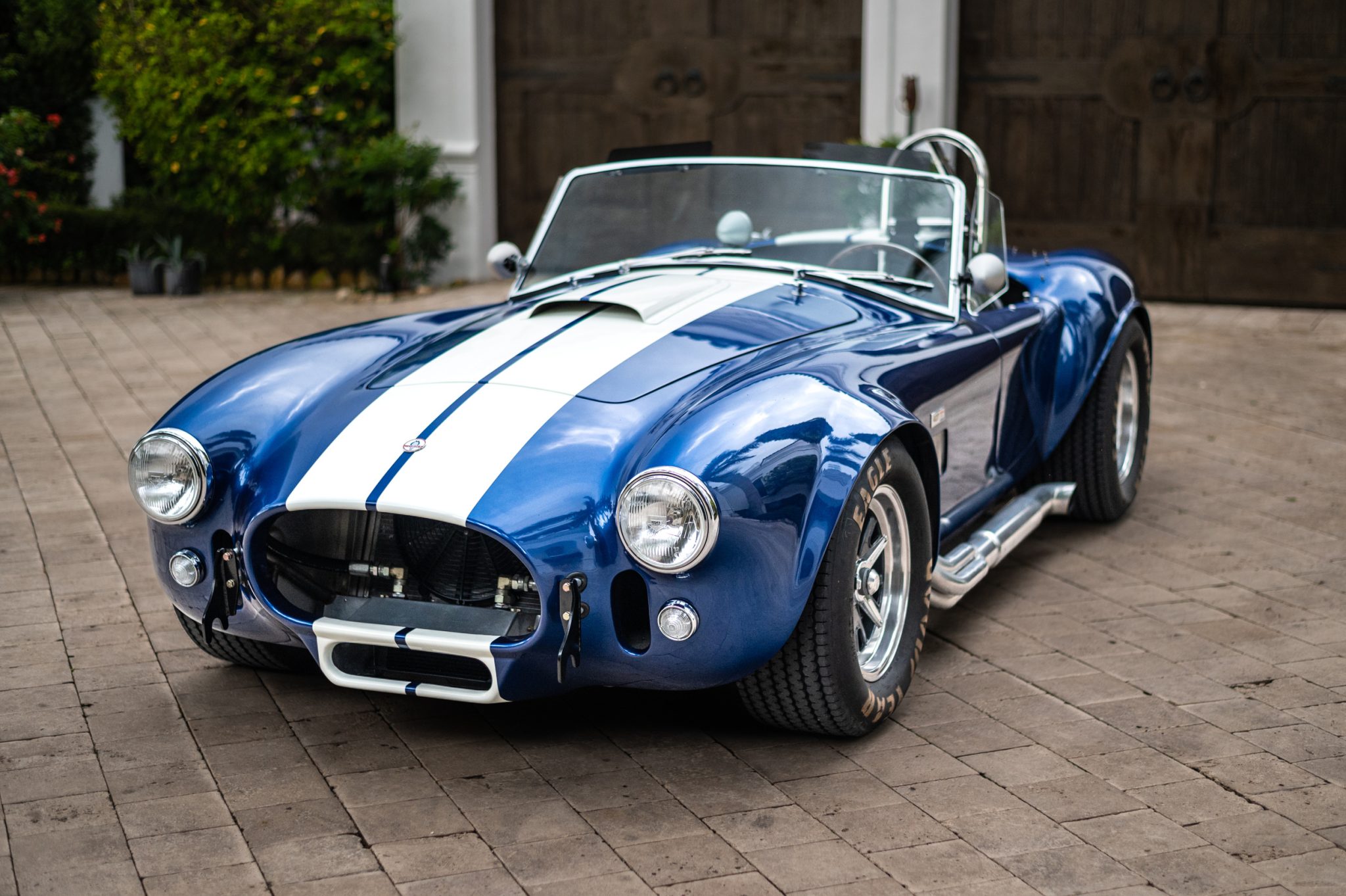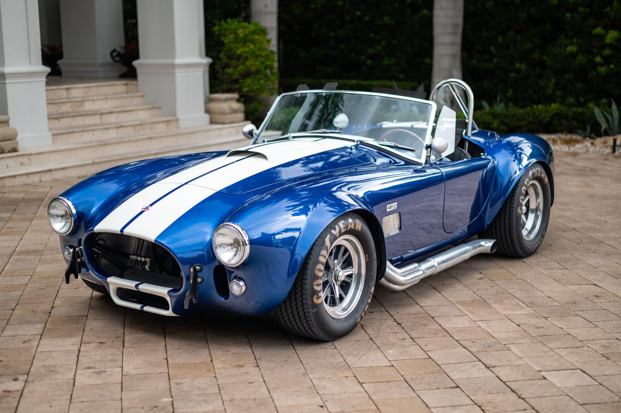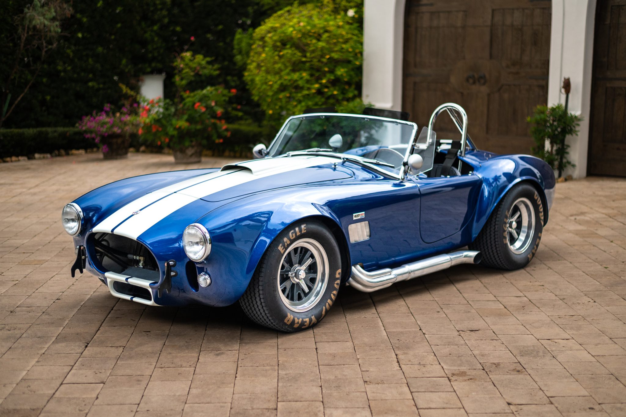 Halibrand-style 15″ wheels with gray centers, polished lips, and three-eared knock-off spinners are mounted with Goodyear Eagle Sport Car Special white-letter tires that measure 26.5×8″ up front and 26.5×10.5″ out back. Stopping power is provided by Wilwood four-wheel disc brakes with cross-drilled rotors.