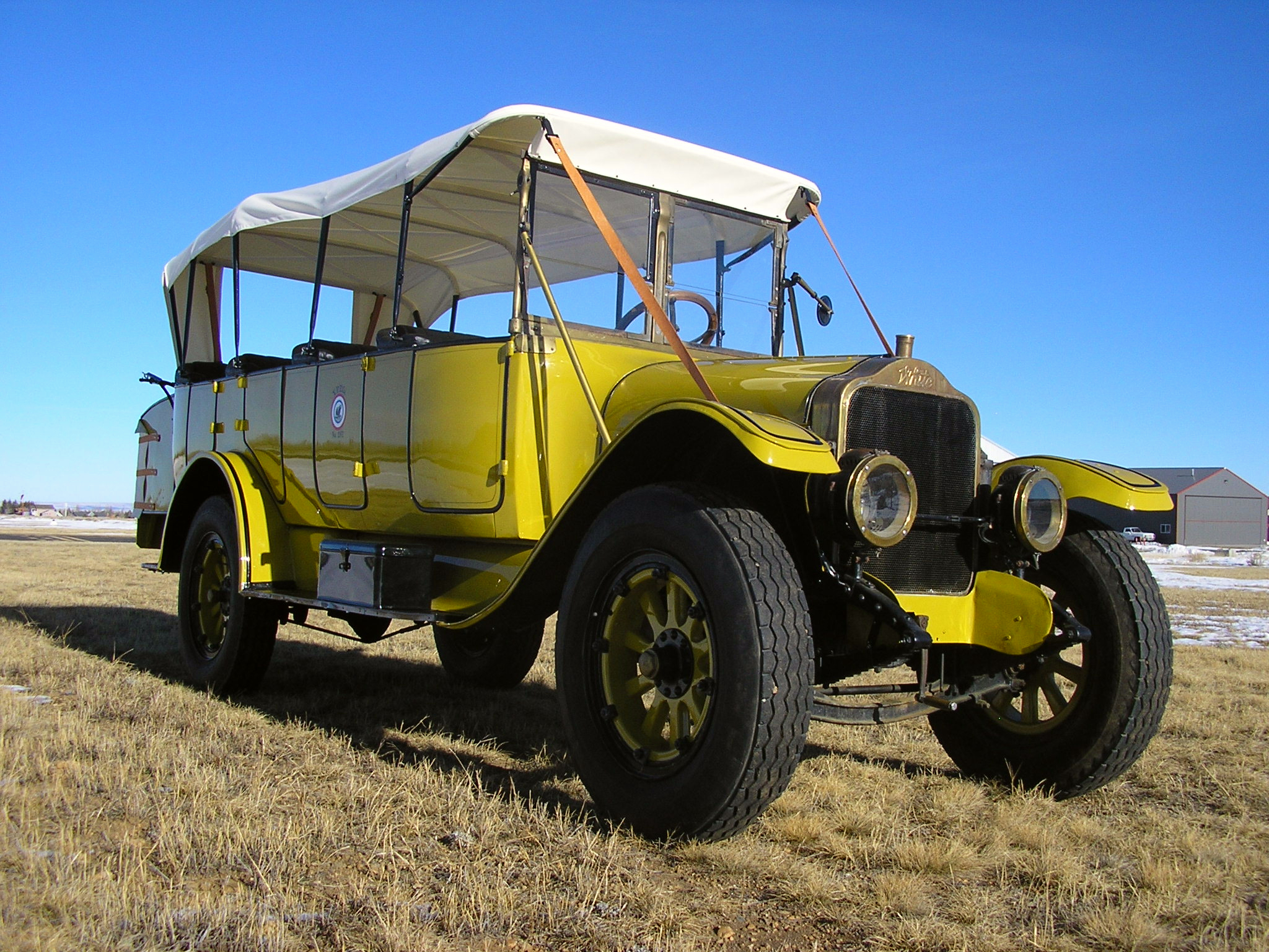 This example’s body was finished in primer prior to being purchased by the current owner, who subsequently commissioned a repaint in single-stage urethane replicating the YPTCo’s yellow livery with black molding and hand-painted pinstripes. Early Yellowstone buses were designed with four doors on the right side of the body, with sealed simulated doors on the left side to prevent passengers from deboarding into traffic. The white canvas top was installed in 2010 and is supported by removable stays and leather straps.
