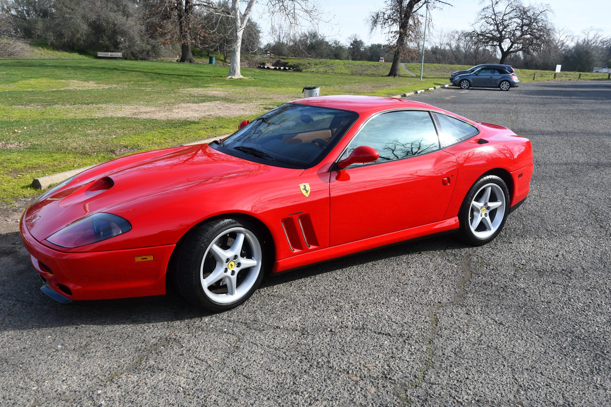 The 18″ five-spoke alloy wheels are mounted with Michelin Pilot Super Sport tires that were installed in August 2021 and measure 255/40 up front and 295/35 out back. Braking is handled by black-finished Ferrari-branded calipers over cross-drilled and ventilated rotors at all four corners. The front rotors and pads were replaced in 2019, and the seller states that the left-rear wheel was replaced after it fell off while driving and caused damage to the brake caliper. The wheels are said to have been refinished in 2006.