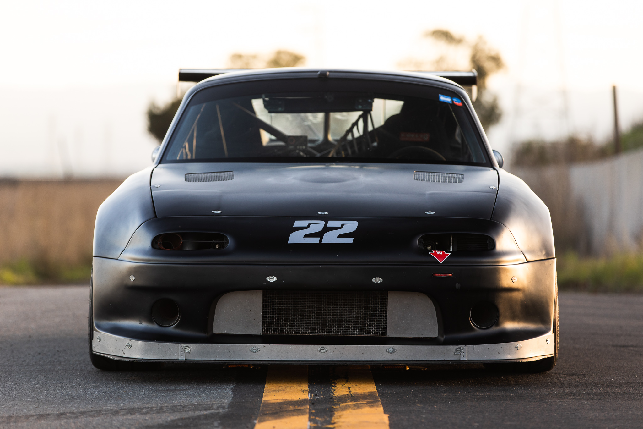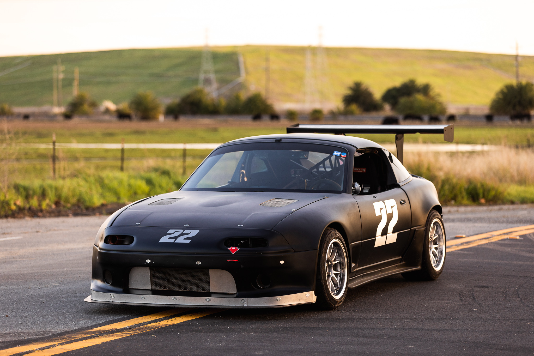 Silver-finished 15×10″ 949 Racing wheels are wrapped in 245/40 Falken Azenis RT660. The suspension has been modified with AST Suspension 5220 double-adjustable coilovers with remote reservoirs, and stopping power is provided by a Stoptech STR42 front big brake kit with 11.75″ rotors as well as Miata sport rear calipers with 10.9″ rotors. Delrin upper control arm bushings have been added, and the front coilovers have been serviced along with fitting a fire sleeve to the remote reservoir and flushing the brake fluid in 2022.