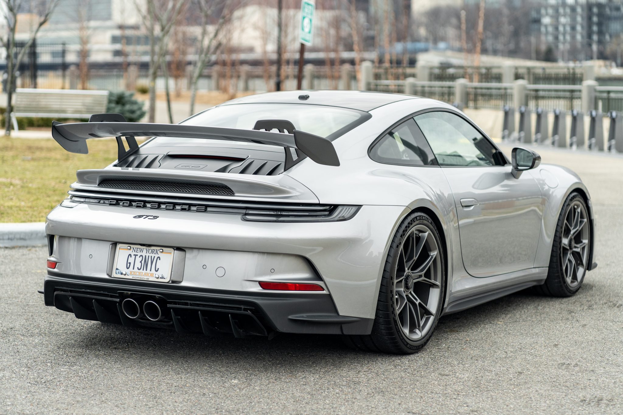 Center-locking 20″ and 21″ forged alloy wheels are finished in Satin Dark Silver and wear 255/35 front and 315/30 rear Michelin Pilot Sport Cup 2 tires. The car was optioned with a front-axle lift system in addition to gloss black-finished brake calipers which are mounted over cross-drilled cast-iron rotors. Scratches on the rim of the left-front wheel are depicted in the gallery.