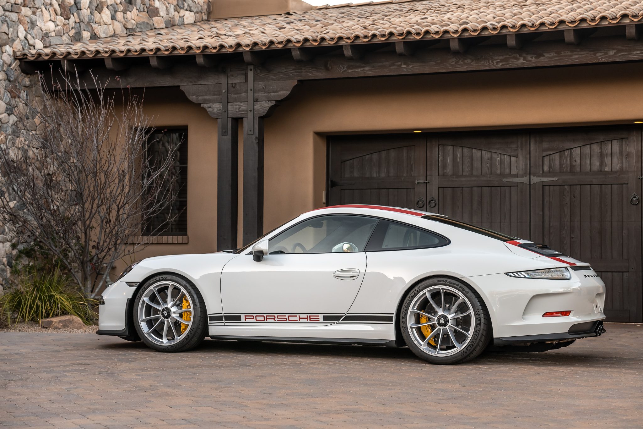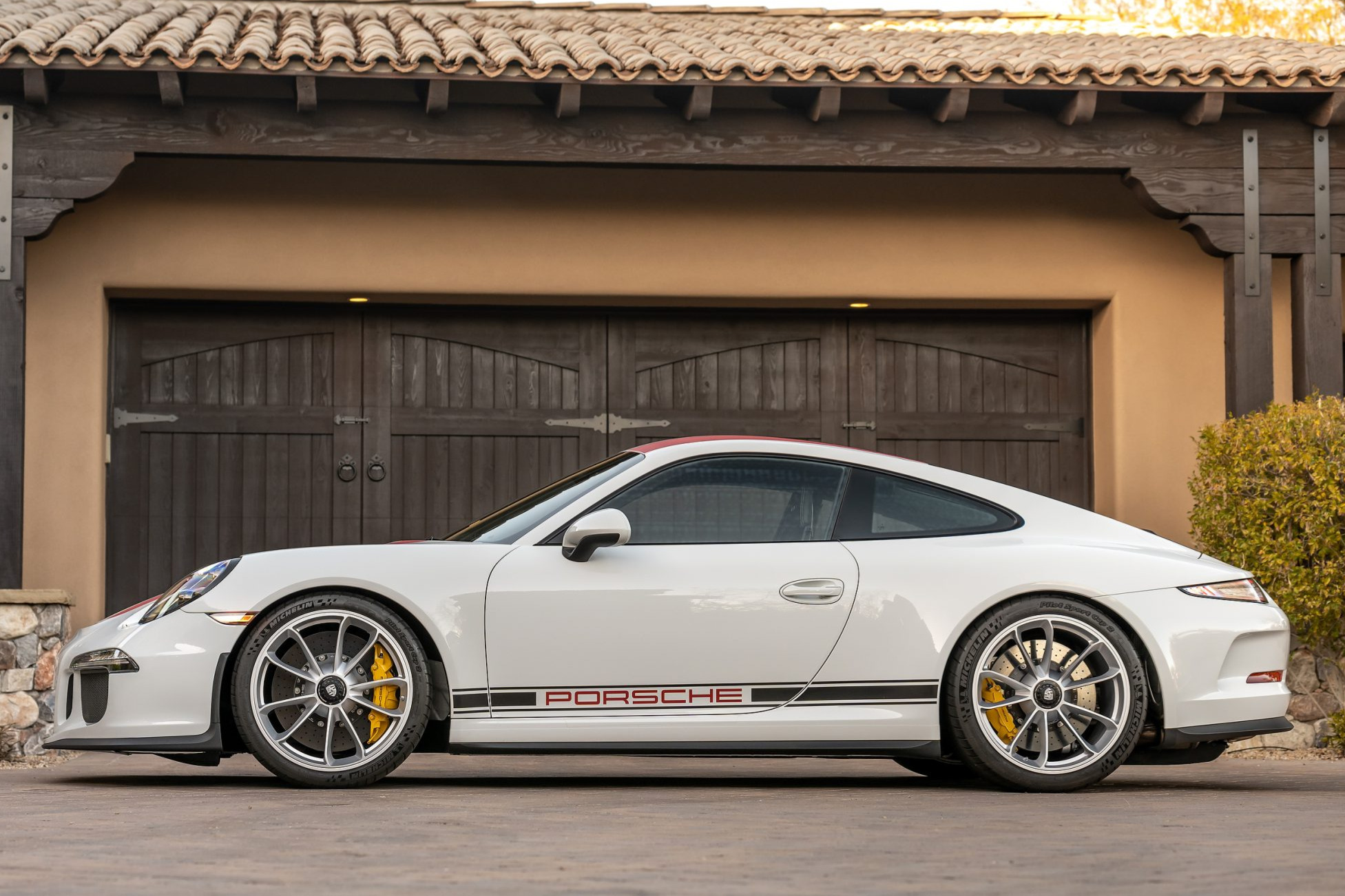 Silver 20″ center-lock GT3 alloy wheels are mounted with Michelin Pilot Sport Cup 2 tires measuring 245/35 up front and 305/30 out back. Adjustable suspension underpinnings and rear-axle steering were shared with the contemporary GT3, though specially tuned for the 911 R. A front-axle lift system was optioned from the factory, and stopping power is provided by yellow six- and four-piston monobloc calipers over ceramic-composite rotors at each corner.