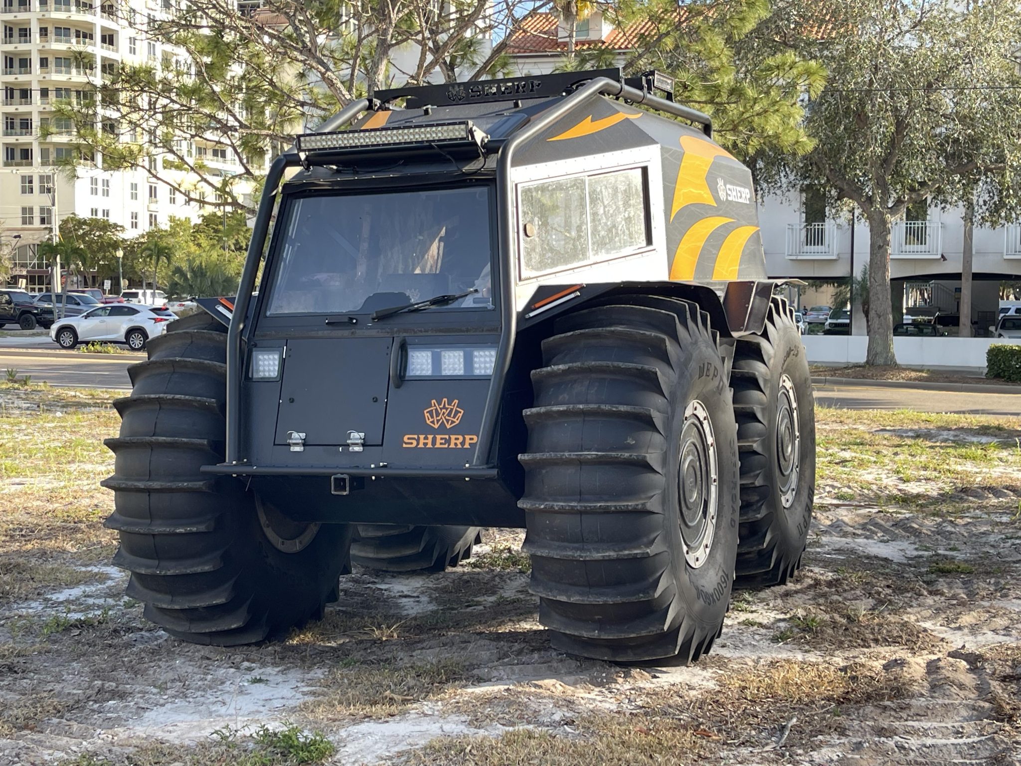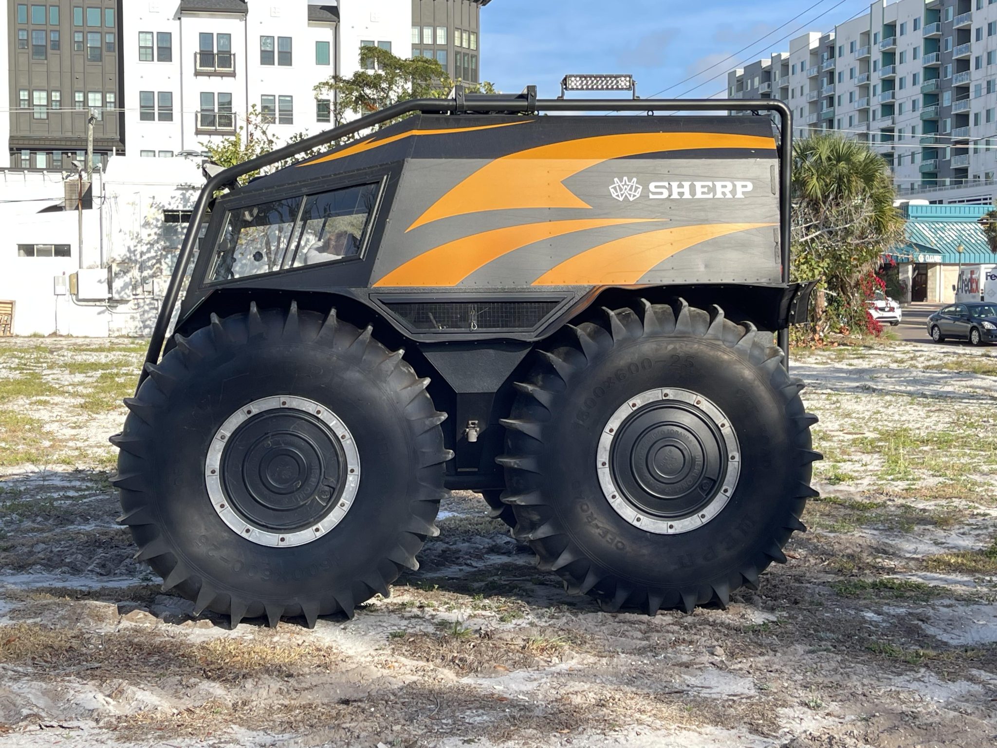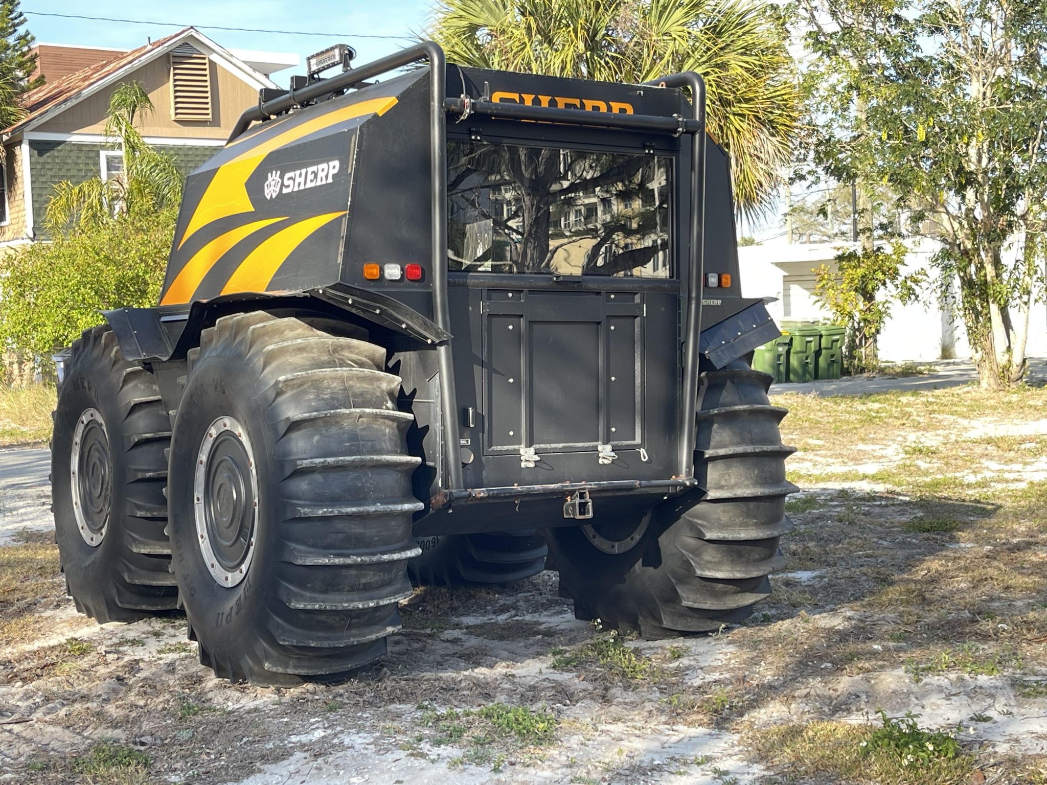 Silver-finished 25″ wheels are wrapped in 1600×600-25 WEPN low-pressure tires that feature paddle treads and provide buoyancy and propulsion on water. The setup provides two feet of ground clearance with the ability to climb or descend a 30-degree grade. The vehicle is equipped with a central tire inflation system as well as auxiliary fuel containers located in the center of each wheel.