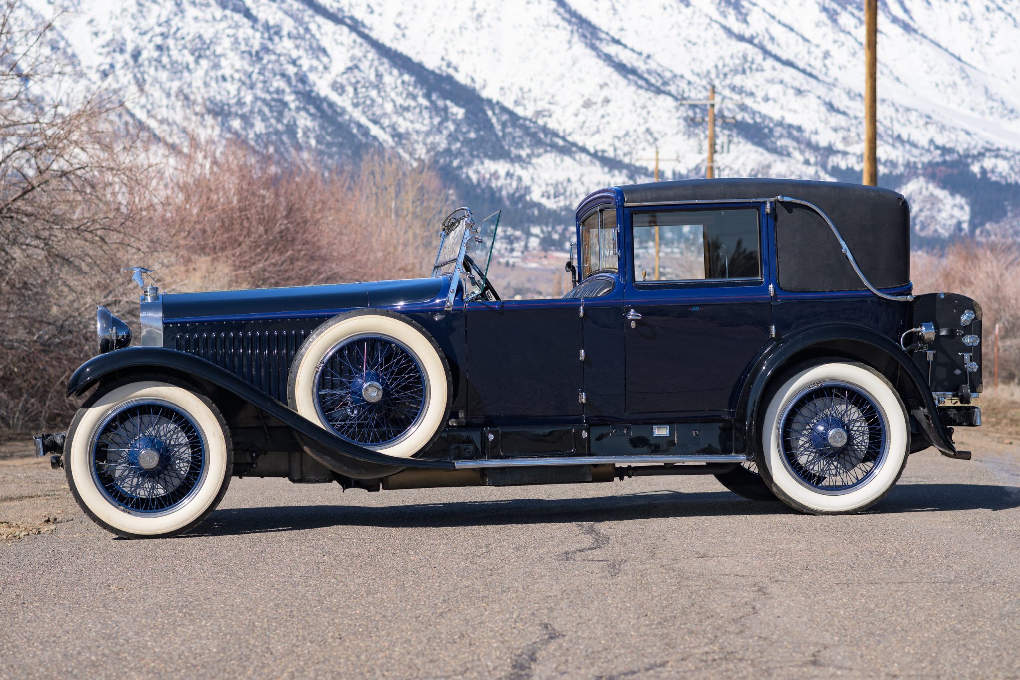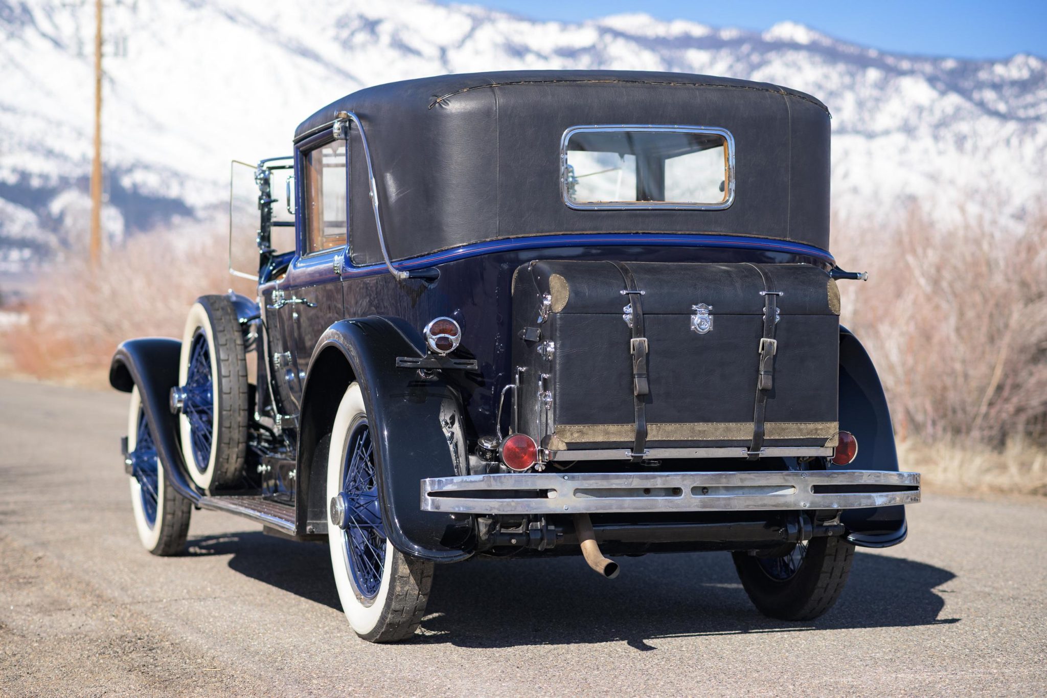This four-door town car was refinished during the 1970s refurbishment in its current color combination of dark blue with royal blue upper accents and black fenders. Red and light blue pinstriping along the shoulder lines is said to have been applied by Lyle Fisk. Imperfections in the finish including cracking in the paint along the lower edge of the driver’s door are shown in the photo gallery below, and various touchups are said to have been blended in under current family ownership. Exterior features include rear-hinged doors, a fabric-lined roof with bright landau bars, Marchal headlights, ring-style rear door handles, a stork radiator mascot, and pale blue and red monograms on each rear door.