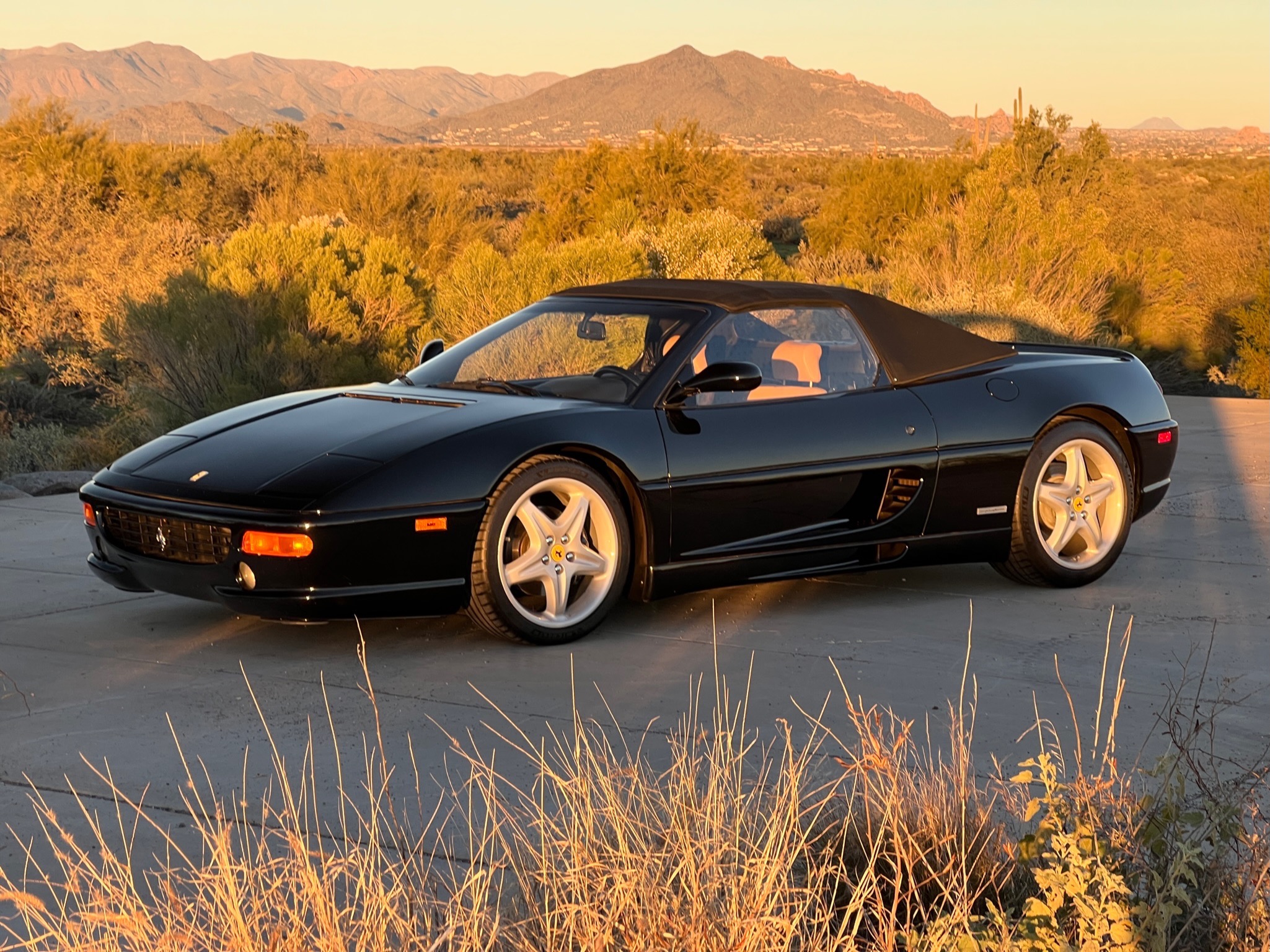 The 18″ five-spoke magnesium wheels show blemishes and have been fitted with Michelin Pilot Sport tires. Ferrari-branded brake calipers are mounted over ventilated discs at each corner.