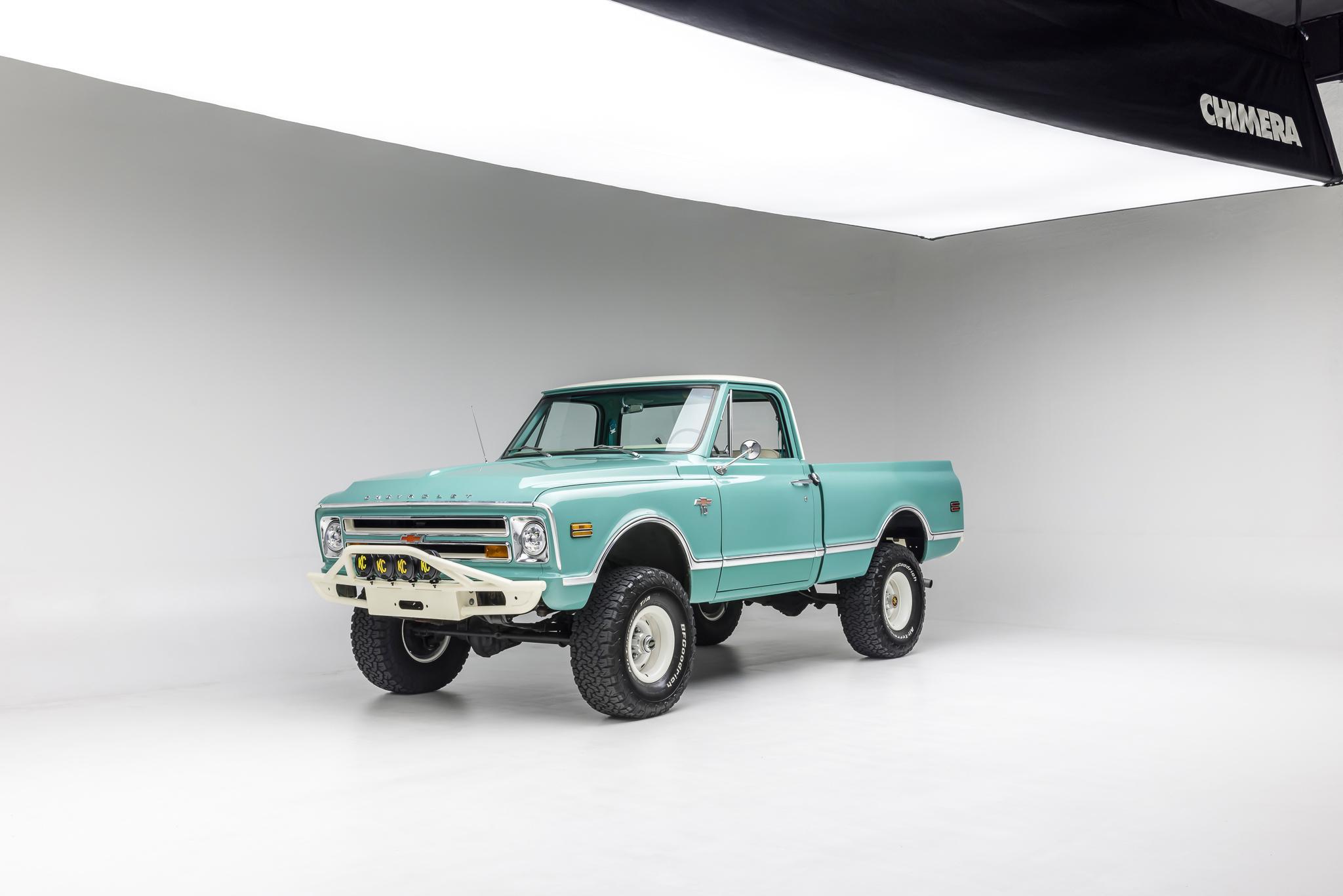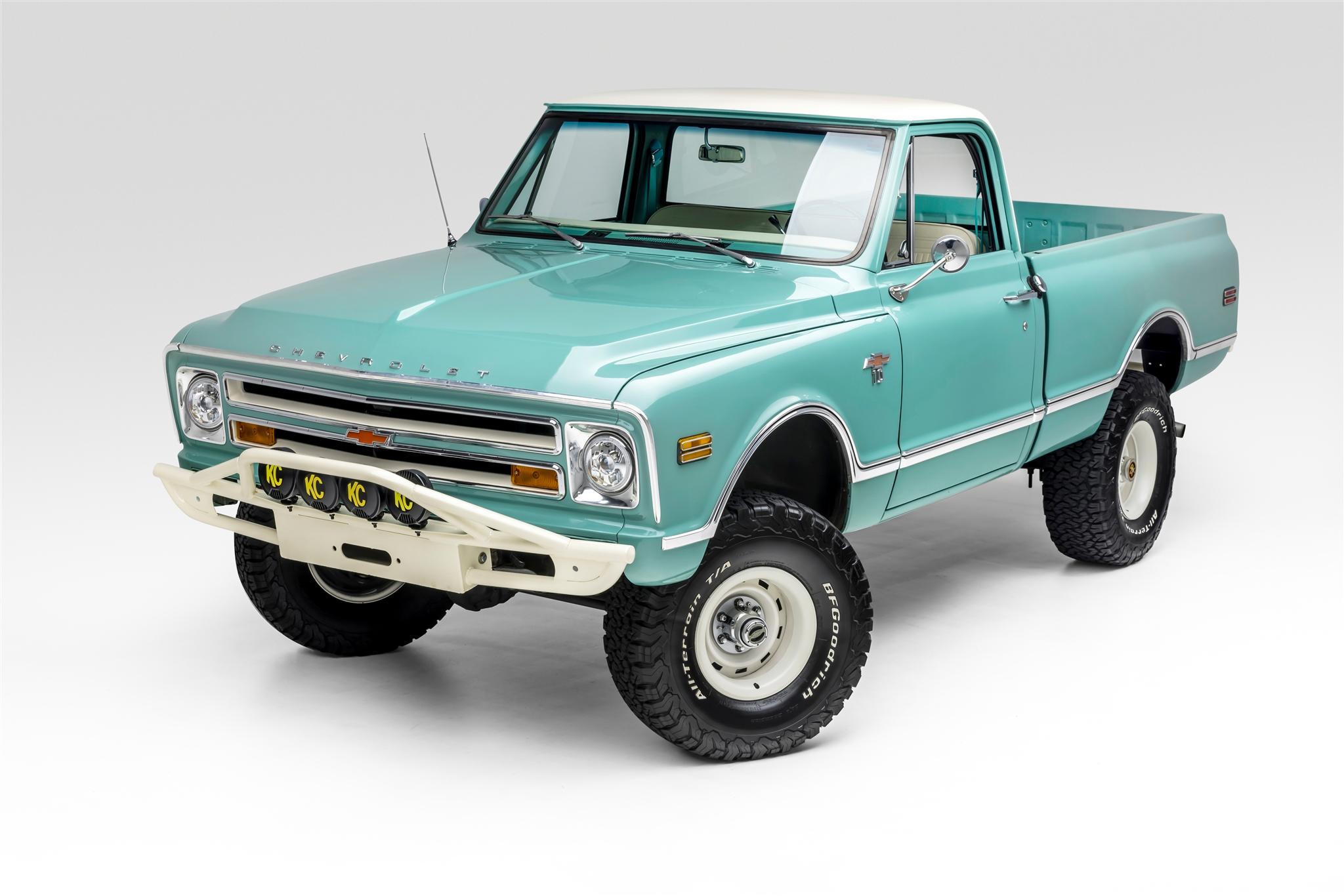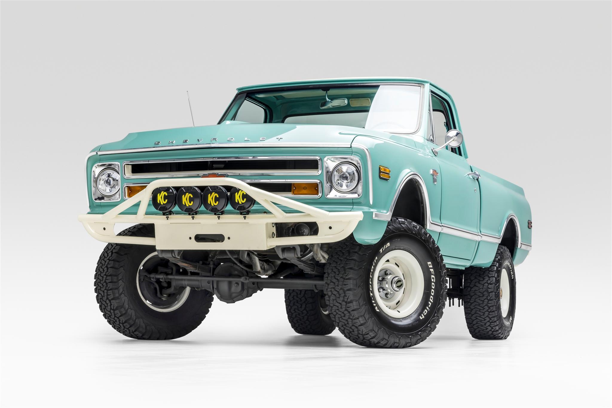 Powder-coated white 15″ rally wheels are mounted with 33×12.5″ BFGoodrich All-Terrain T/A K02 tires. The truck rides on a lifted suspension, and stopping power is provided by front disc and rear drum brakes. The seller states that a brake service was performed in preparation for the sale.
