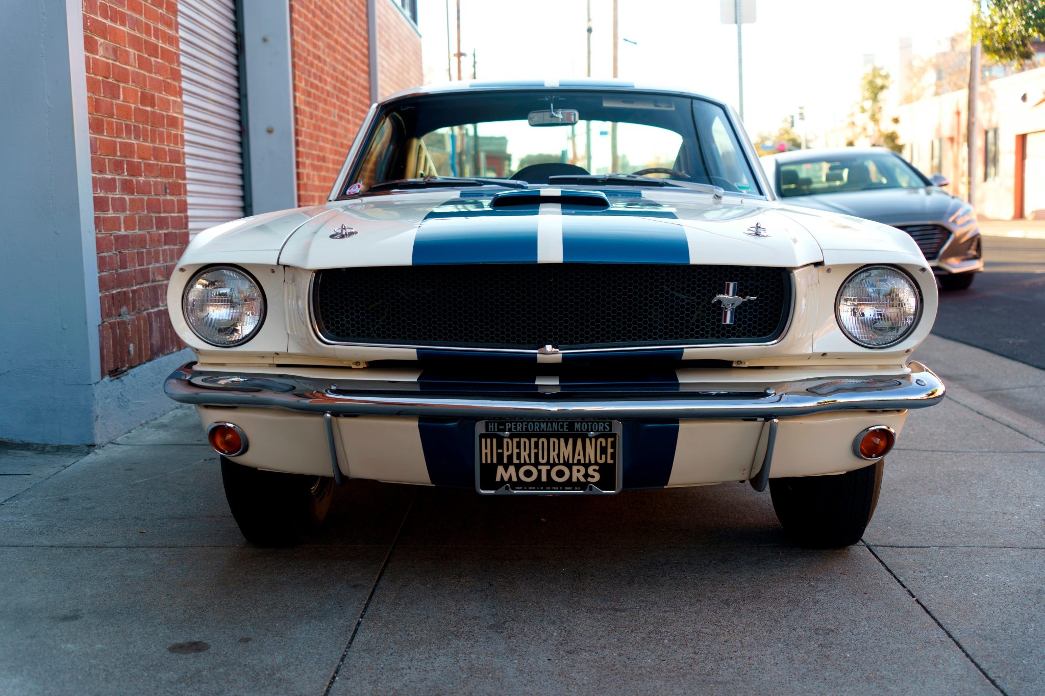 All 1965 GT350s were finished in Wimbledon White with Guardsman Blue rocker-panel stripes with dealer-added center stripes on select cars. This example was repainted during a refurbishment in the late-1990s, and Guardsman Blue Le Mans stripes were added. Additional work included replacing the glass, seals, and bumpers with Ford new old stock components. Features include a steel-framed “porthole” fiberglass hood with a functional scoop and quick-release pins, a mesh grille with an offset running-horse logo, and sail-panel louvers.
