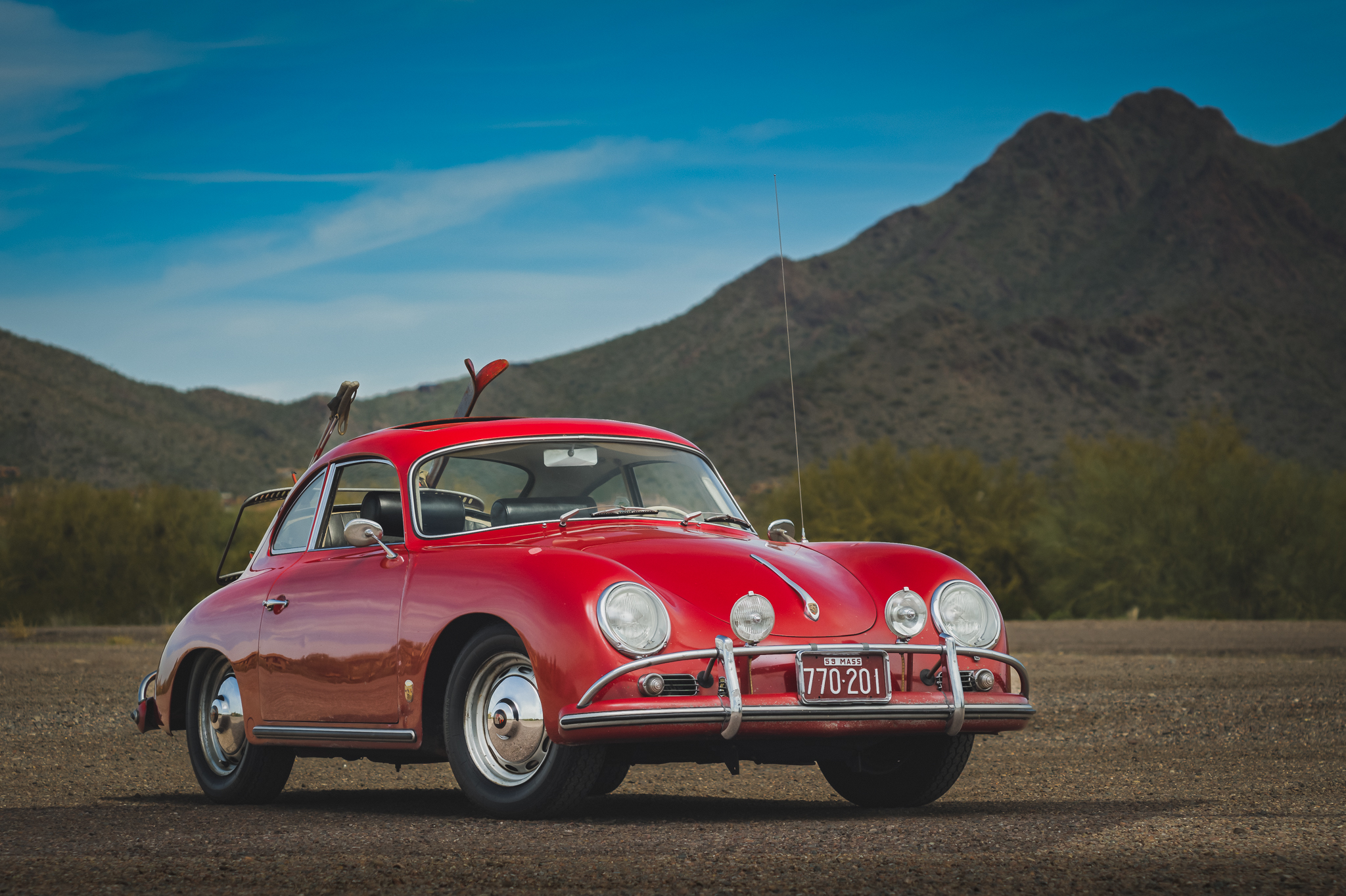 Painted 15×4.5″ Lemmerz steel wheels wear Porsche crest hubcaps and are mounted with Vredestein Sprint Classic tires. A wide-five spare wheel is mounted in the front trunk. Braking is handled by drums at all four corners.