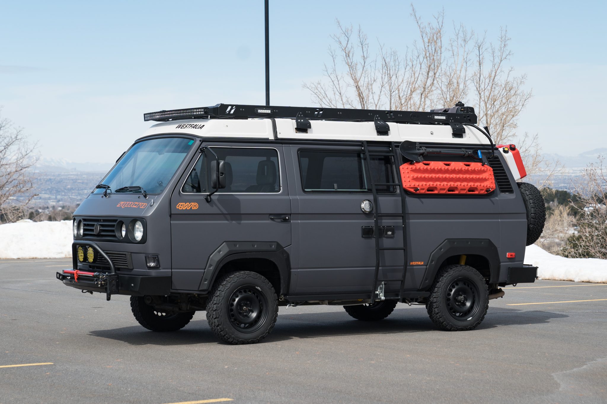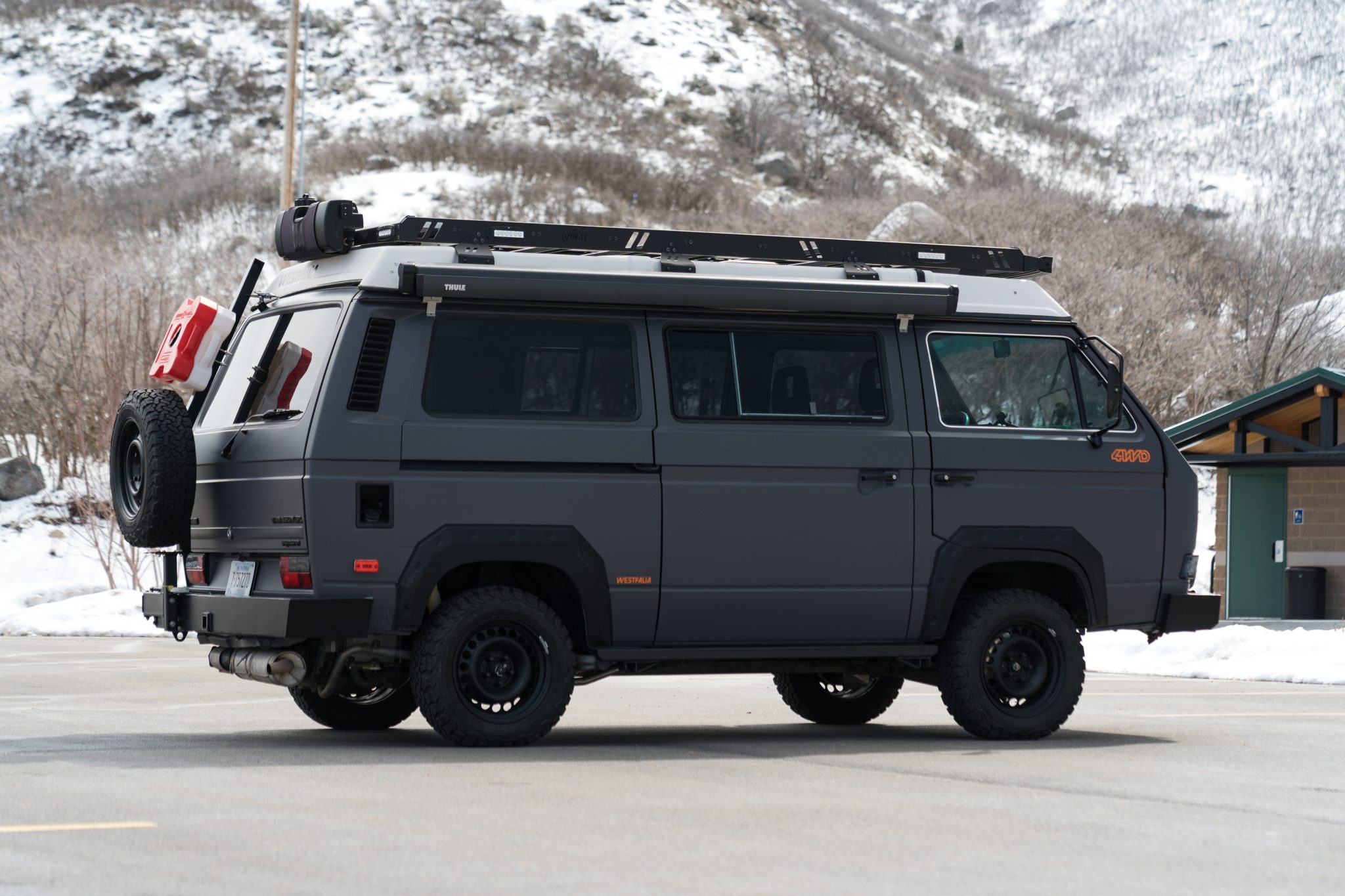 Black-finished 16″ steel wheels are mounted with LT215/65 BFGoodrich All-Terrain T/A K02 tires, and a matching spare is mounted on the rear swing-away carrier. Stopping power is provided by front disc and rear drum brakes. The seller states a GoWesty front brake kit has been installed, and the van is fitted with Old Man Emu suspension components.