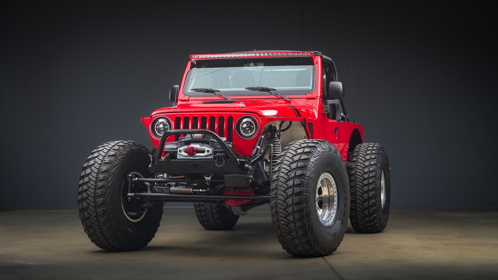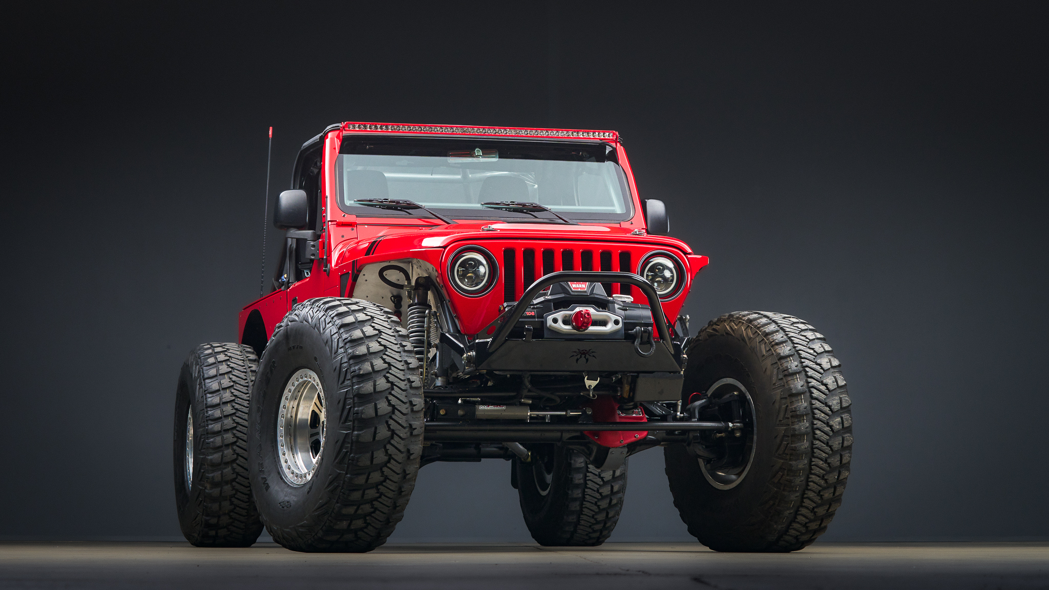 Beadlock 17″ Raceline wheels are mounted with Goodyear Wrangler MT/R tires sized 42×14.5″. Braking is handled by Stoptech calipers over slotted rotors. The vehicle utilizes a PSC steering box with PSC Ram assist. The suspension is fitted with the following equipment:
