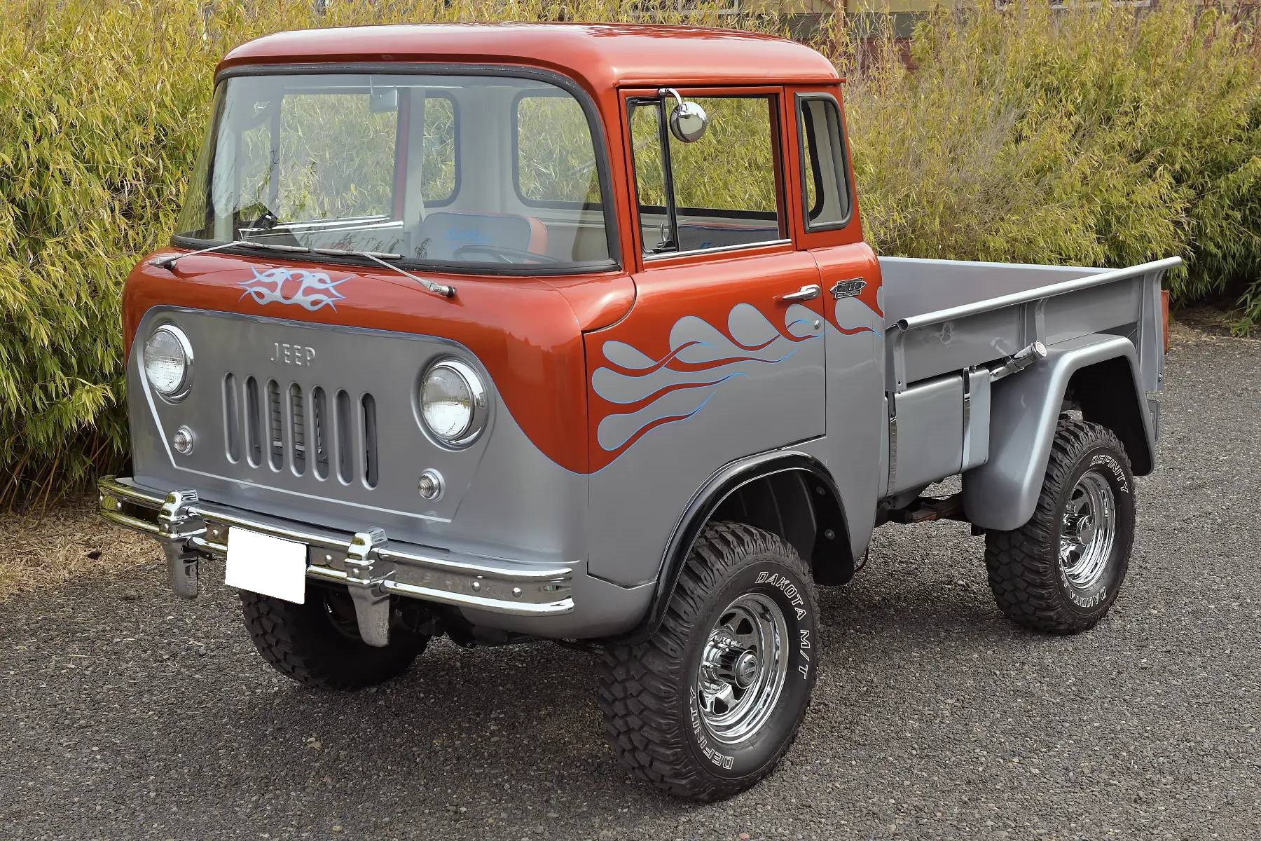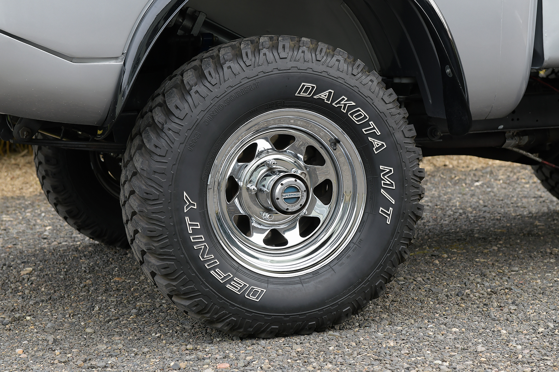 Chrome-finished U.S. Wheel 15″ steel wheels are mounted with 31×10.5″ Dakota M/T Definity tires. The truck is equipped with manually locking front hubs, and front disc brakes were installed during the refurbishment along with a Wilwood brake master cylinder.