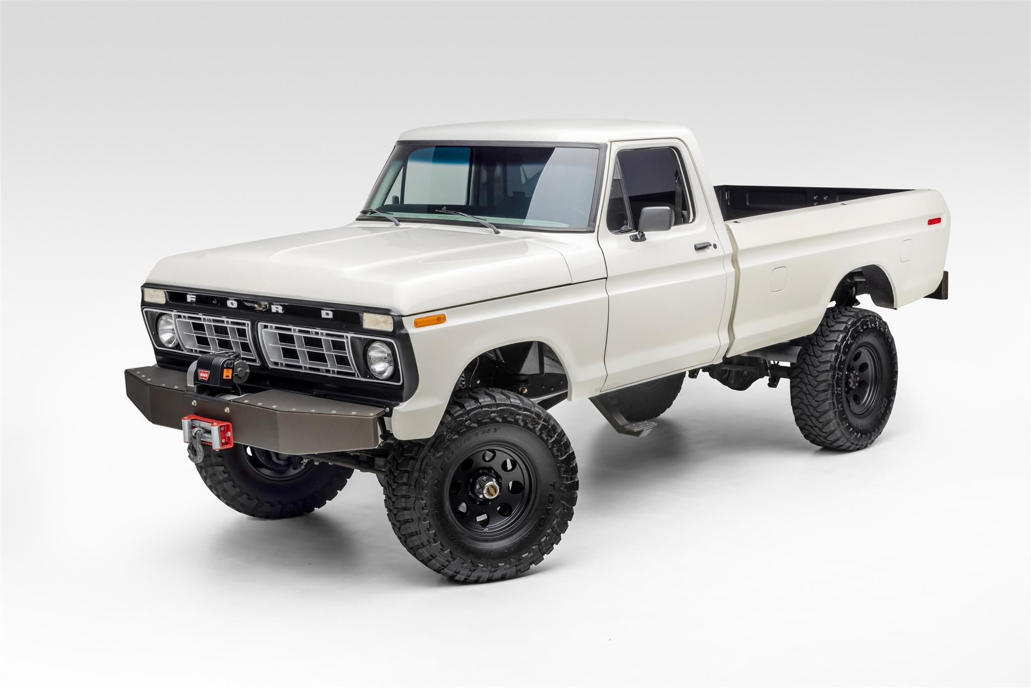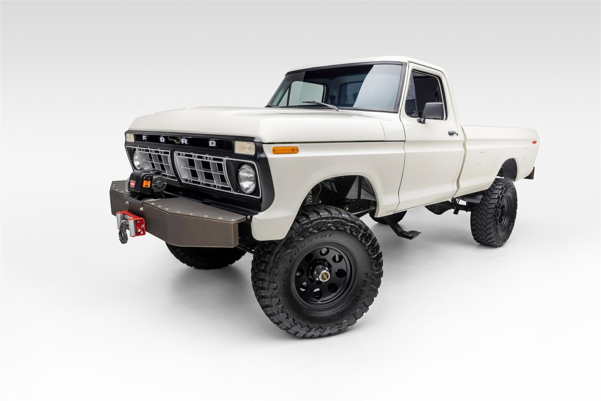 Black 18″ wheels are wrapped in 38×12.5″ Toyo Open Country M/T tires. Work completed as part of the refurbishment reportedly included installing power-assisted four-wheel disc brakes and a suspension lift with Fox shocks along with replacing the power steering box. The front axle is equipped with manually locking hubs.