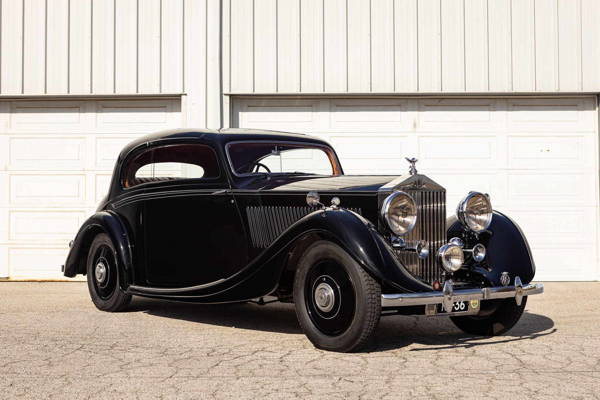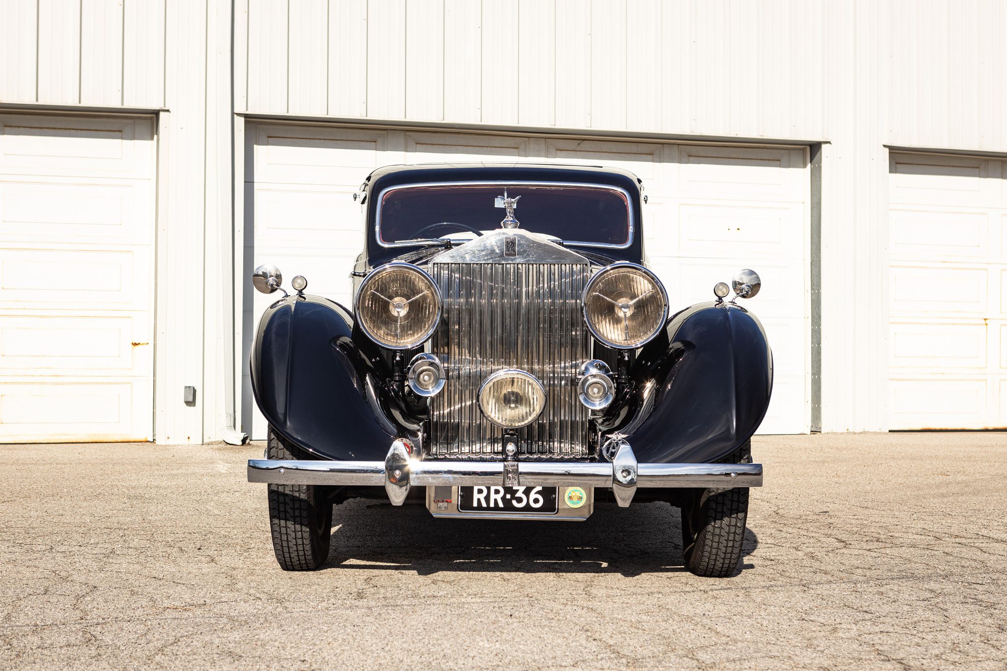 This example’s pillarless closed-roof coachwork was supplied by J. Gurney Nutting in Chelsea, London, and was originally finished two shades of gray. The body was refinished in its current shade of black during the early-2000s refurbishment, which is also said to have included sheet metal and wood frame repairs. Features include rear-hinged doors, a louvered centrally hinged hood, a sliding sunroof, thermostatically controlled grille shutters, fender-mounted side mirrors, a central Lucas fog light, and a Spirit of Ecstasy radiator mascot.