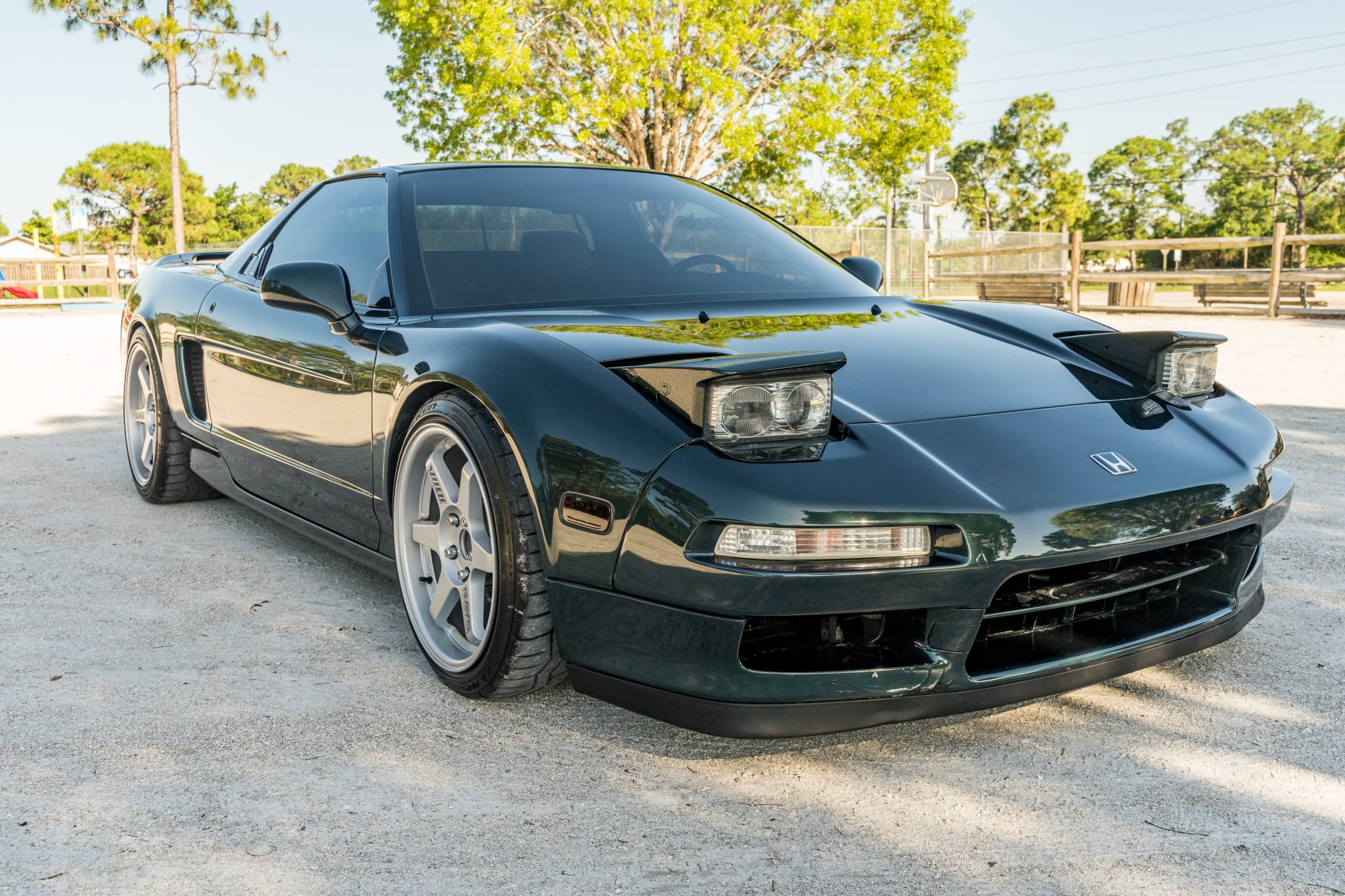 Silver 17″ and 18″ aftermarket wheels are mounted with Fallen Azenis RT615 tires measuring 215/40 up front and 265/35 in the rear. The car has been fitted with aftermarket adjustable coilovers equipped with front air cups that are controlled via an VIVAIR onboard air compressor mounted under the front hood. A four-wheel big brake hit has been installed and utilizes NSX-branded calipers over two-piece rotors at each corner.