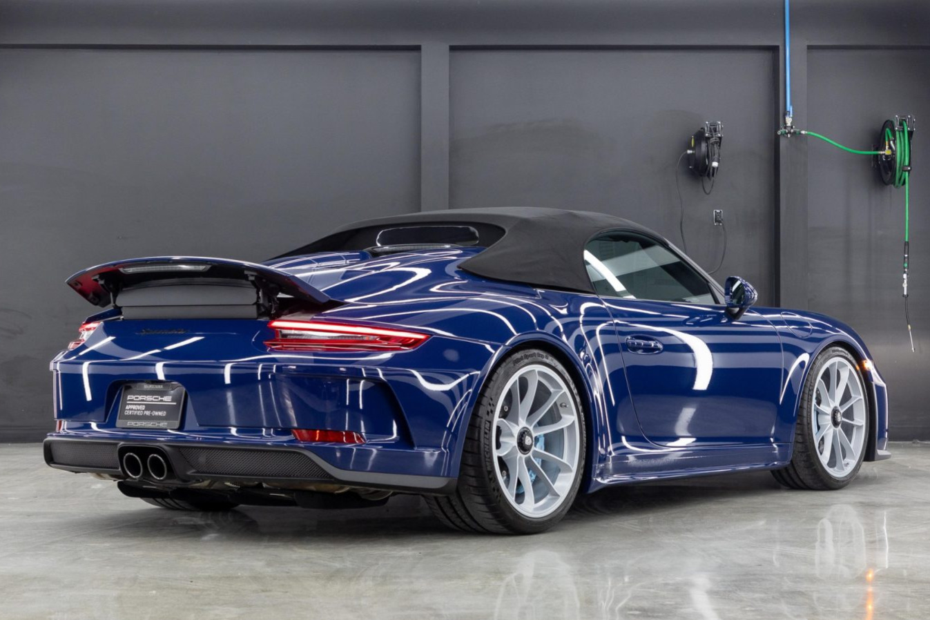 Satin Aluminum-finished 20″ GT3 center-lock alloy wheels wheels are mounted with Michelin Pilot Sport Cup 2 tires. Braking is handled by four-wheel cross-drilled Porsche Ceramic Composite Brakes with Porsche-branded calipers that have been repainted in their current shade of blue. Porsche Active Suspension Management (PASM), Porsche Stability Management (PSM), and rear-axle steering were standard on the Speedster. The rear tires were replaced in April 2022.