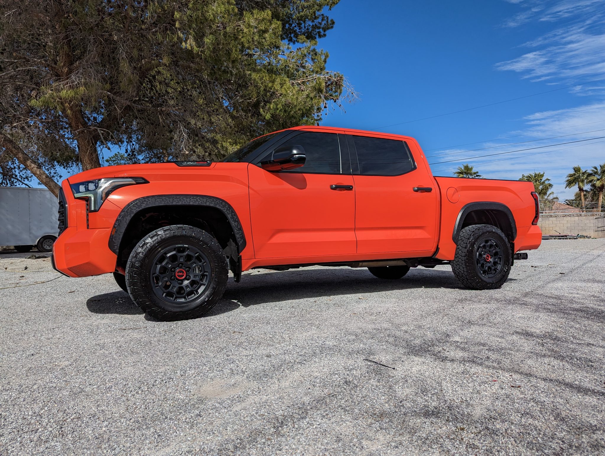 TRD Pro 18″ forged matte-black BBS wheels are wrapped in 285/65 Toyo Open Country A/T tires. The truck rides on double-wishbone front and coil-spring multi-link rear suspension, and TRD Pro models came with Fox 2.5-inch internal-bypass coilovers and remote-reservoir rear shocks. The four-wheel disc brakes have ventilated rotors at all four corners.