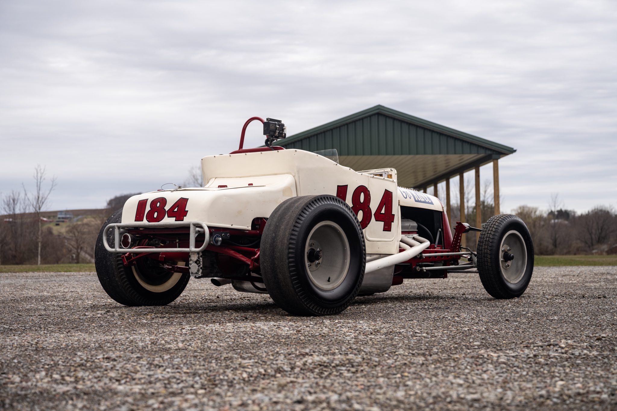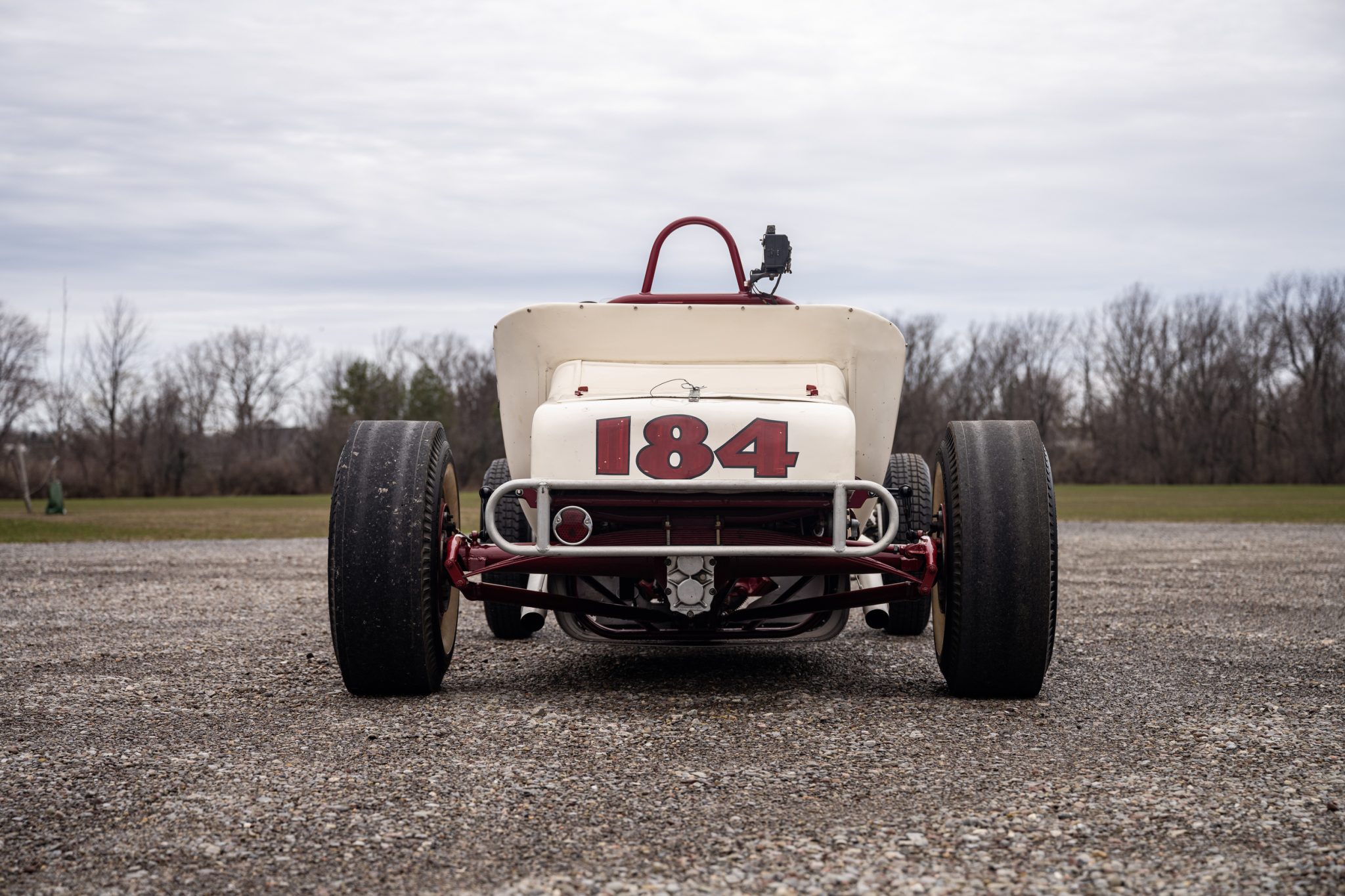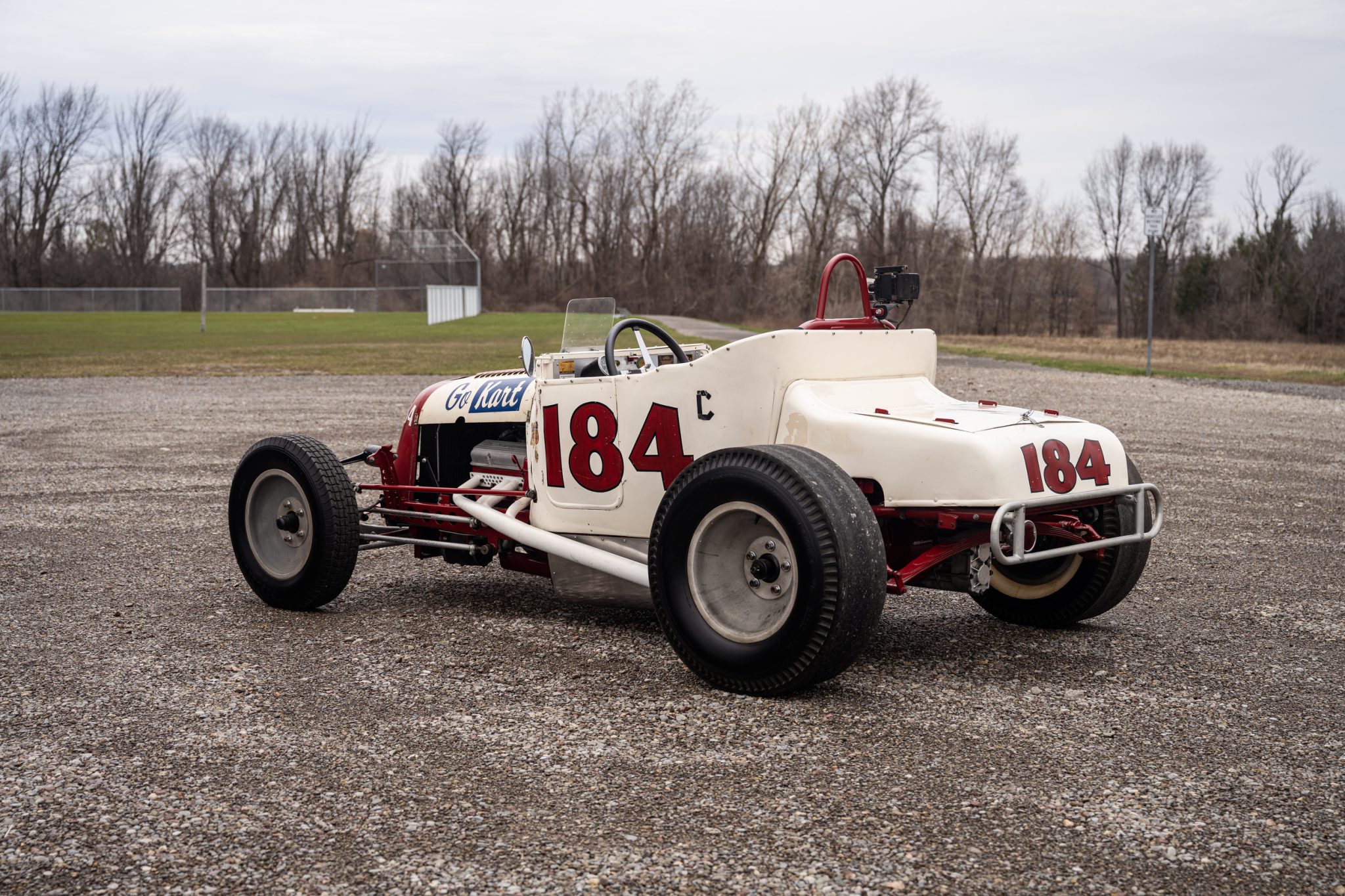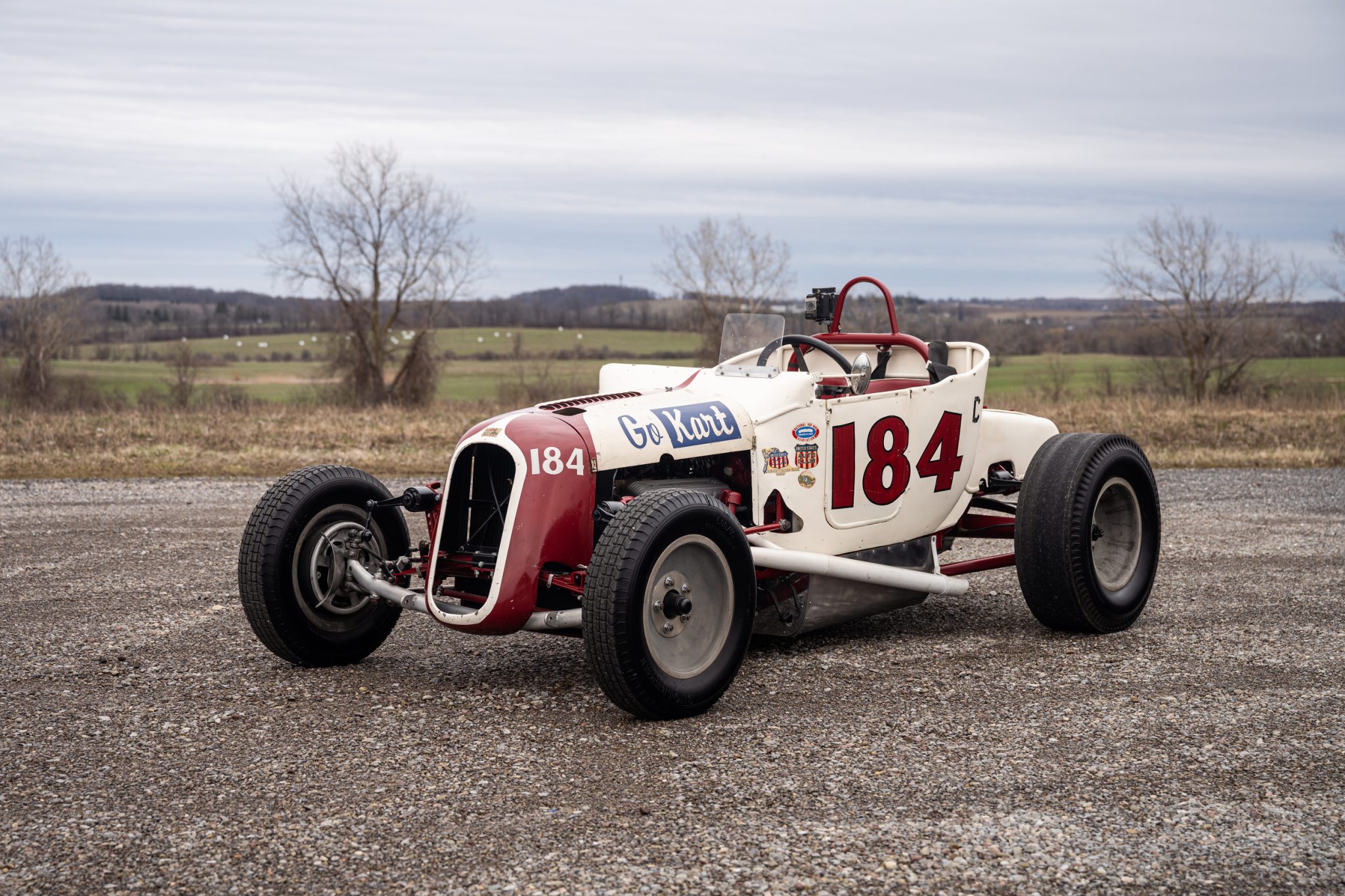 The body is finished in white with a red nose accent, painted red and black numbers along each side and the rear of the turtle deck, and blue “Go Kart” script on each side of the louvered hood. Chips, cracks, and other wear in the finish can be seen in the photo gallery below along with various dents in the bodywork. Period decals have been retained on the cowl, as has a Go Kart Company sticker on the nose. The drilled late-1920s Model A frame was sandblasted and repainted in red during refurbishment work performed by Pete Chapouris after Brock Yates’s purchase of the car.