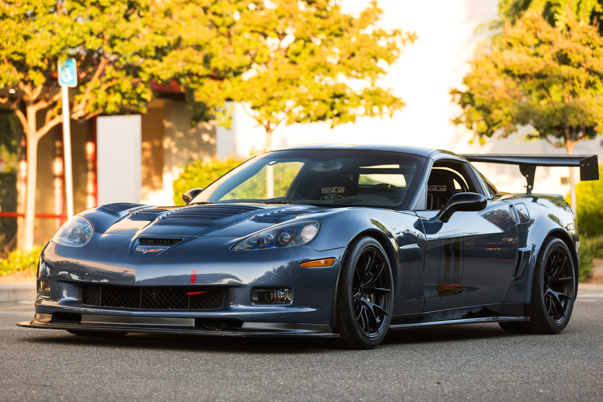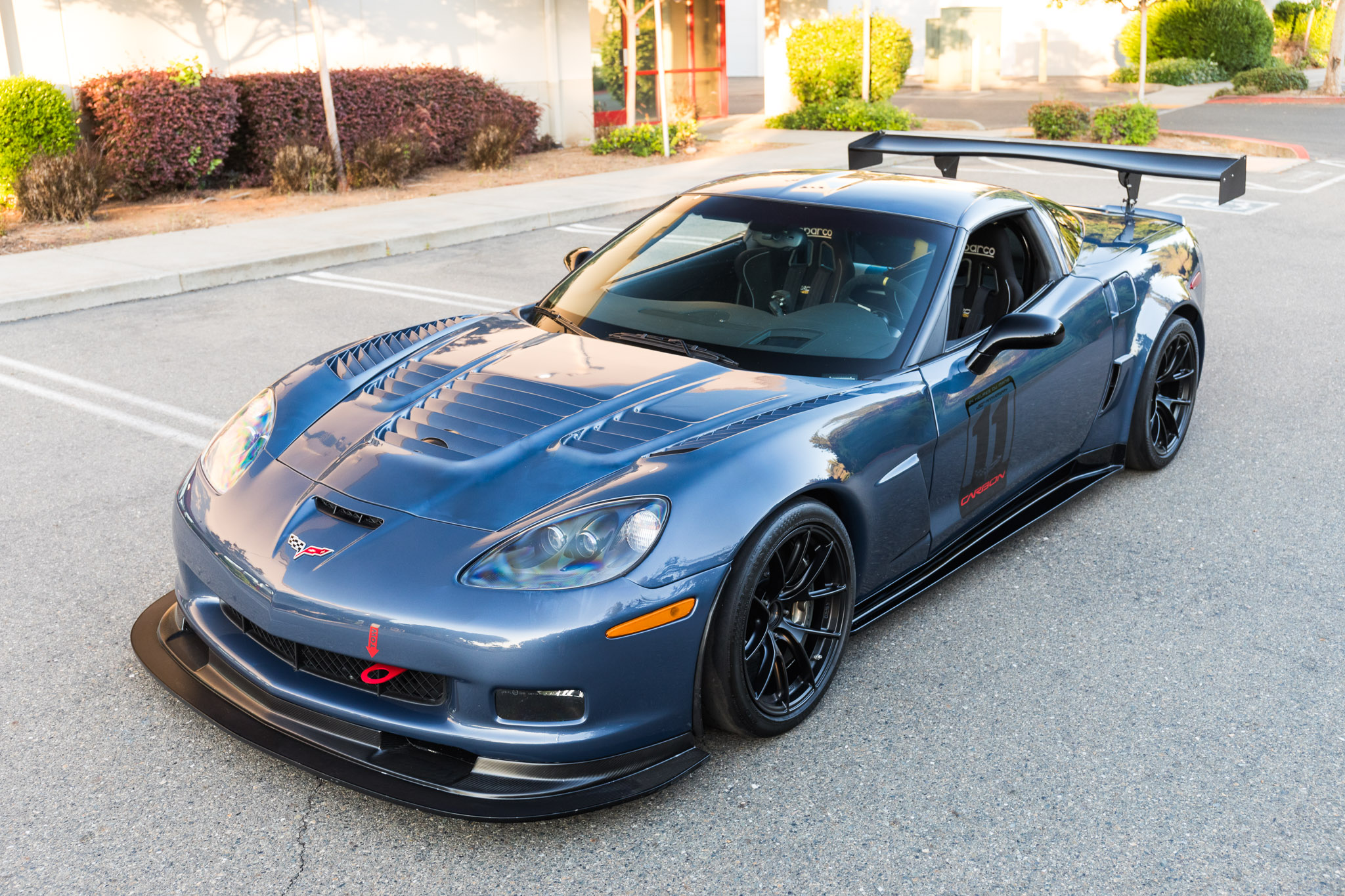 Forged aluminum 18″ Apex wheels are mounted with Hoosier R7 track tires measuring 295/30 up front and 335/30 out back. Suspension components include JRZ RS Pro coilovers with remote reservoirs, LG Motorsports billet aluminum drop spindles, mono ball control arm bushings, Baer tie rod ends, and LG sway bars. Stopping power is provided by four-wheel Brembo carbon-ceramic disc brakes with multi-piston Corvette-branded calipers and stainless steel brake lines.
