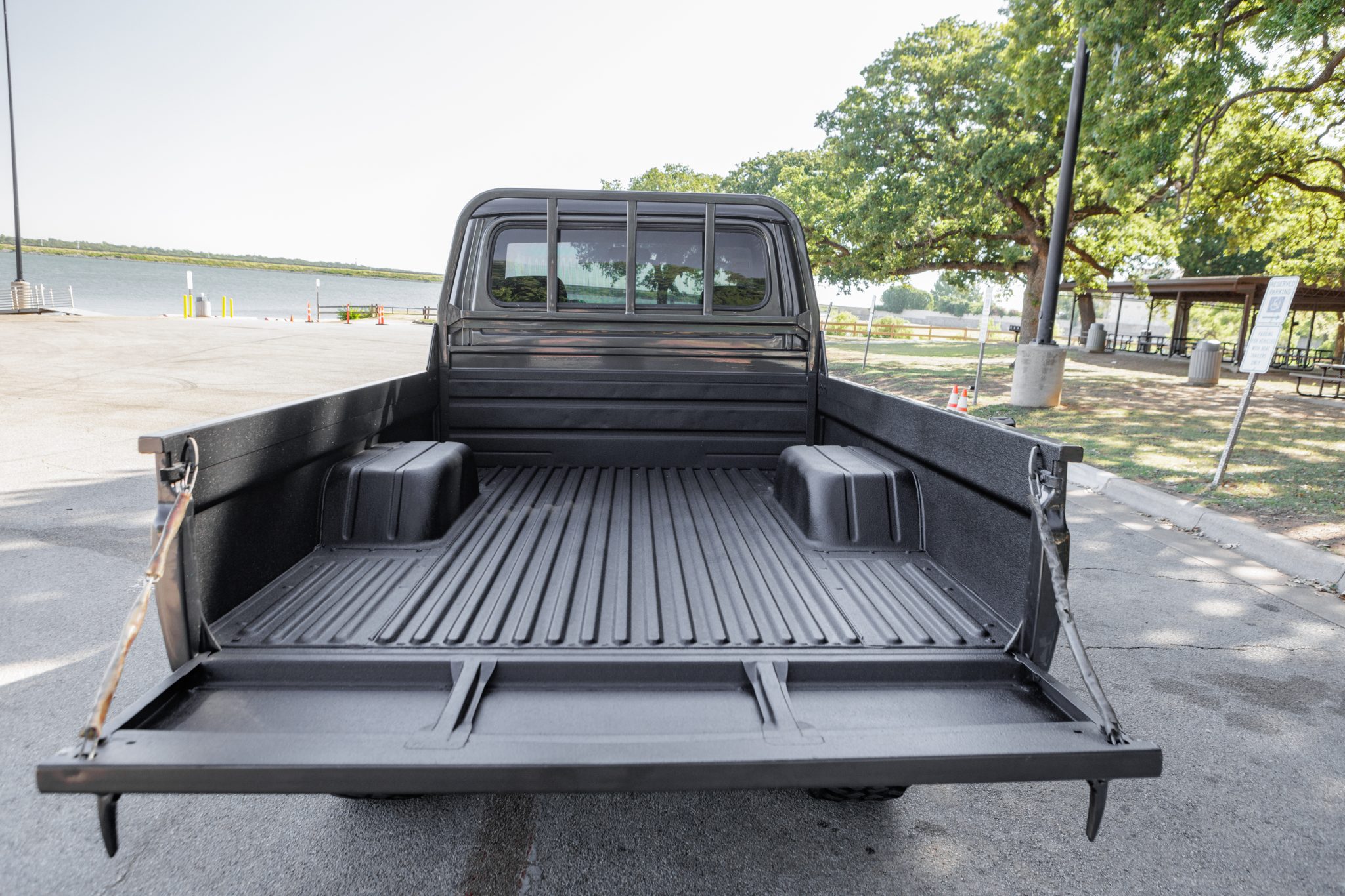Black-finished 17″ Fuel wheels are mounted with 315/70 Maxxis Razr MT tires that show 2014, 2017, and 2020 date codes. Braking is handled by four-wheel drums. The truck features manually lockable front hubs, and the suspension was reportedly modified by the selling dealer with a steering stabilizer, front shock tower brace, aftermarket spring hangers, front coilovers, and Profender shocks with remote reservoirs.