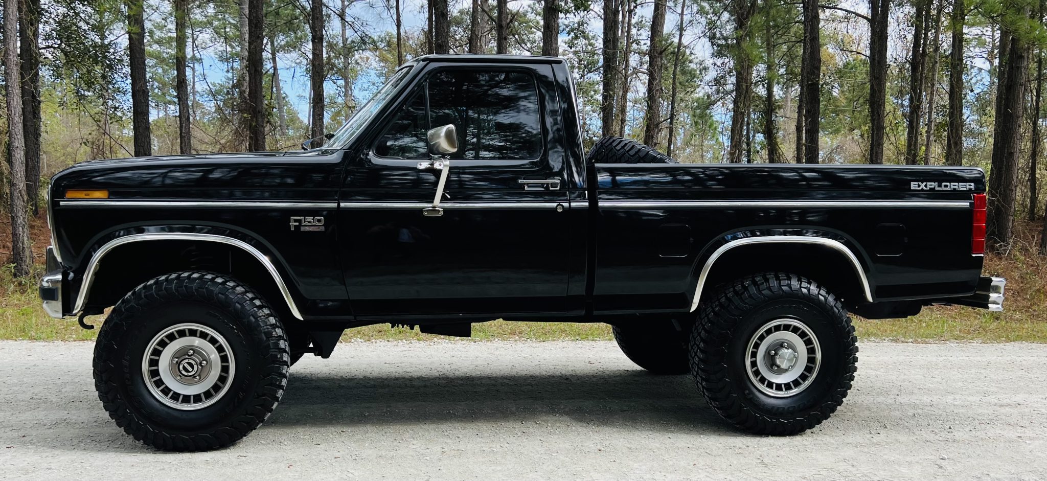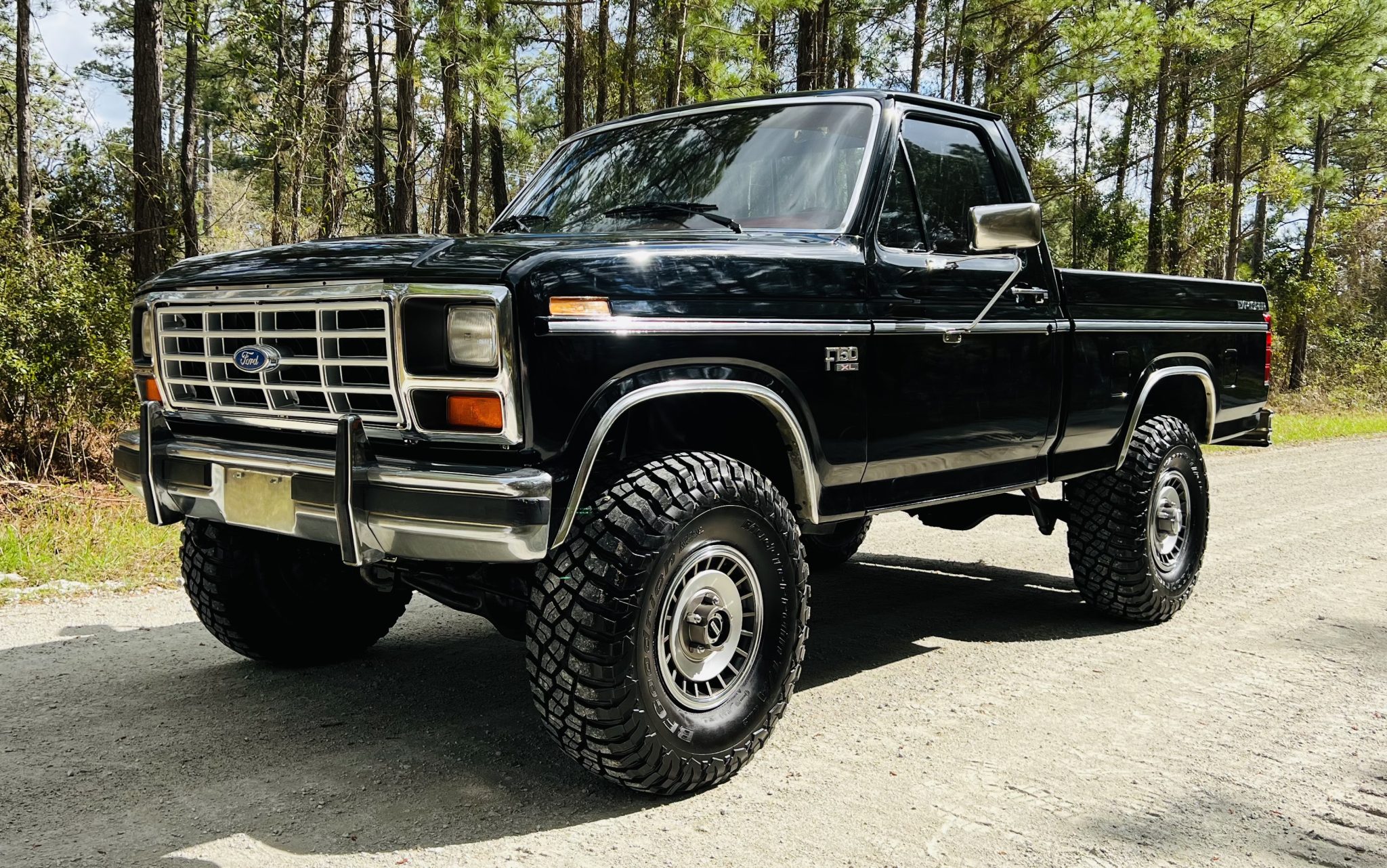 The 15″ wheels are wrapped in 35×12.50″ BFGoodrich Mud-Terrain KM3 tires, and a matching spare is mounted in the bed. The truck is equipped with power steering, a Rough Country steering stabilizer, and Warn manually locking front hubs. Braking is handled by power-assisted front discs and rear drums. The suspension is said to have been lifted 4″ over Rough Country shocks. The wheel bearings, camber sleeves, and brake pads and rotors have reportedly been replaced.