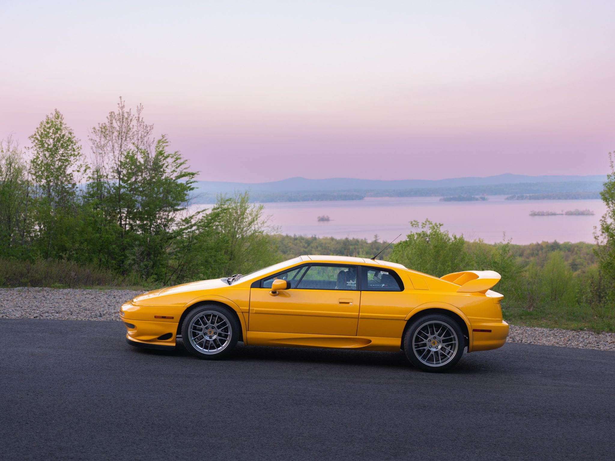 Staggered-width 17″ and 18″ alloy wheels feature Lotus-branded center caps and are mounted with Dunlop SP Sport tires measuring 235/40 up front and 285/85 out back. A non-matching spare wheel and jack are stored in the front trunk compartment. Stopping power is provided by ventilated cross-drilled rotors at all four corners, with Lotus-branded AP Racing calipers up front.