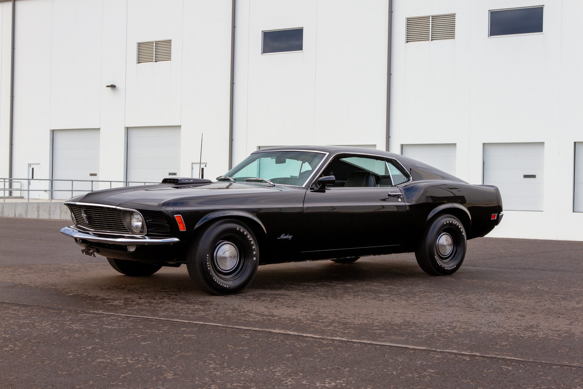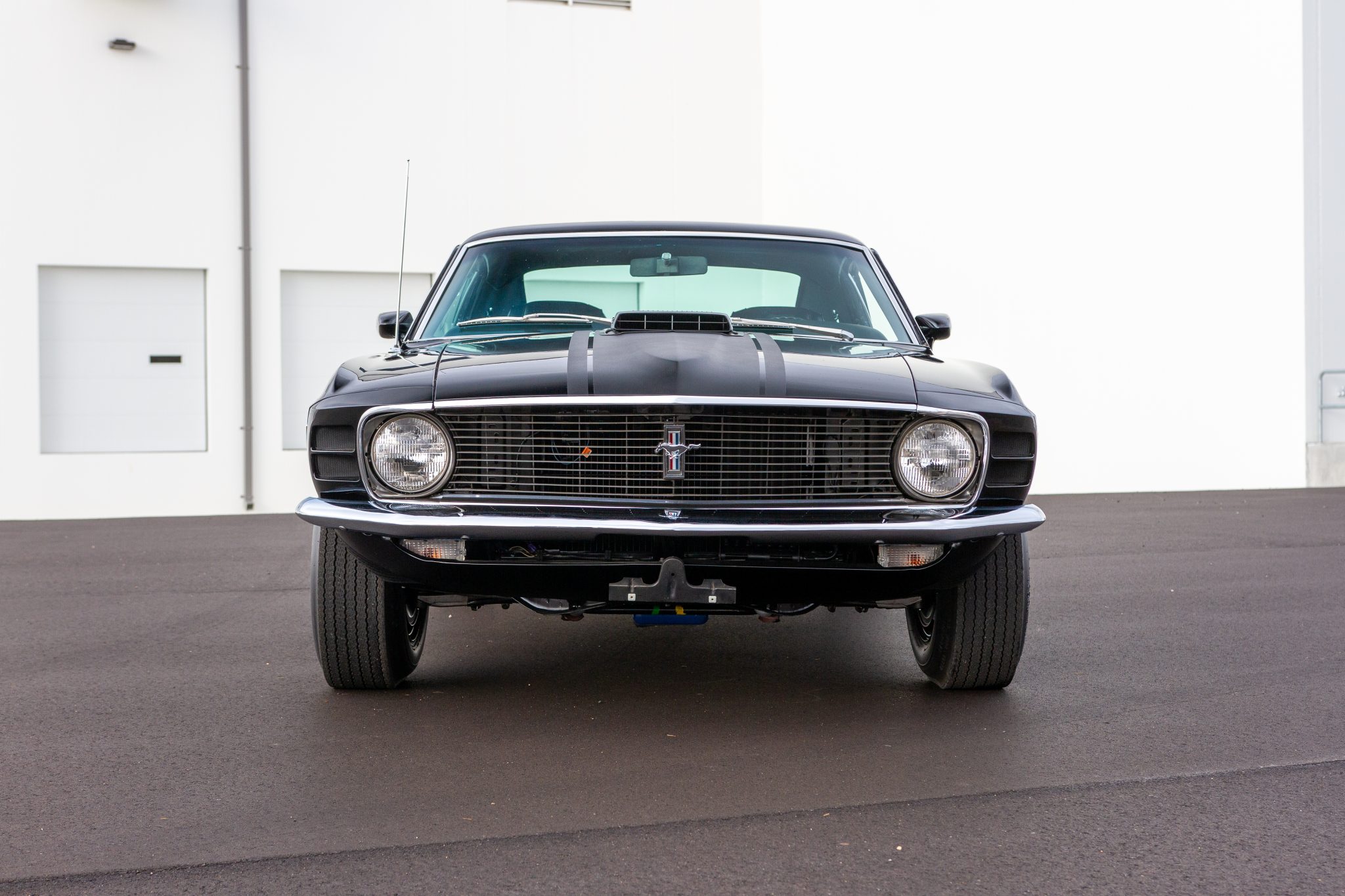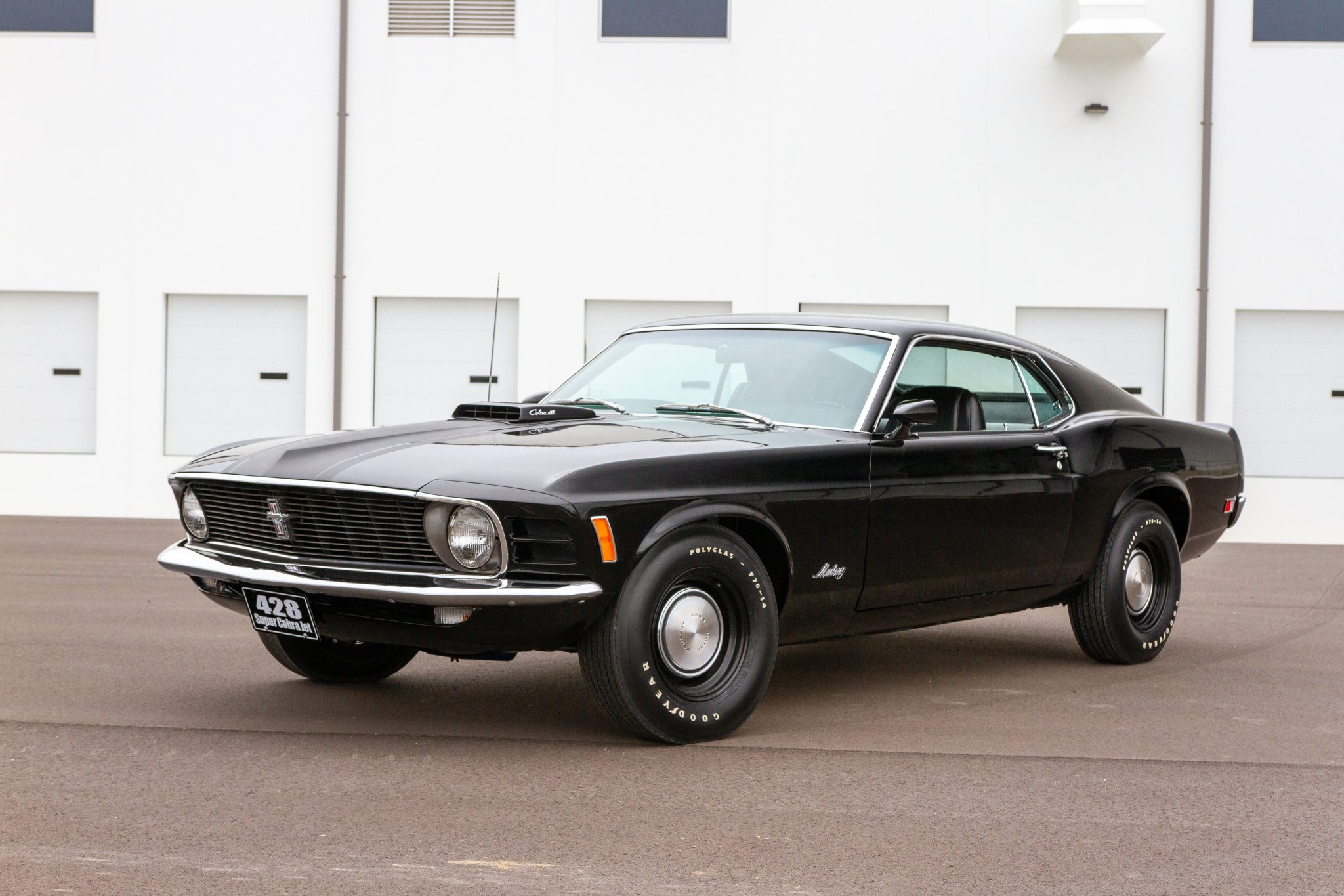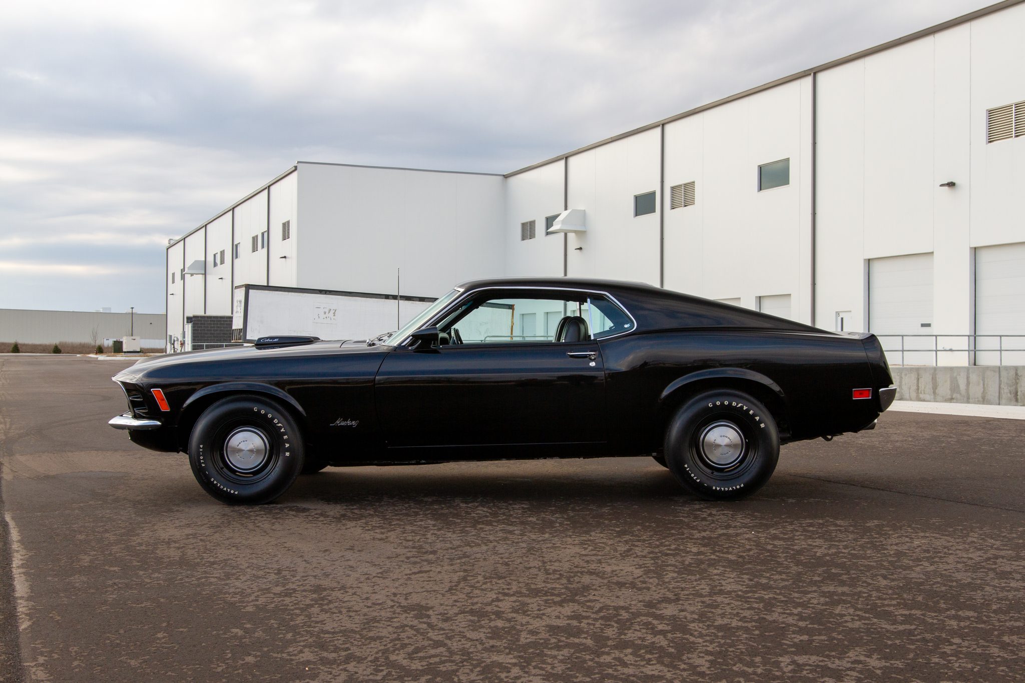 Color-matched 14″ steel wheels wear polished Ford Motor Company–branded hubcaps and are mounted with Goodyear Polyglas F70-14 white-letter tires. A matching spare wheel and tire are located inside the trunk, and photos showing the tire serial numbers and date codes are provided in the gallery. Braking is handled by power-assisted front discs and rear drums.