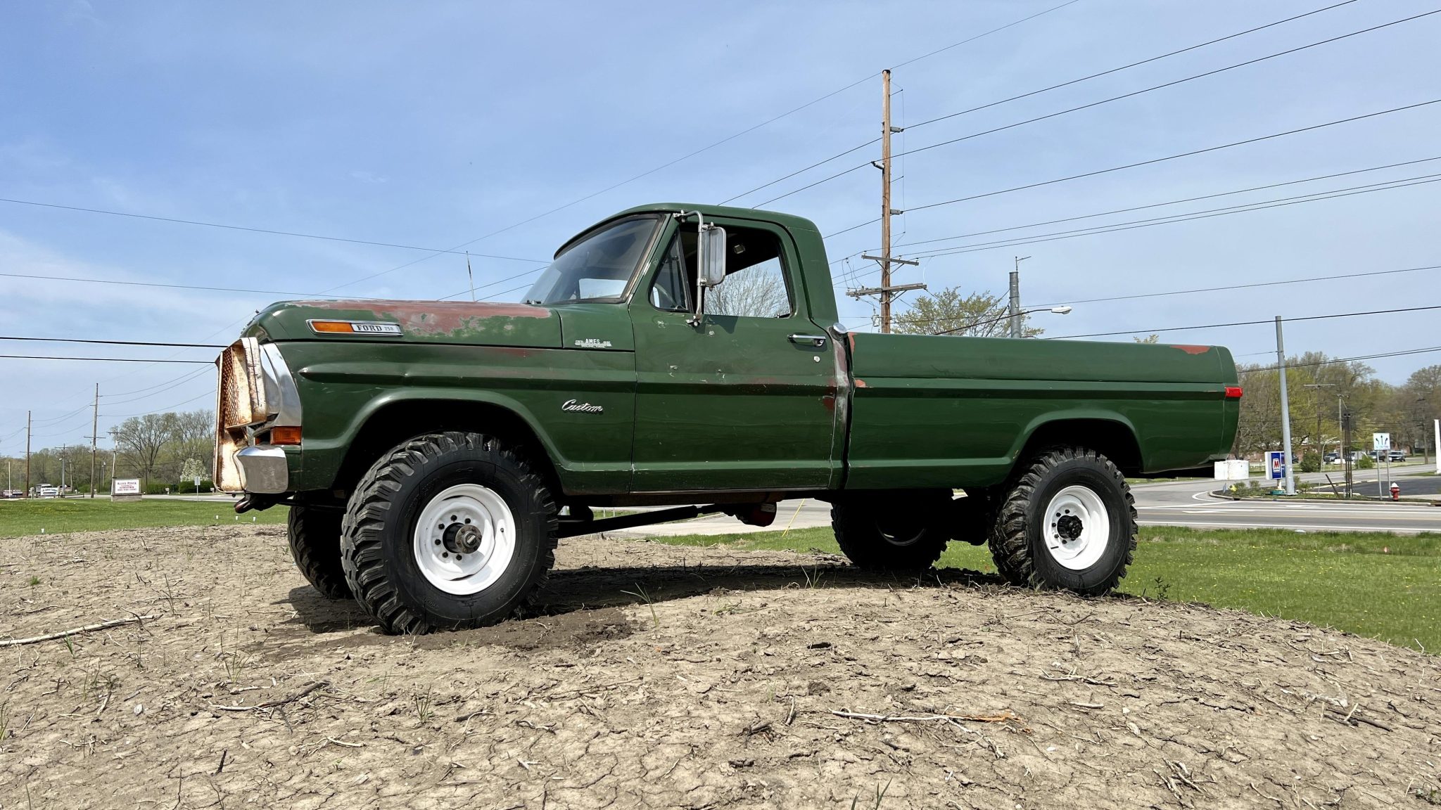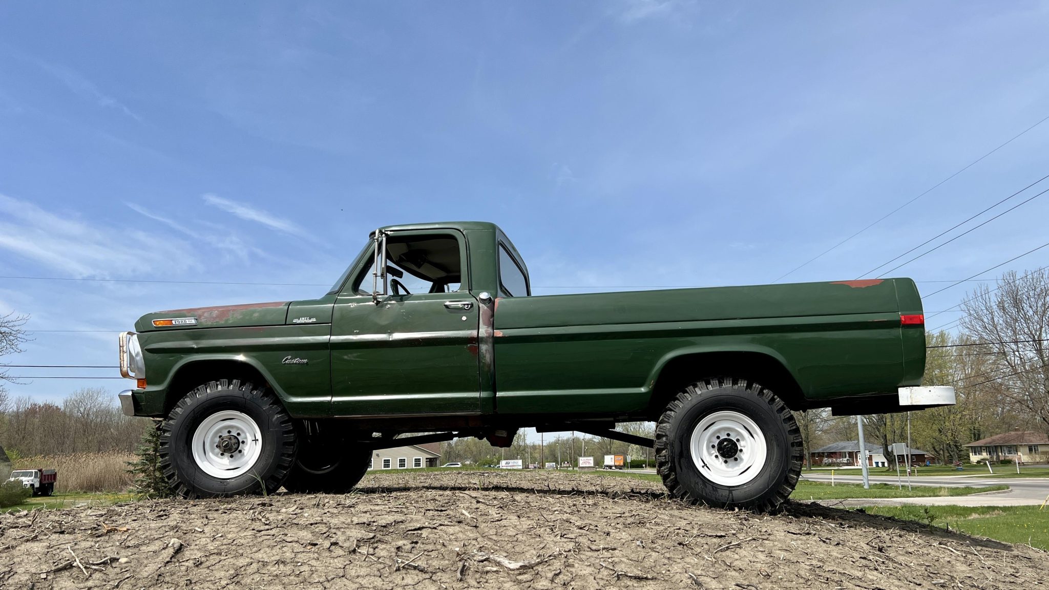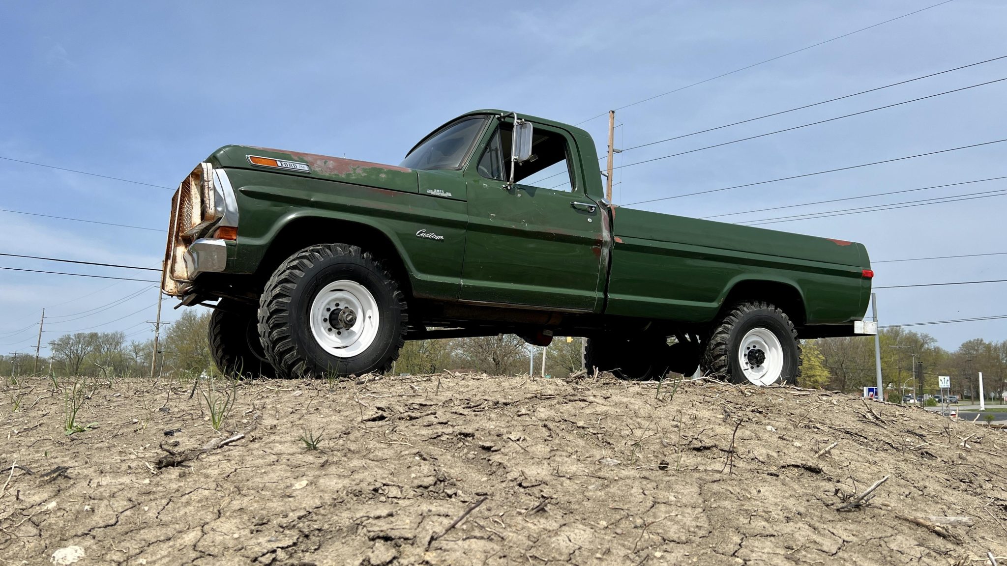 White-painted 16” steel wheels are mounted with 9.00-16 Power King Premium Traction tires, and a matching spare is stowed in the pickup bed. The truck is equipped with manually locking front hubs, Old Man Emu shocks, and a Rancho steering stabilizer.