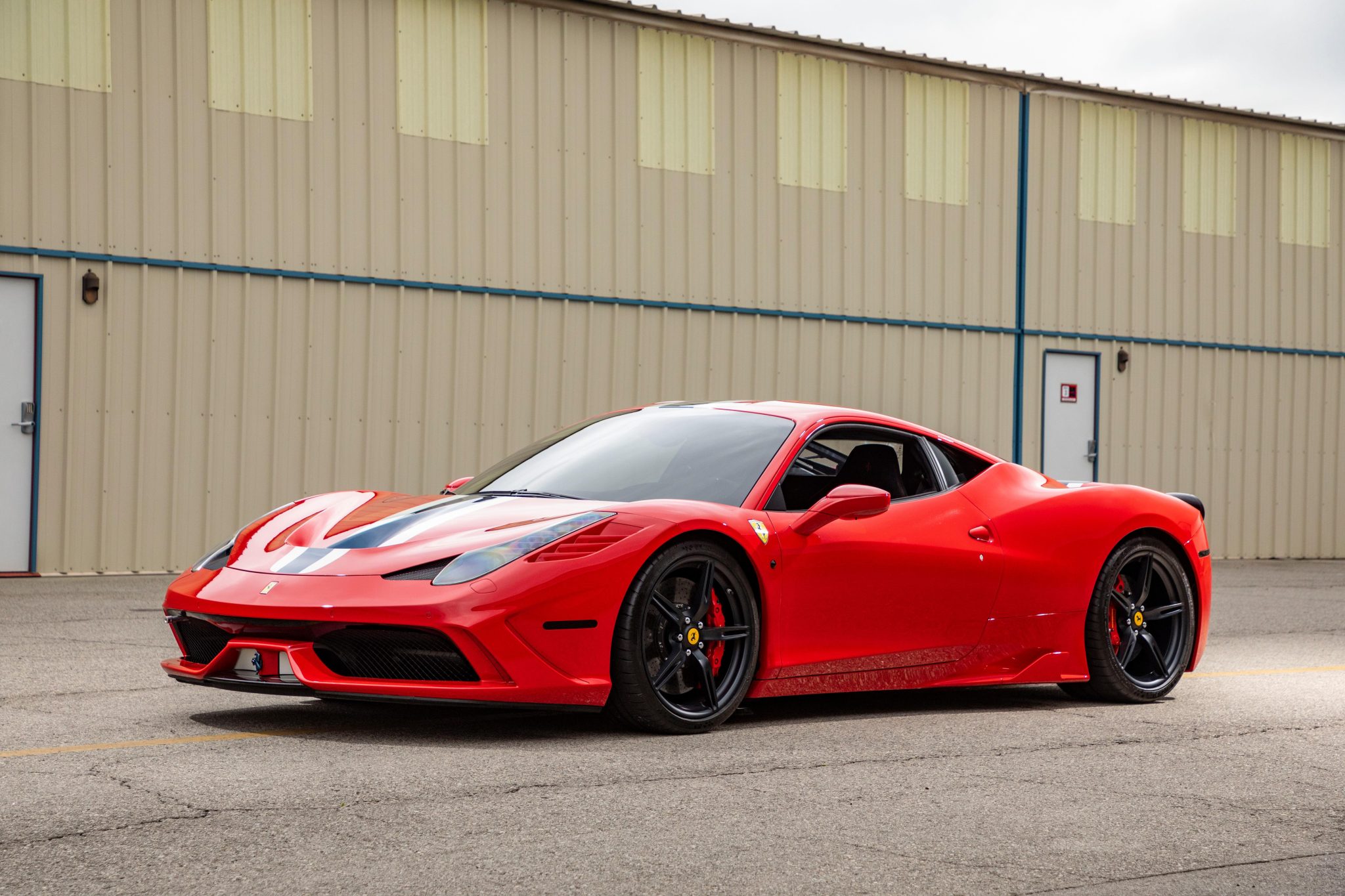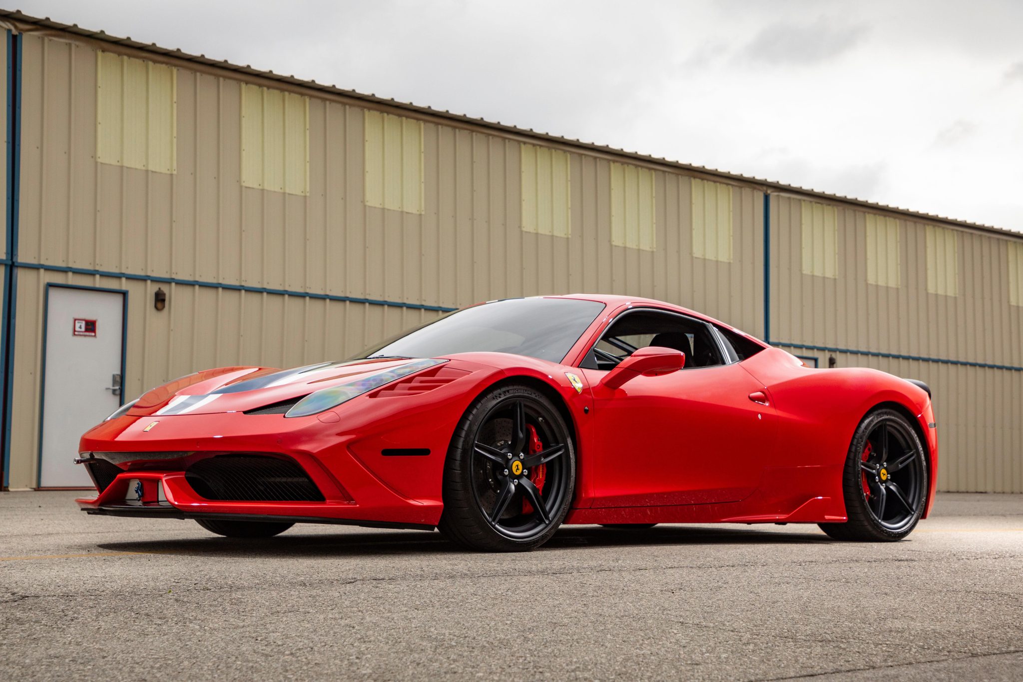 This example is finished in Corsa Red with optional North American Racing Team (NART) racing stripes and features adaptive xenon headlights, fog lights, Scuderia Ferrari fender shields, a parking camera, front and rear parking sensors, tinted glass, and LED taillights with smoked lenses. Clear paint-protection film has been applied to the bodywork, and the rear diffuser was repaired and repainted earlier this year. The seller notes some rock chips on the body along with scrapes inside one of the rear wheel wells