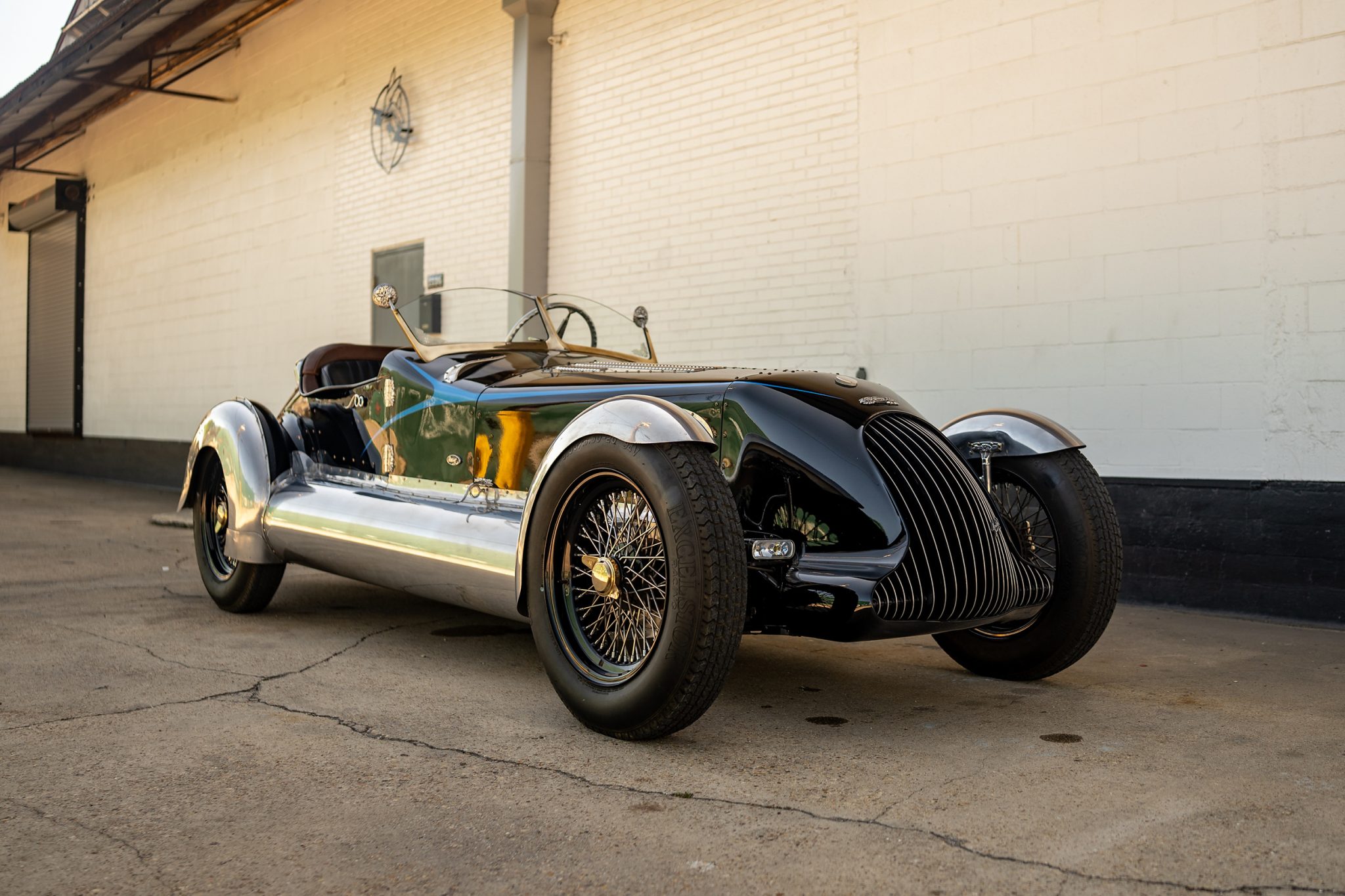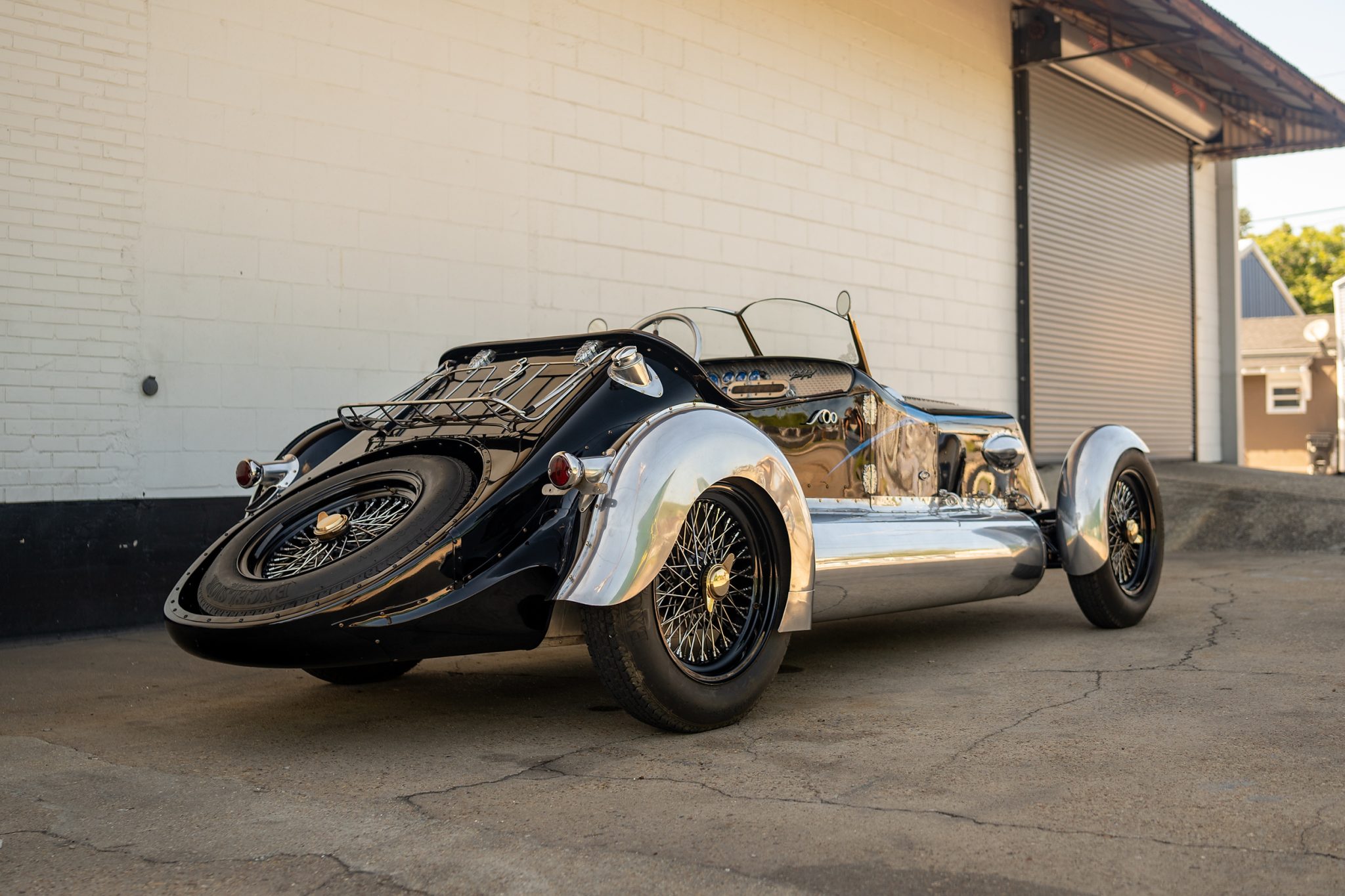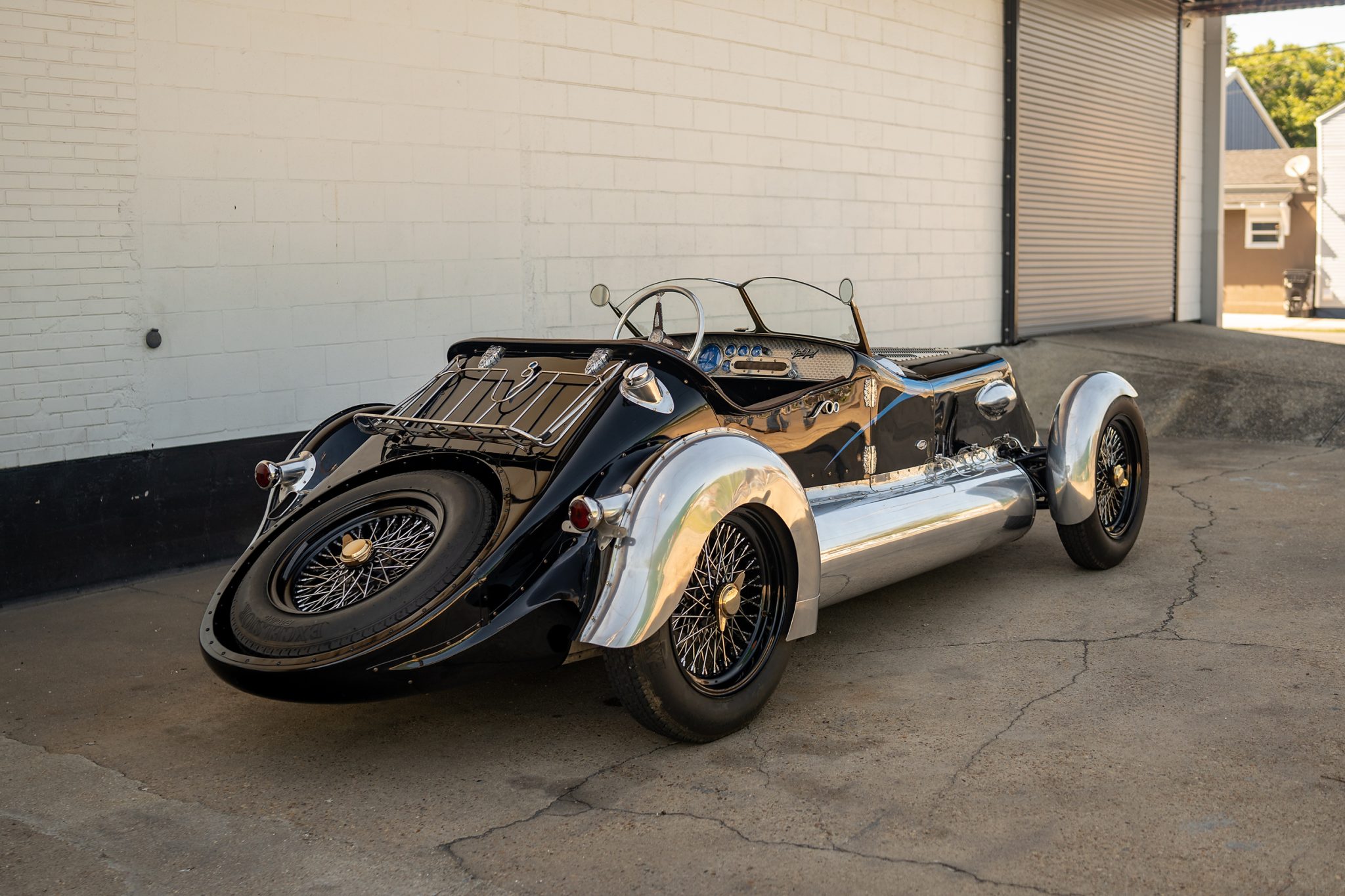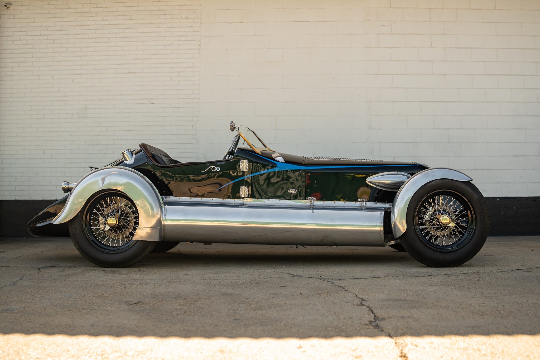 The body was finished in single-stage urethane black paint with hand-applied blue striping by Alan Kirkfield, while the fenders and side pods remain in polished bare aluminum. Additional design touches include a centrally hinged hood with polished louver panels, a bell-shaped grille with vertical vanes, a raked V-shaped windshield holding side mirrors with cast housings, a stainless-steel luggage rack, a high-mounted side exhaust, rectangular headlight assemblies, stainless-steel door handles and hood latches, sand-cast hinges, and sand-cast Magnolia Special and Bienville Studios badges. The latter represent the seller’s New Orleans studio.