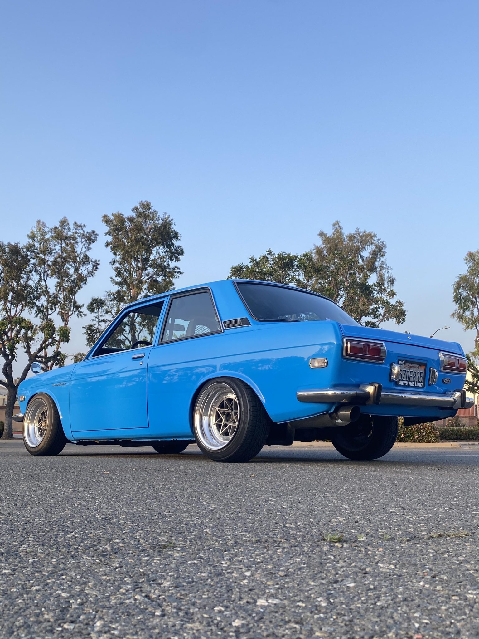 Gray-painted 15″ Colin Speed Star wheels were reportedly rebuilt with aftermarket barrels by Wheel Flip and are wrapped in 175/55 Kumho Solus KH16 tires. The suspension has been modified with Function Form coilovers and adjustable camber plates, and stopping power is provided by four-wheel disc brakes with Wilwood calipers over drilled and slotted rotors up front.