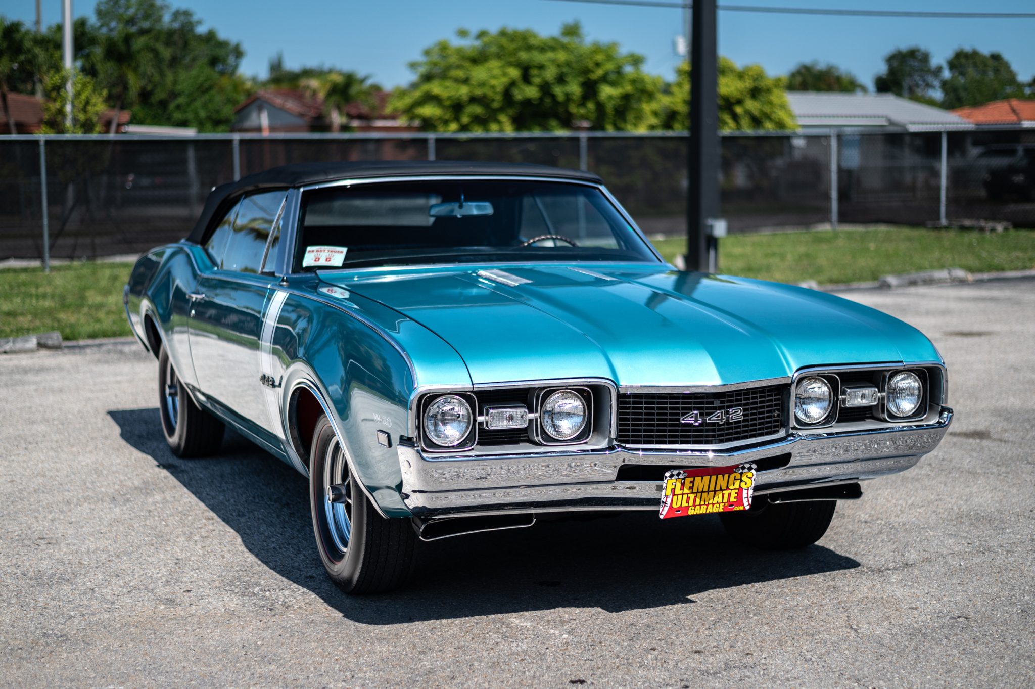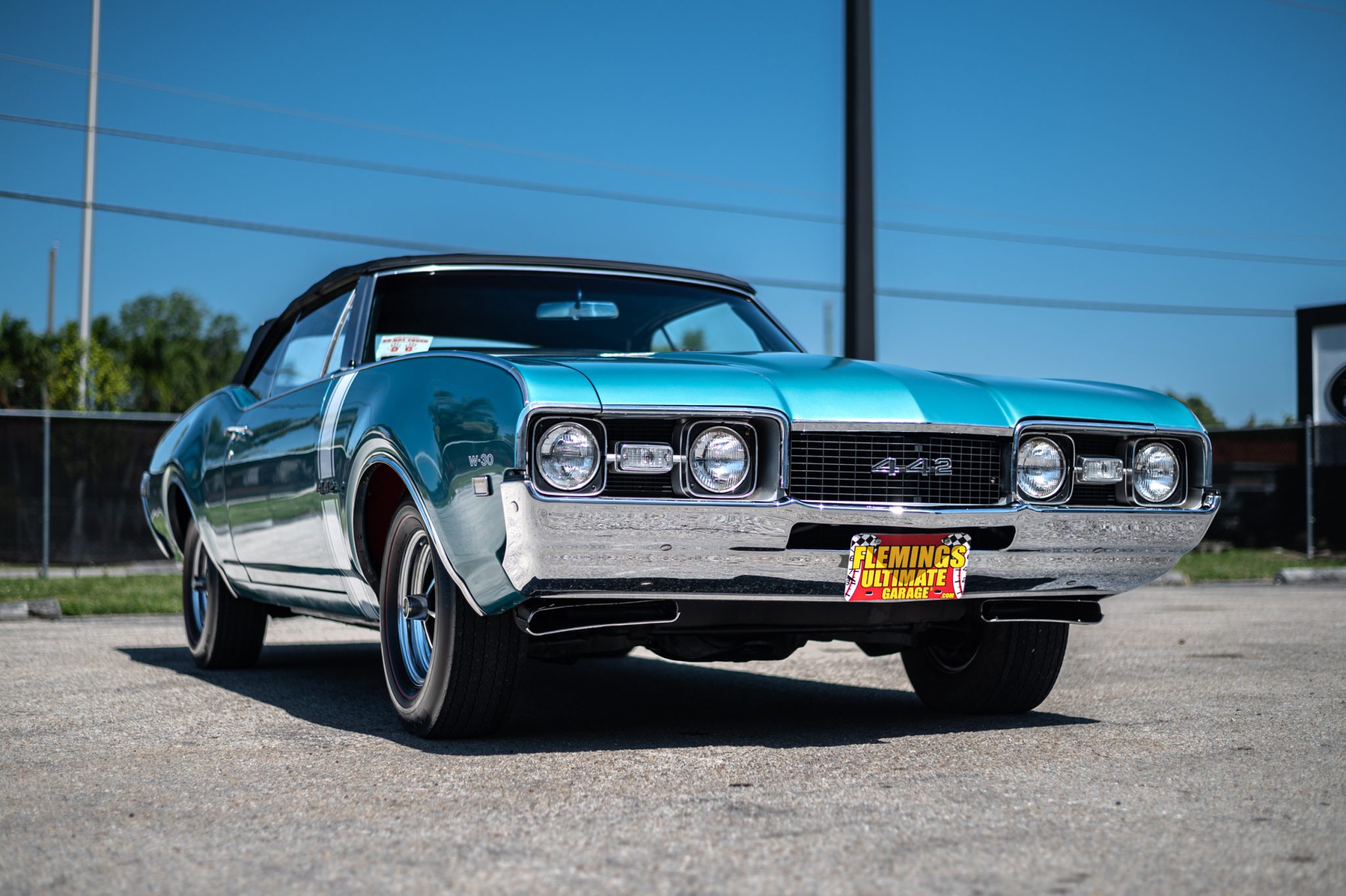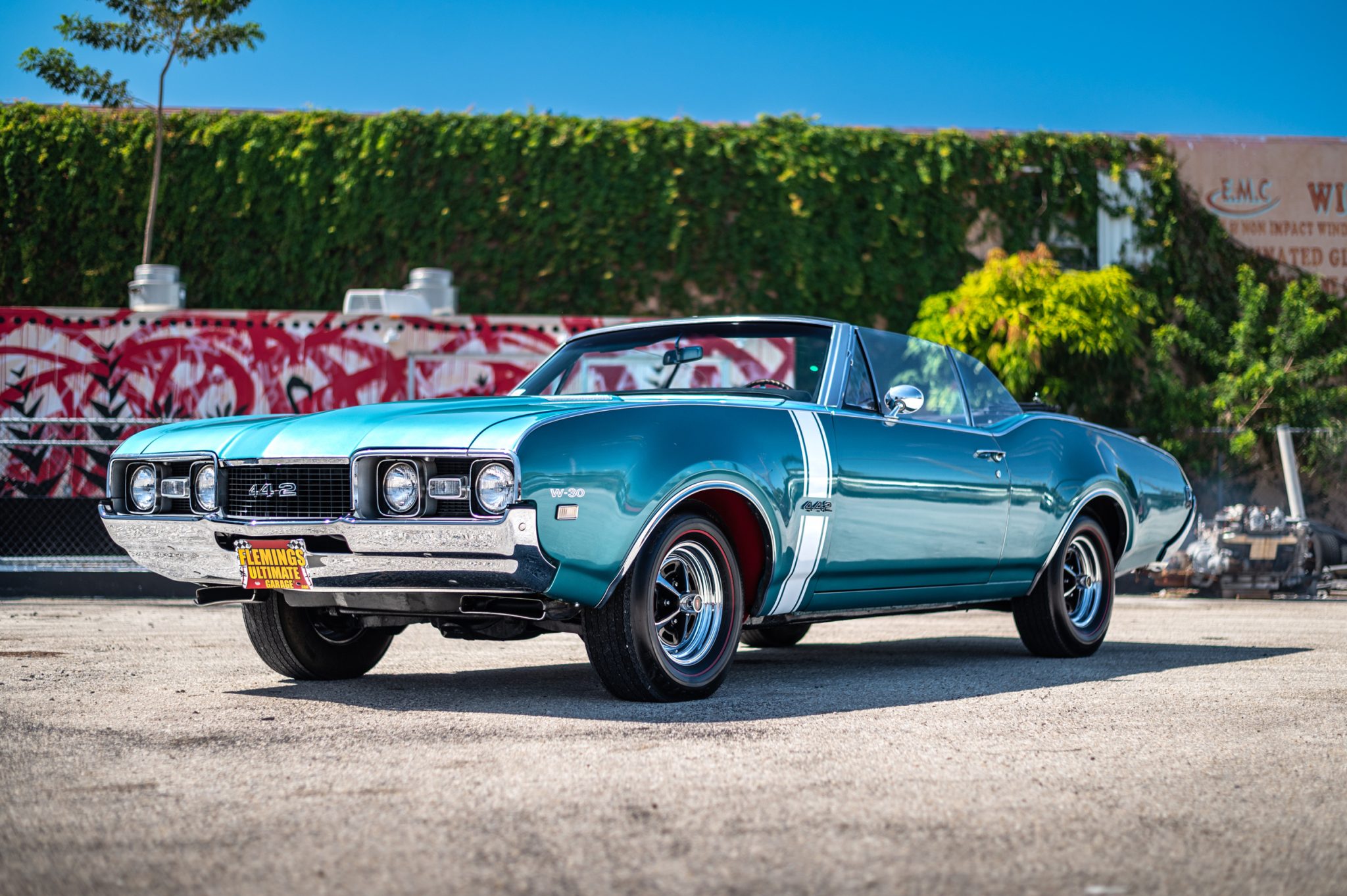 Super Stock 14″ wheels feature Oldsmobile-branded center caps and are mounted with Goodyear Polyglas red-line tires, while a full-size spare is housed in the trunk compartment. The shocks and springs are said to have been replaced under previous ownership, and the wheel cylinders and rear brake lines were replaced in October 2019. Stopping power is provided by four-wheel drum brakes.