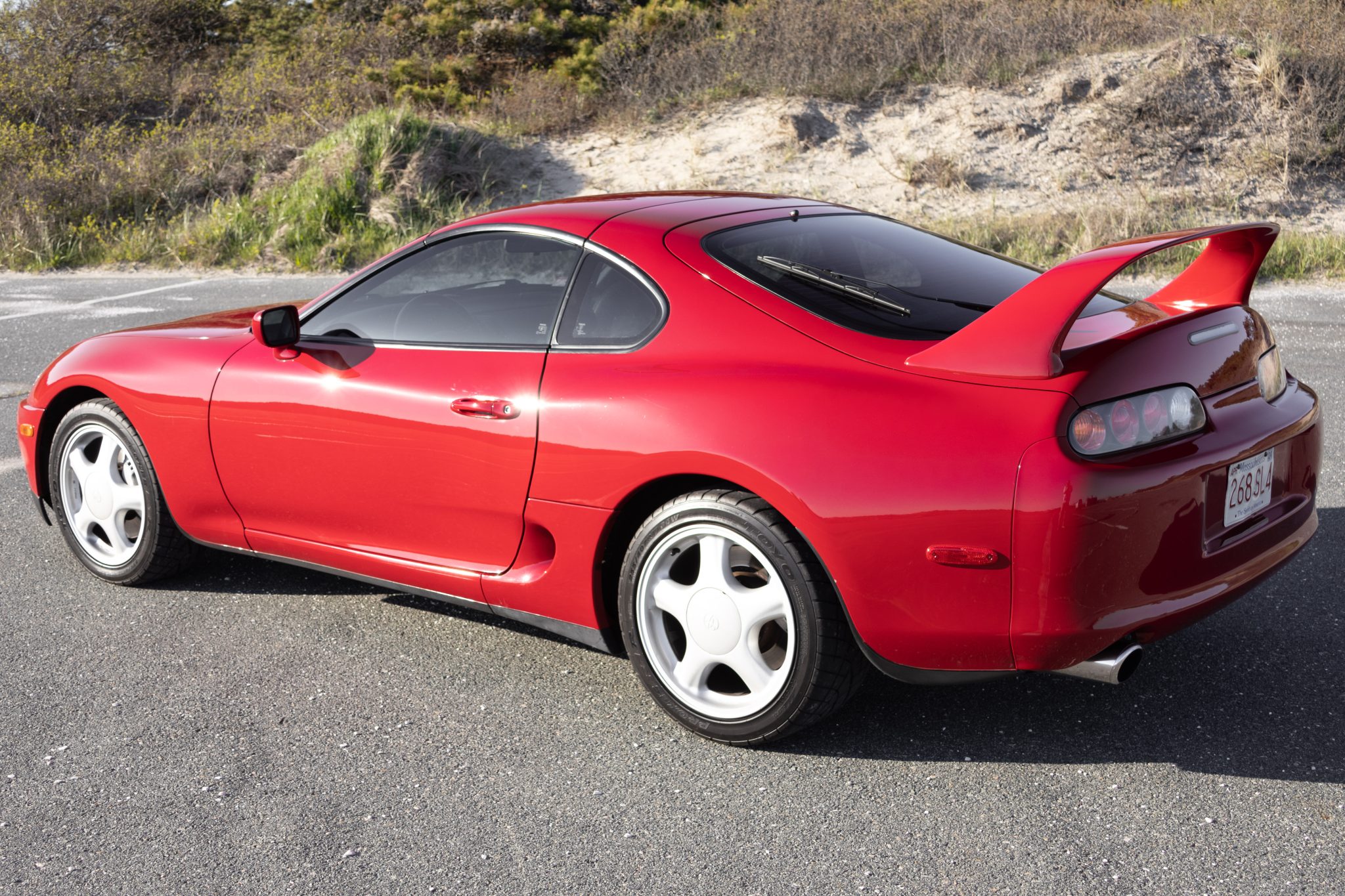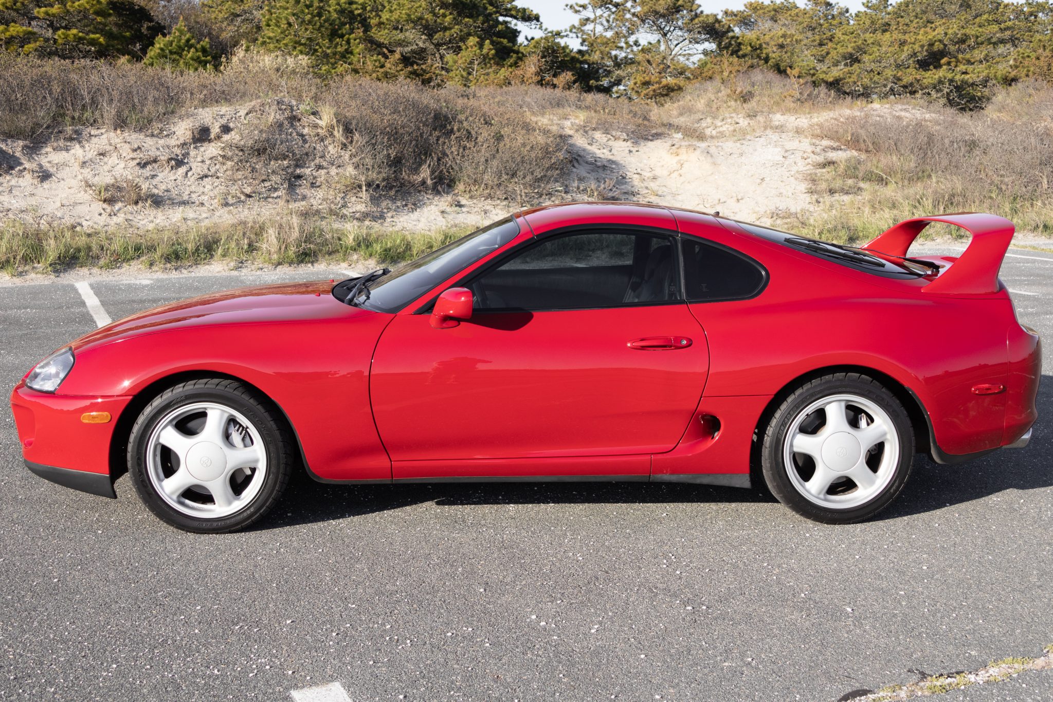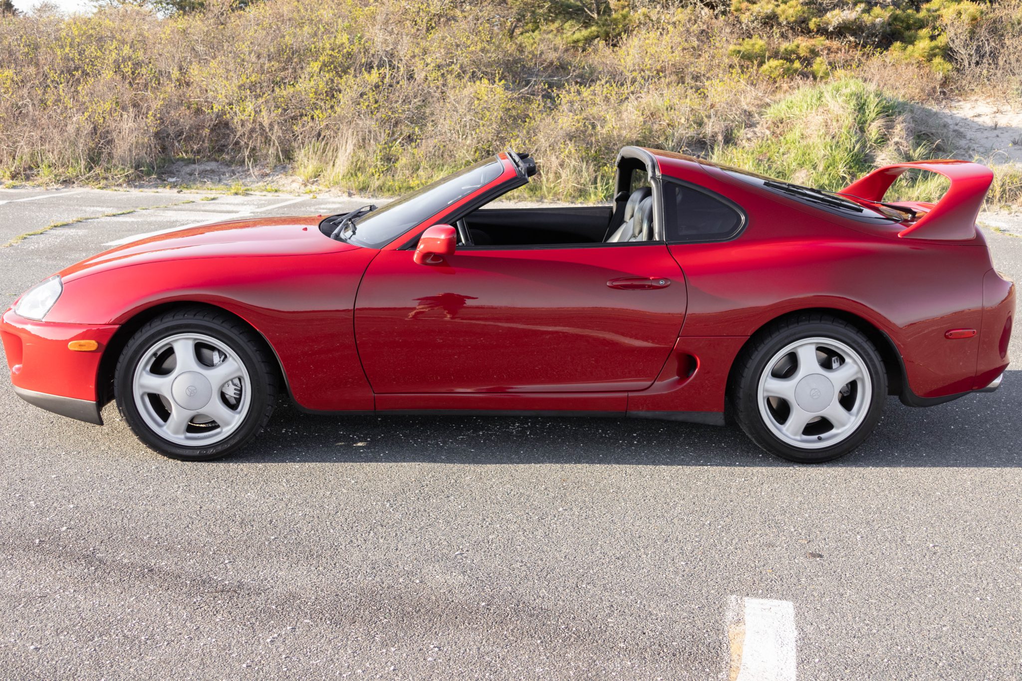 Silver-finished 17″ five-spoke wheels wear 235/45 front and 255/40 rear Toyo Proxes R1R tires, which were mounted in 2023. The car rides on a four-wheel double-wishbone suspension system and features speed-sensing progressive power rack-and-pinion steering and electronic traction control. Anti-lock braking is provided by ventilated discs at each corner. Replacement clutch hydraulic cylinders were fitted in February 2023, per the seller. Tire tread-depth readings are provided in the gallery below.