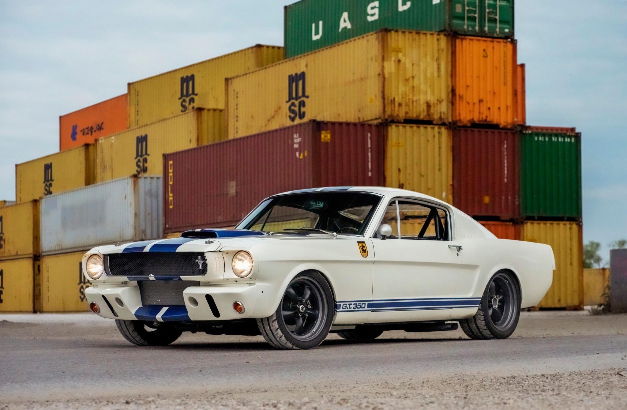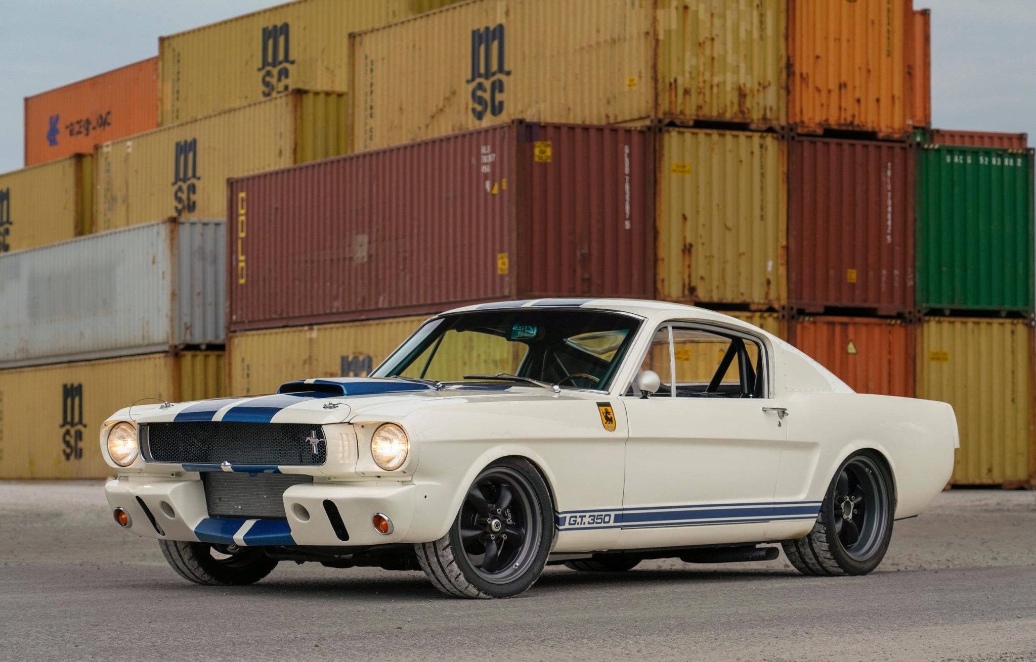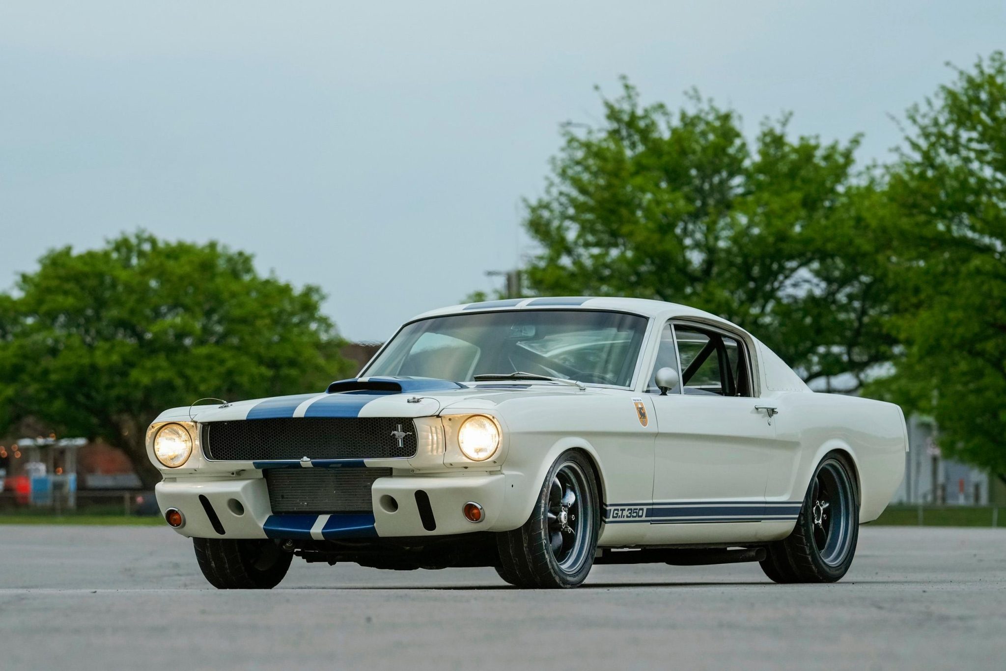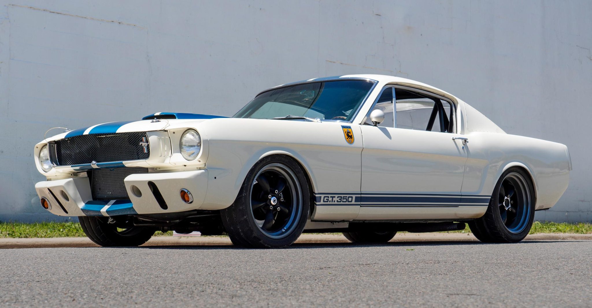 Additional exterior modifications include the addition of a GT350R-style front valance, riveted sail-panel block-off plates, a top-vented plexiglass rear window, pull-up plexiglass side windows, dual oval side exhaust exits, a Raydyot driver-side mirror, GT350 rocker panel script, and a GT350 rear badge. The rear bumper was deleted, and the trunk latch was replaced with a quick-release clip.