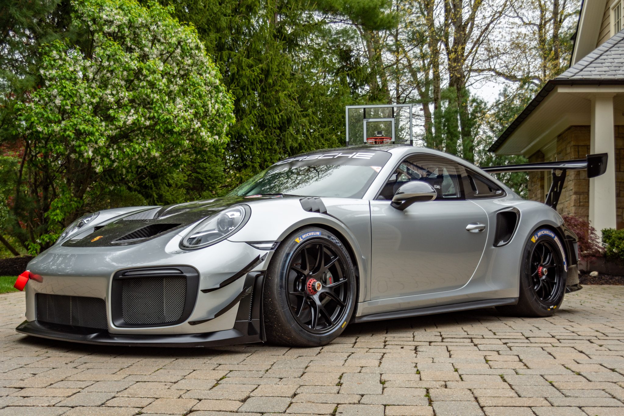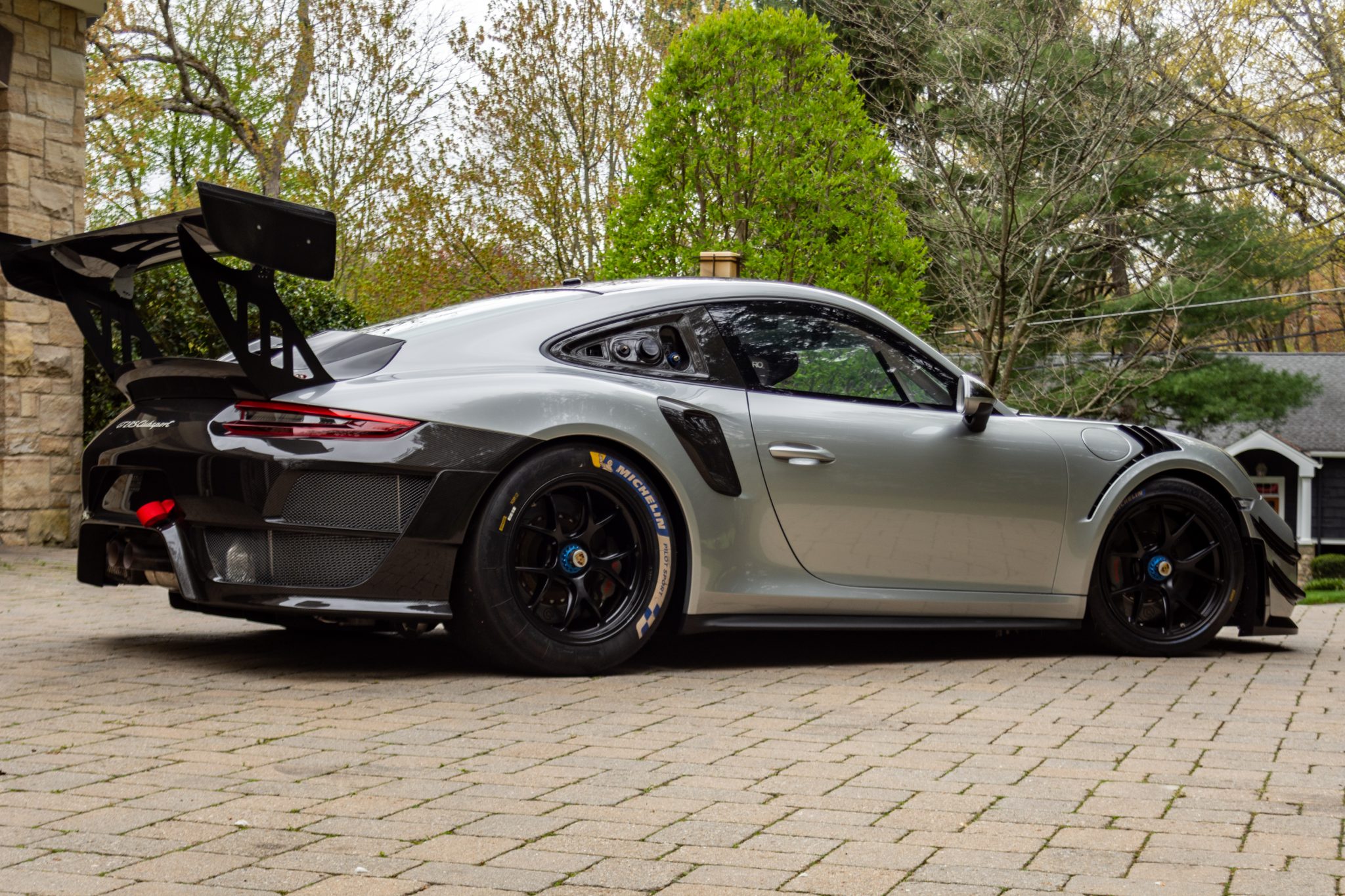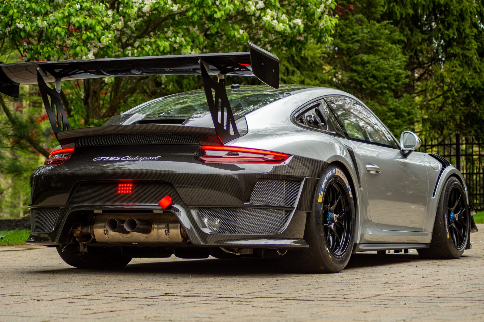 Forged 18″ BBS wheels feature center-lock hubs and are mounted with 27/65 front and 31/71 rear Michelin Pilot Sport GT slicks. The Clubsport features a fully independent suspension with three-way racing dampers, adjustable anti-roll bars, Porsche Stability Management (PSM), and electrohydraulic power steering with a variable steering ratio. Braking is handled by a dual-circuit system with adjustable balance fitted with Brembo six-piston front and four-piston rear calipers as well as vented multi-piece steel rotors. The car also features a three-piston air jack system.