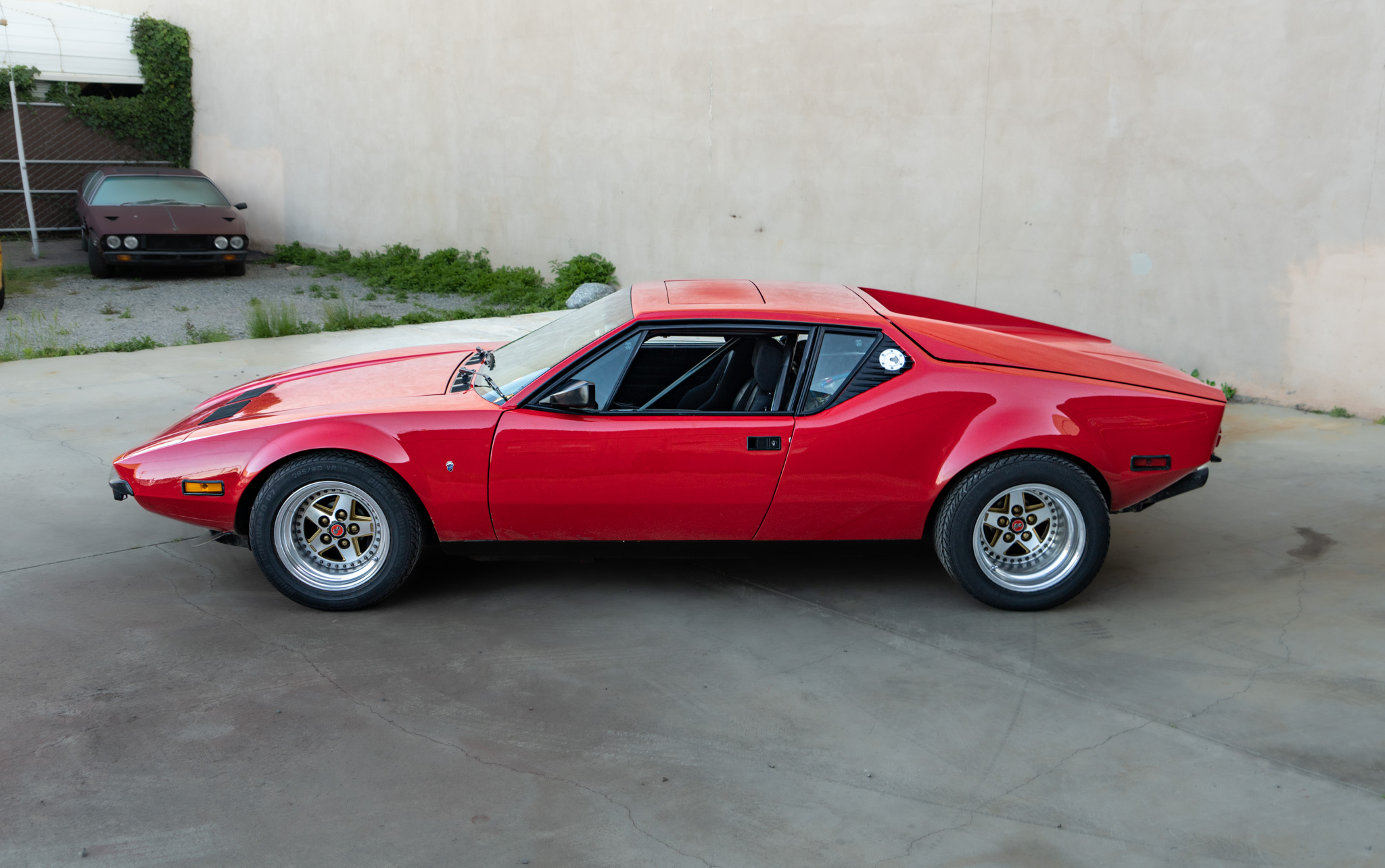 Staggered-diameter 15″ Gotti modular wheels are wrapped in 285/40 front and 345/35 rear Pirelli Cinturato P7 tires that have 2021 date codes. The seller notes that the car is equipped with Koni dampers as well as lightweight lower control arms. Stopping power is provided by four-piston Wilwood brake calipers over vented rotors at all four corners, and the front calipers and rotors were reportedly replaced in 2023.