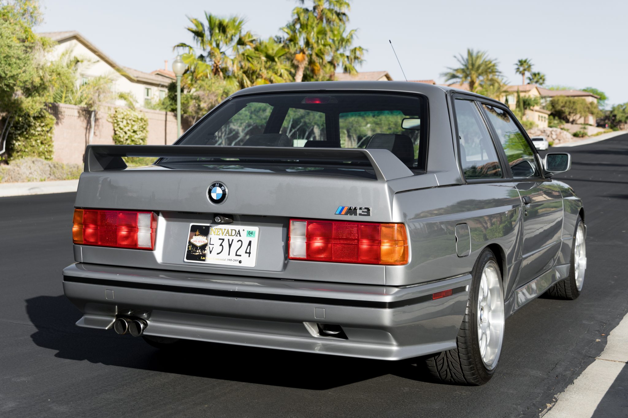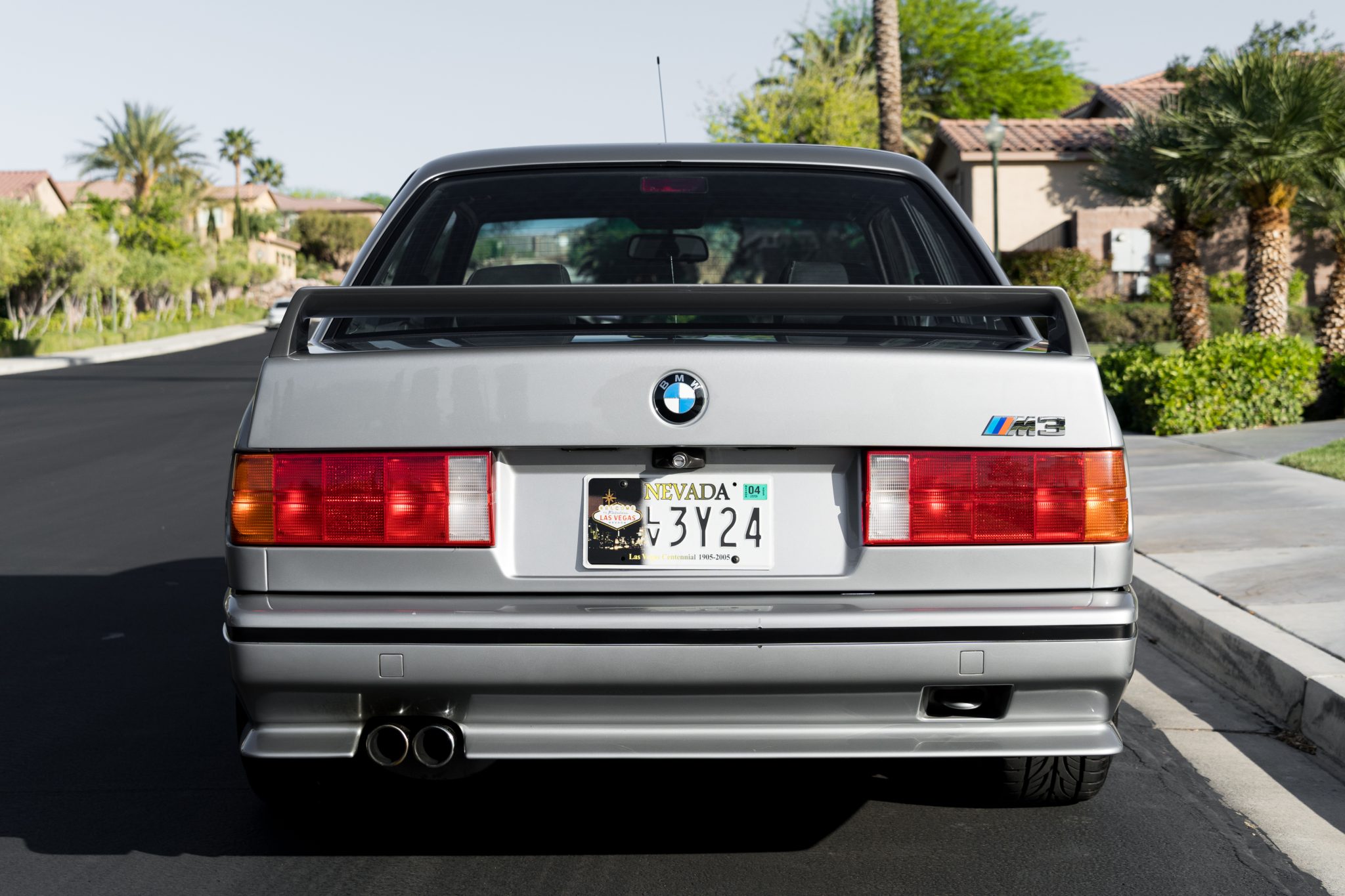The 17″ BBS ASA multi-spoke wheels are mounted with staggered-width Fuzion ZRi tires. The MacPherson strut/semi-trailing arm suspension was revised for the M3 with a thicker rear anti-roll bar, and the car has been modified with Bilstein dampers and lowering springs. Braking is handled by four-wheel cross-drilled rotors, and the seller notes the power steering system leaks. A set of wheels are included in the sale, a photo of which is provided in the gallery below.
