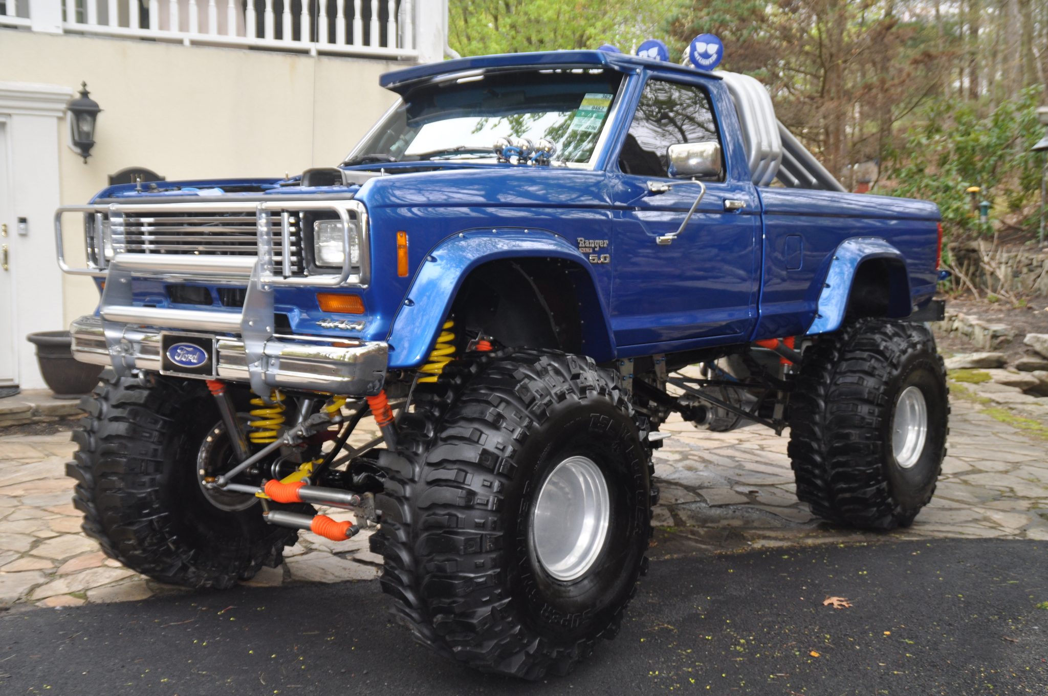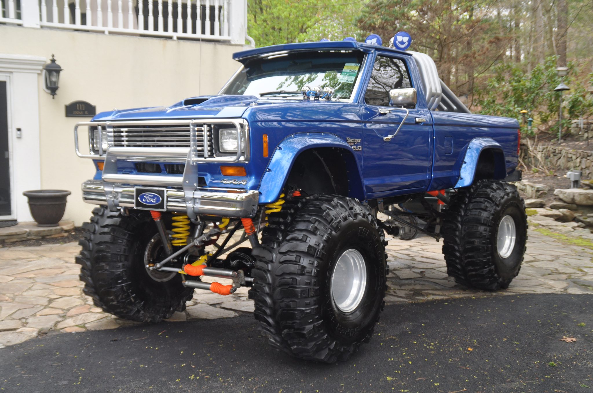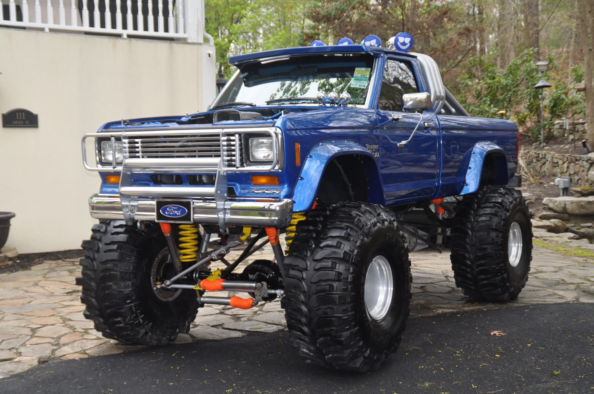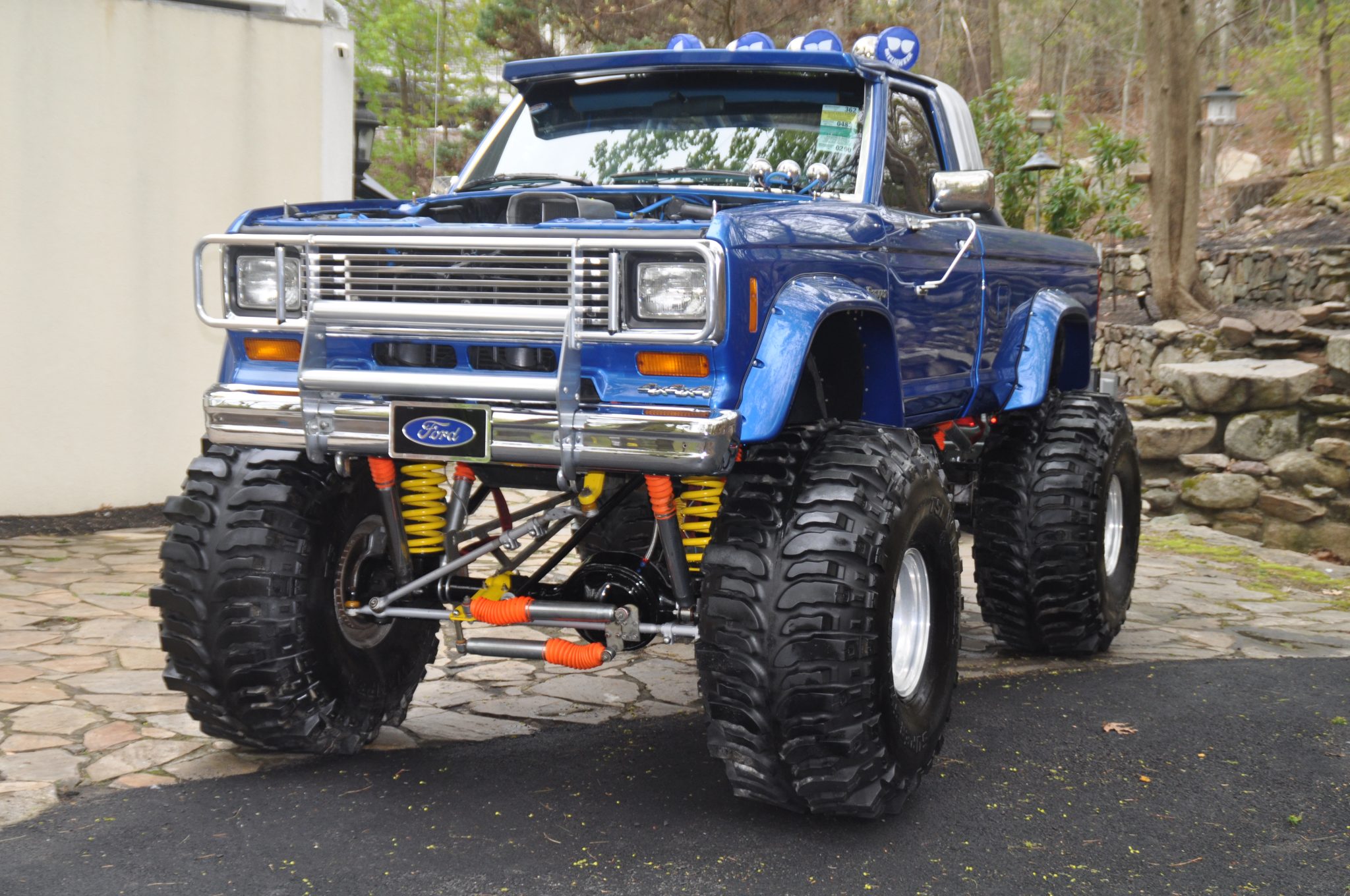 The 15″ alloy wheels are mounted with 44×19.50″ Super Swamper TSL Bogger tires. The truck has a suspension lift and is equipped with a remote-controlled hydraulic rear steering system, Rough Country shocks, front coil springs, limit straps, rear bump stops, and L&L Products traction bars.