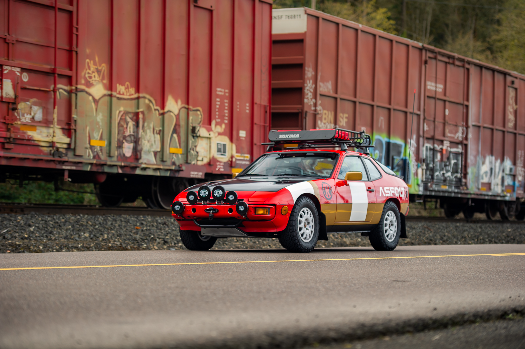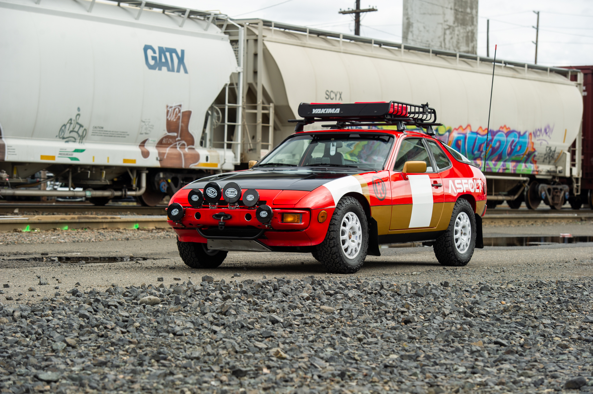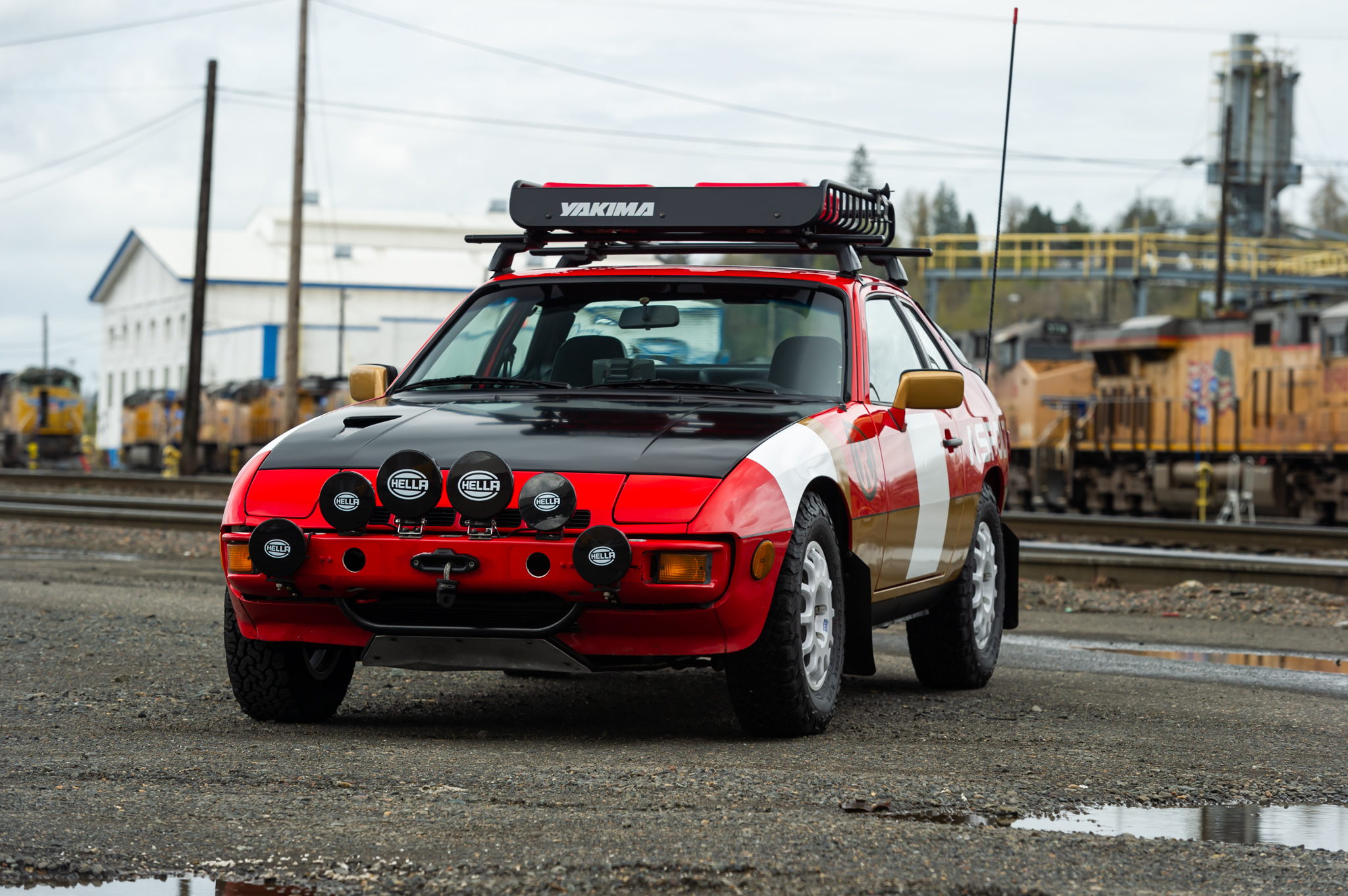 Equipment includes a Yakima roof rack and basket, a custom tube frame front nudge bar, RotopaX fuel jugs and mounts, a Warn winch, mud flaps, skid plates, Hella 500 rally LED lights, and a CB radio antenna. The car rides higher than stock on 15” Braid Fullrace TR wheels wrapped in 215/75 BFGoodrich KO2 tires, and a spare wheel is included.
