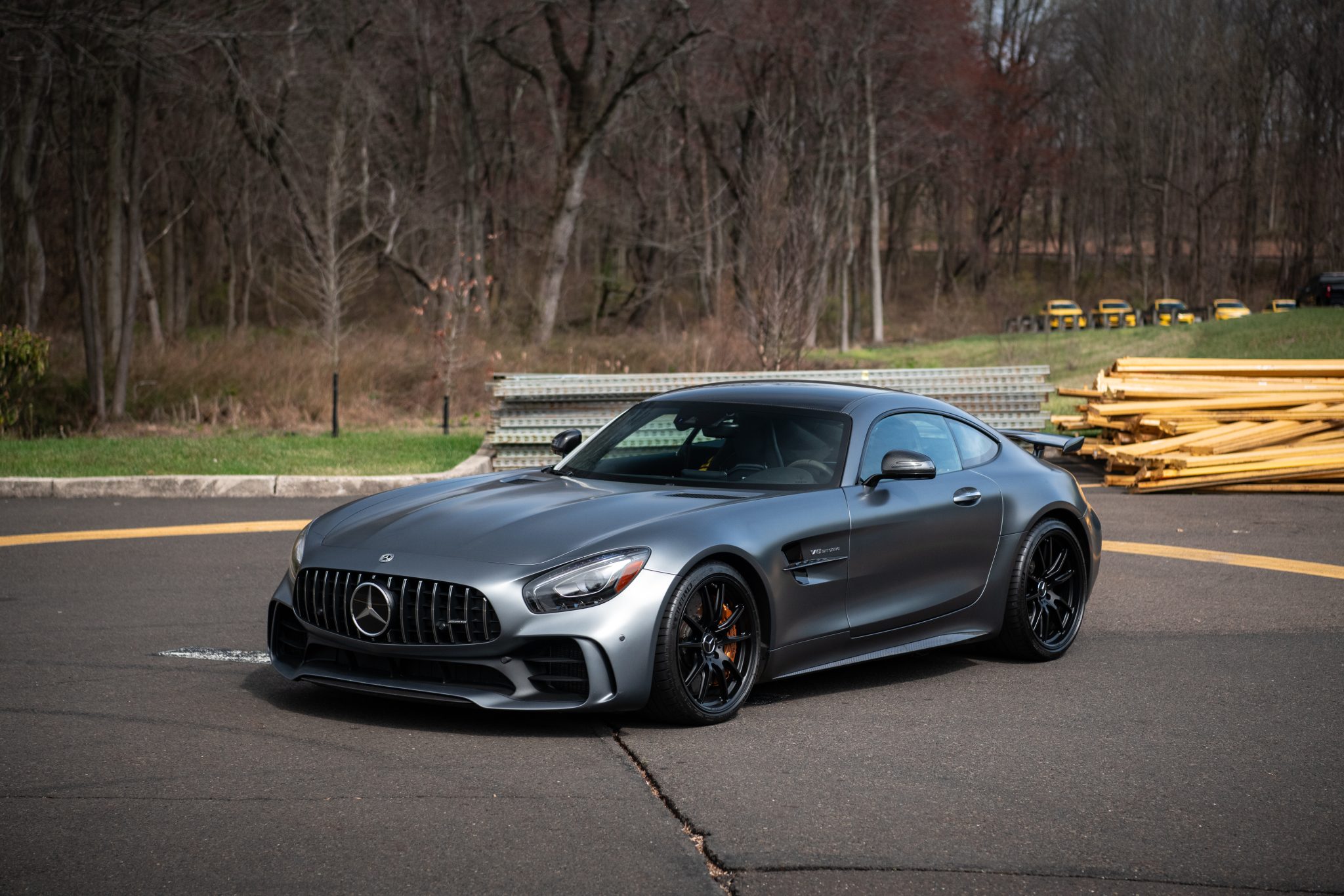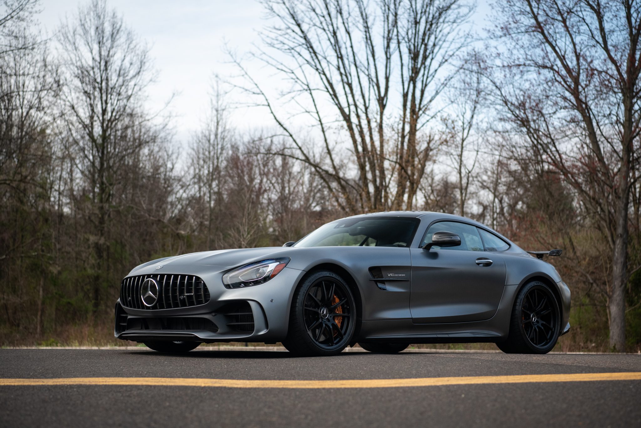 Black-finished 19″ and 20″ AMG wheels are mounted with Michelin Pilot Sport 4S tires measuring 275/30 up front and 325/25 at the rear. Curb rash is visible on the wheels, and there is a gouge in the sidewall of the left-rear tire. The AMG Adaptive Sport Suspension features forged dual wishbones in the front and rear, and the car is fitted with a rear-axle steering system. Stopping power is provided by carbon-ceramic brakes with gold-finished calipers. The brake fluid was flushed in 2020.