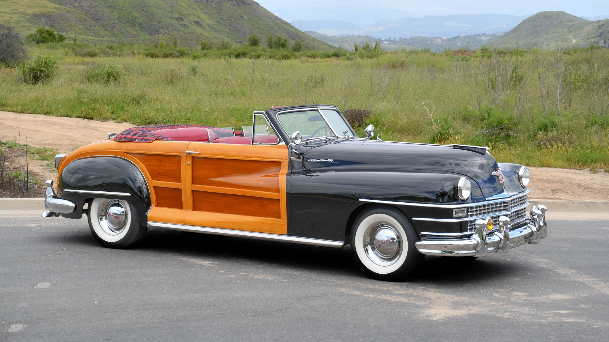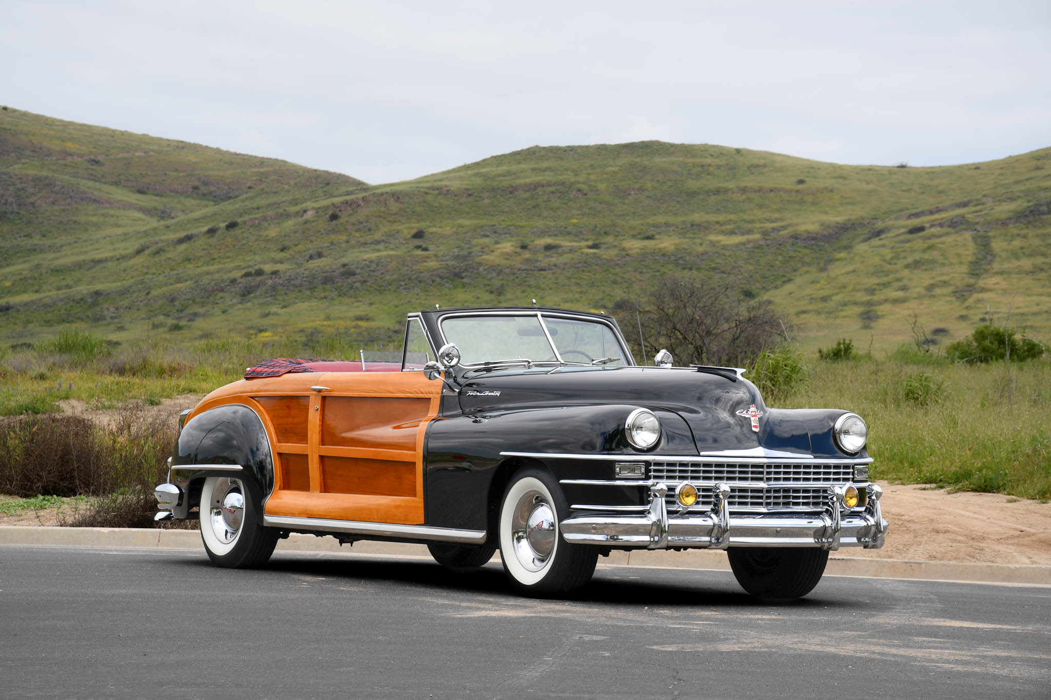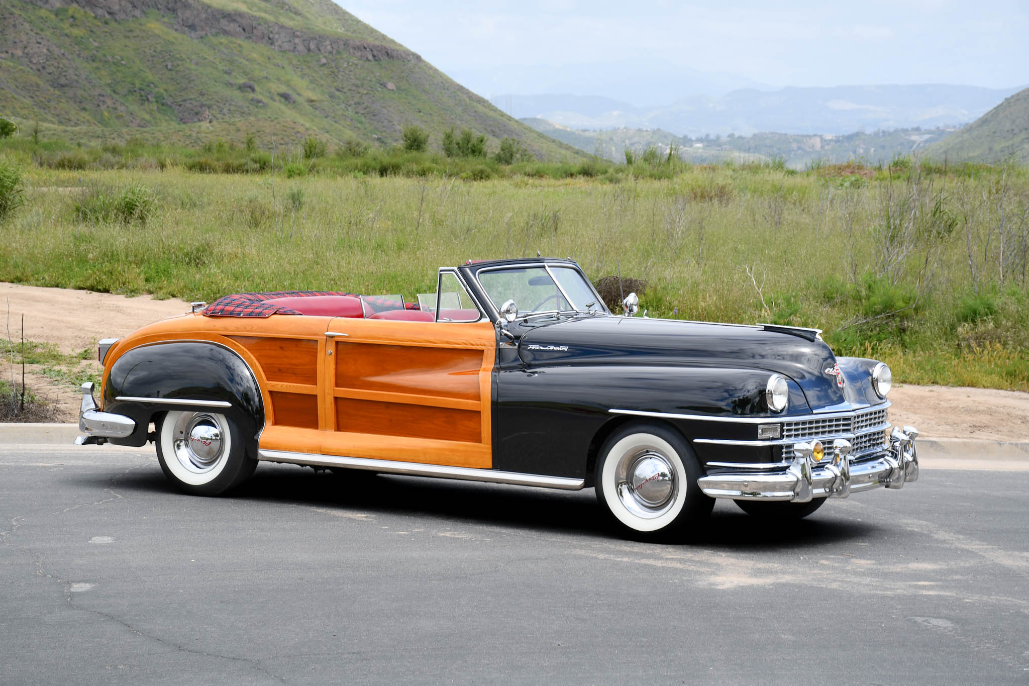 Steel 15″ wheels wear chrome hubcaps and trim rings and are mounted with Coker Classic whitewall bias-ply tires. A matching spare wheel and tire are located in the trunk. The C39 Town & Country rode on a 127.5″ wheelbase and featured an independent front suspension with coil springs as well as a live rear axle with semi-elliptical leaf springs. Braking is provided by hydraulic drums at all four corners.