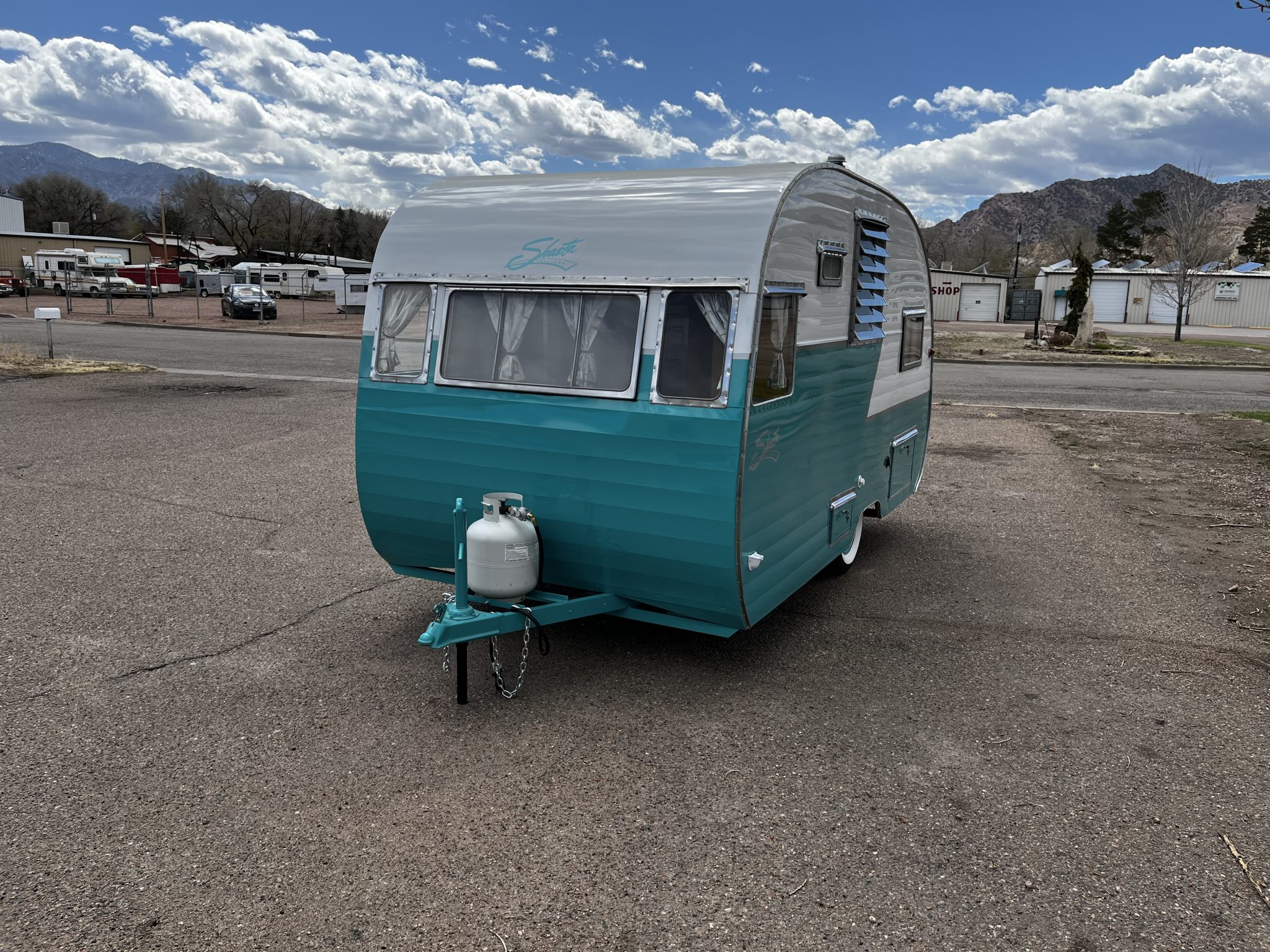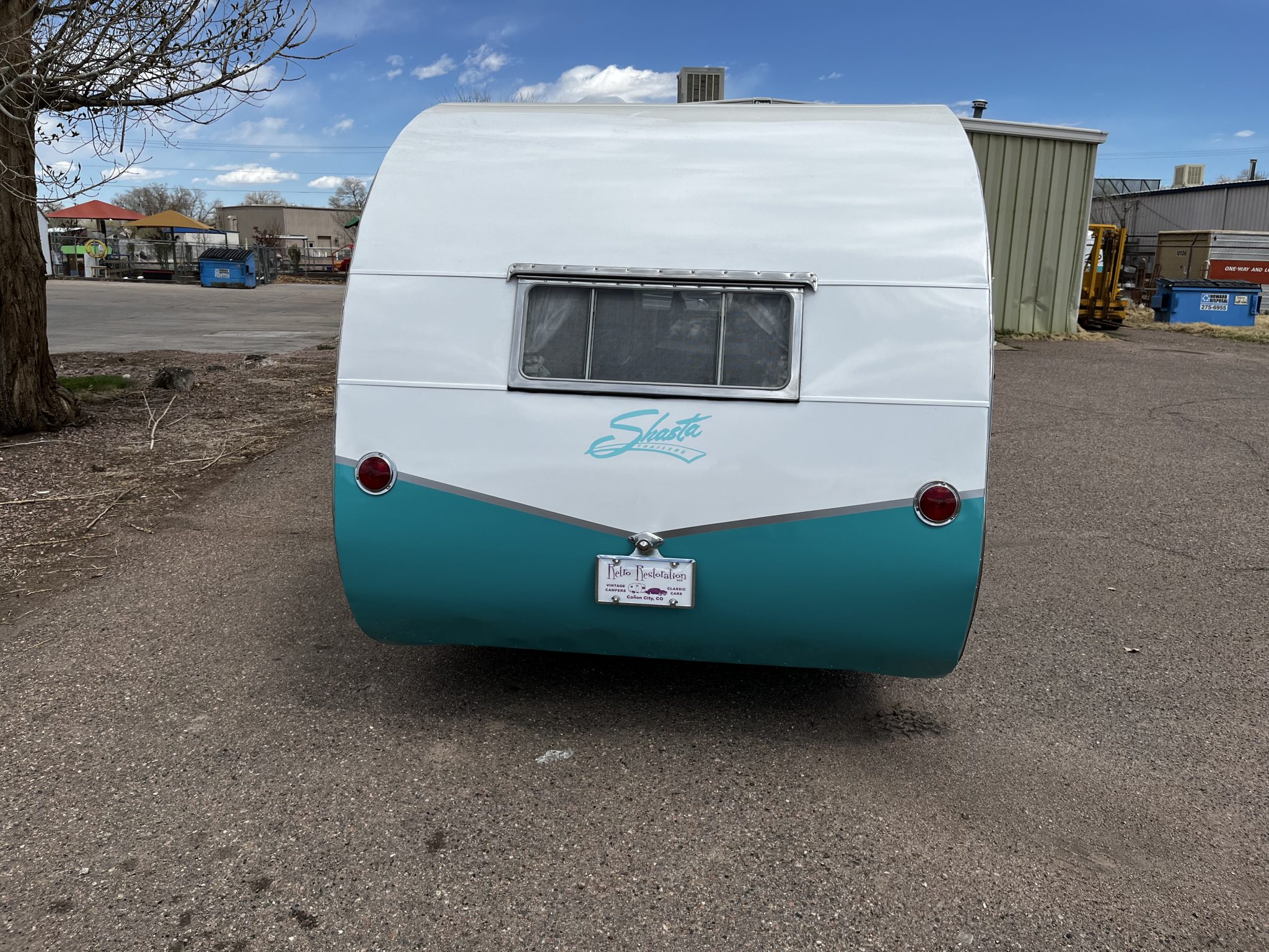 Turquoise steel wheels are fitted with polished hubcaps and wrapped in whitewall trailer tires, and the wheels are equipped with electrically actuated drum brakes. Work in 2023 reportedly involved replacing the wheels and tires as well as servicing the wheel bearings and the brakes.