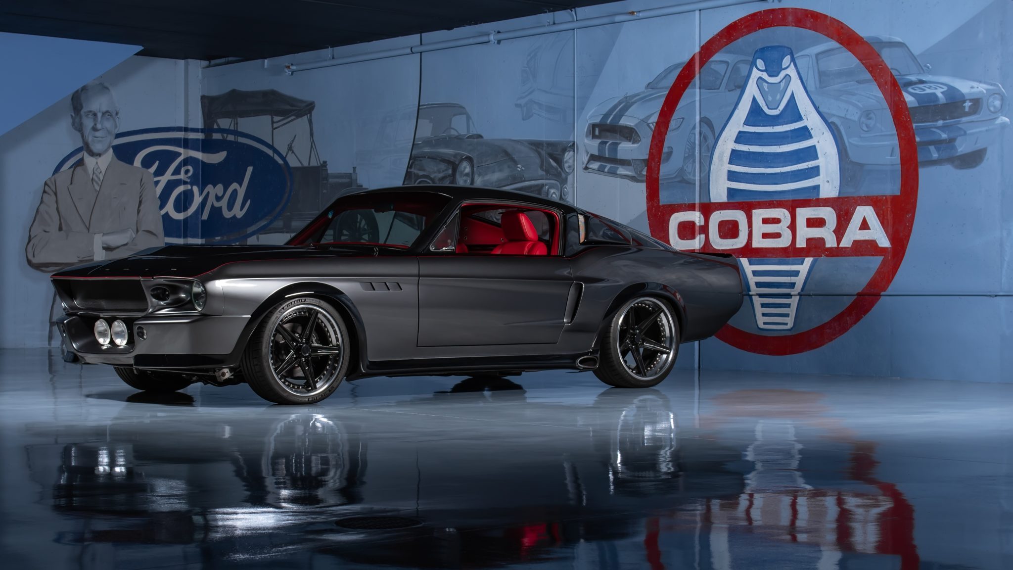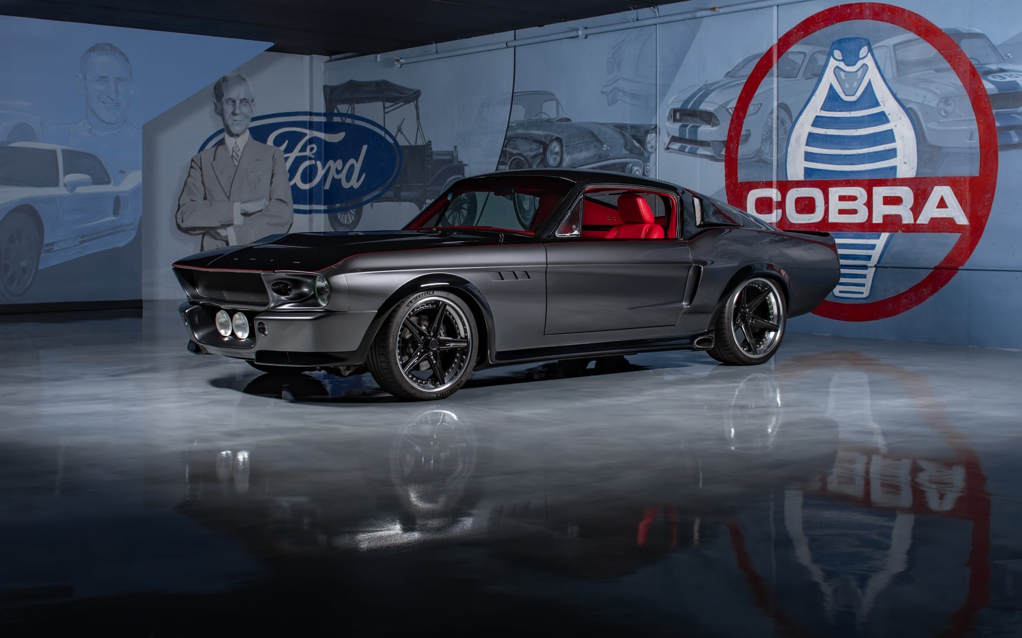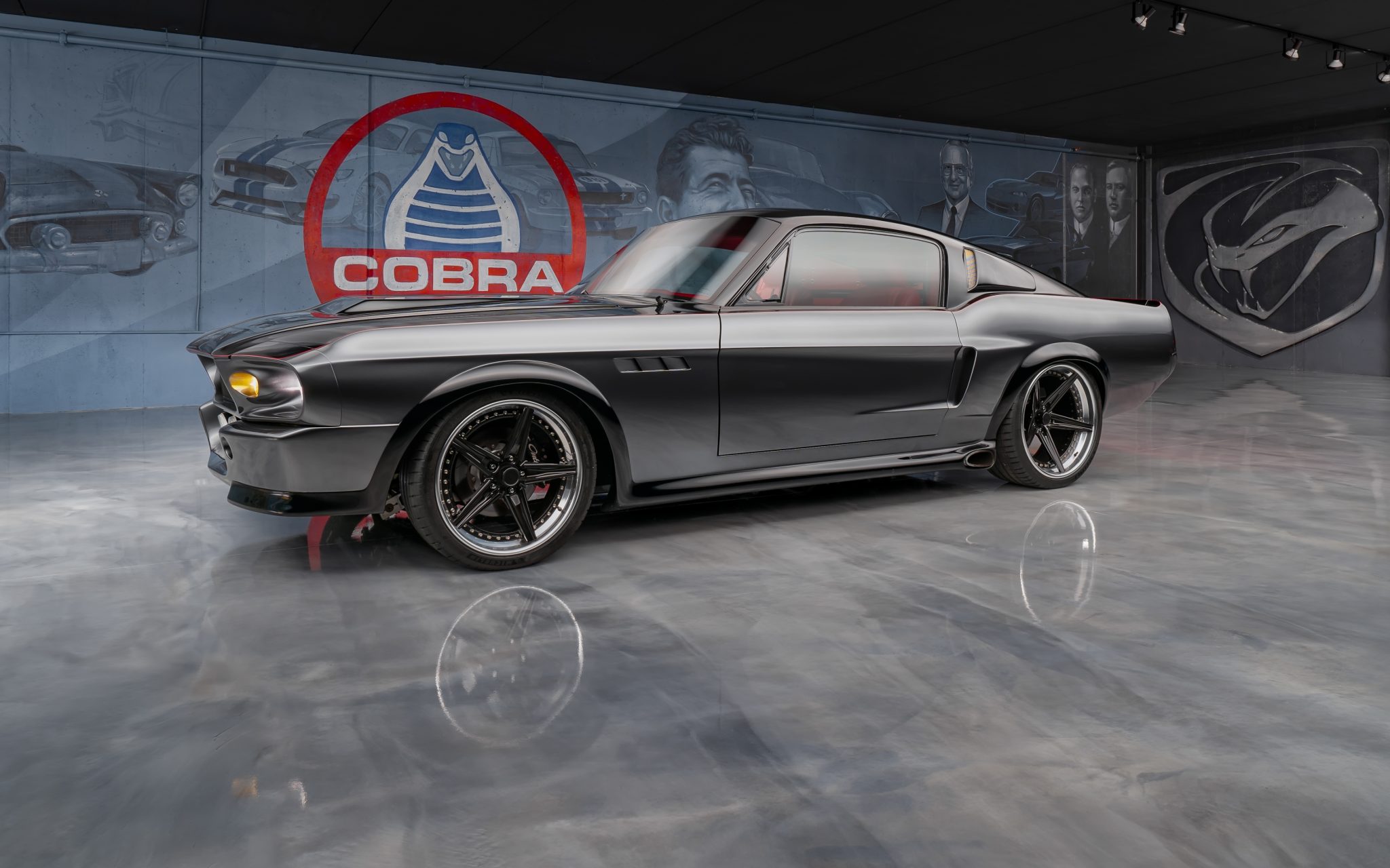 The 19″ and 20″ diameter Billet Specialties wheels wear Michelin Pilot Sport tires measuring 235/35 up front and 285/30 out back. The Schwartz Performance tubular chassis features four-wheel independent suspension and Ridetech four-wheel adjustable coilovers, and braking is handled by power-assisted four-wheel discs with Outlaw calipers up front and inboard Wilwood calipers out back. A LeMans-style fuel cap is accessed in the trunk compartment.