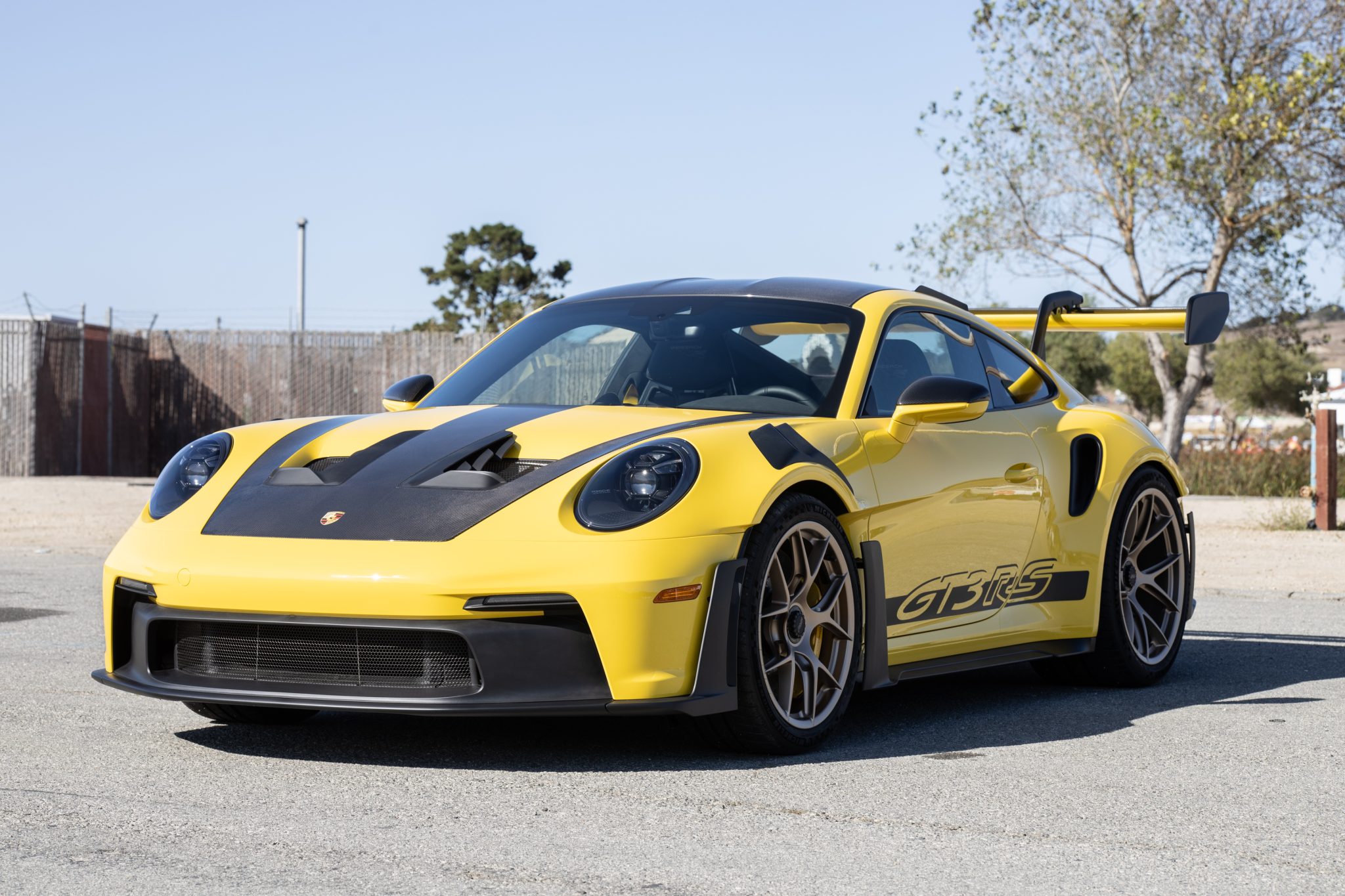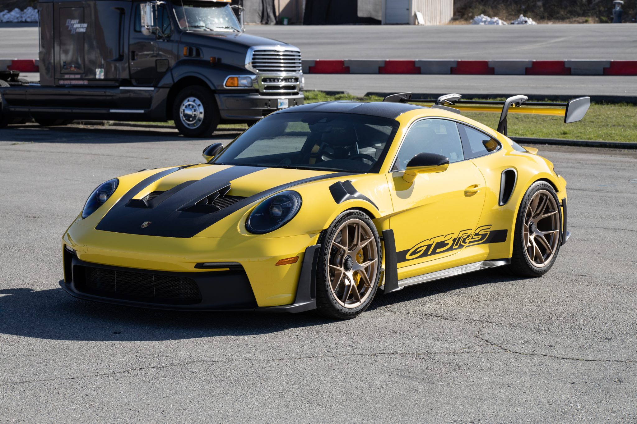 Forged lightweight magnesium 20″ front and 21″ rear GT3 center-lock wheels are mounted with front 275/35 and rear 335/30 Michelin Pilot Sport Cup 2 tires. Stopping power is provided by Porsche Ceramic Composite Brakes (PCCB) with cross-drilled and ventilated discs at each corner. The car is equipped with a front-axle lift system and rear-axle steering as well as the Weissach Package, which added carbon-fiber front and rear anti-roll bars and coupling rods.