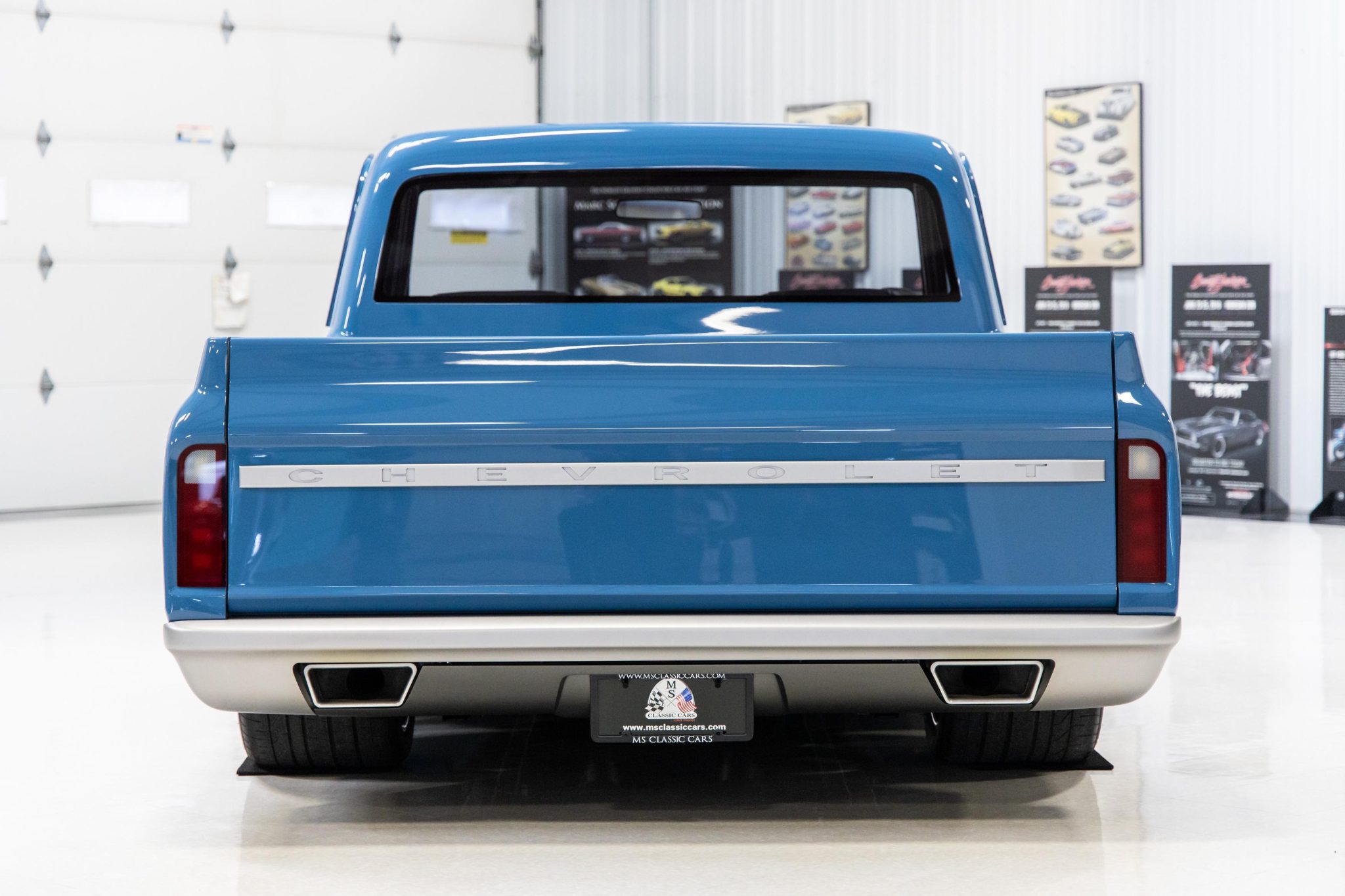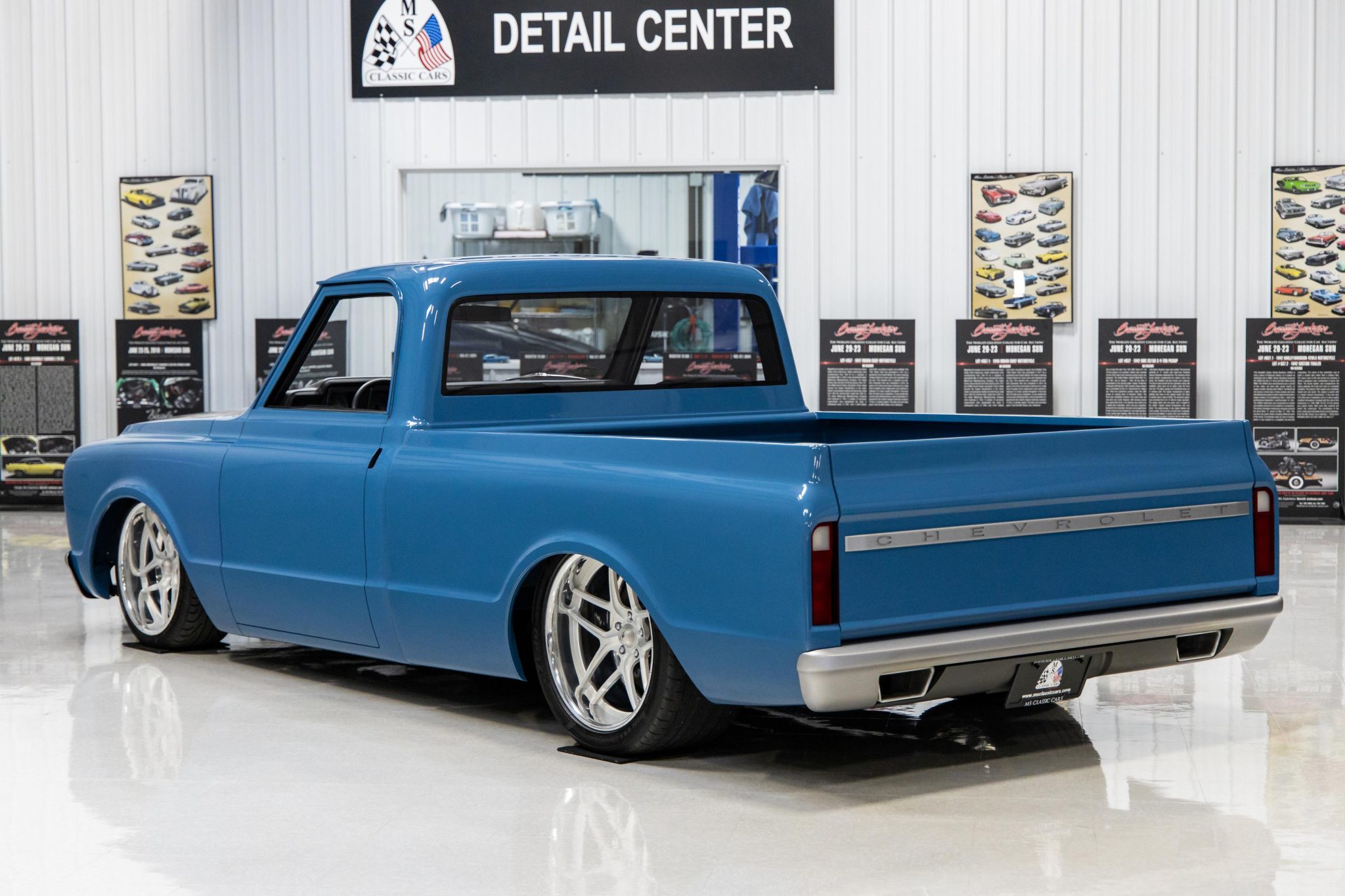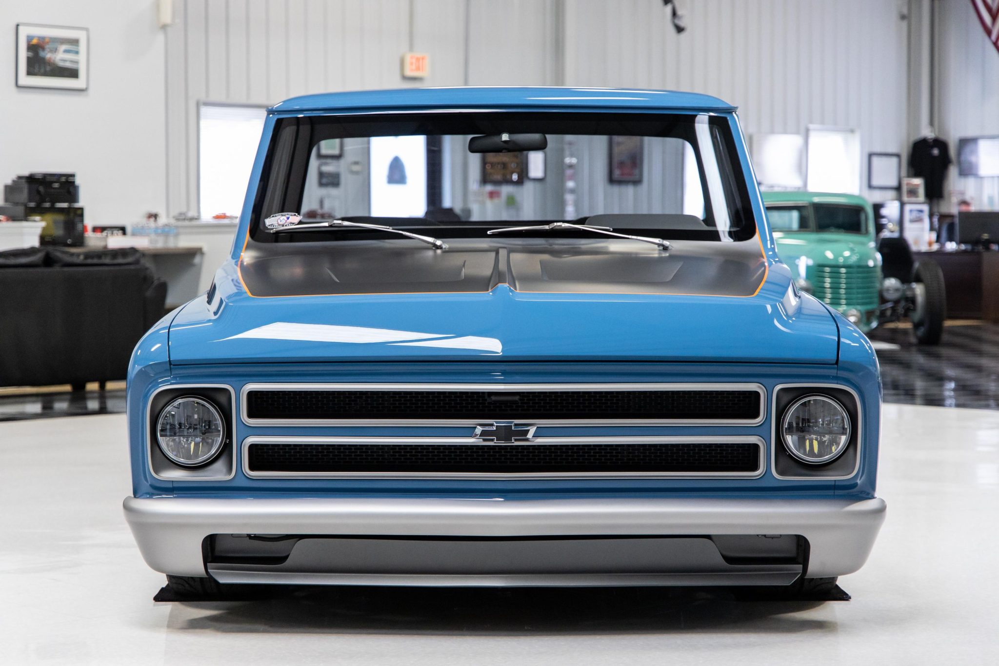 The bed frame was raised, replacement bed panels were fitted, and the bed pockets were filled and smoothed. Custom-fabricated rear tubs were raised and widened to accommodate larger rear wheels, while a 10″ hump provides space for the rear axle. The custom-fabricated tailgate features a Chevrolet-branded aluminum strip machined by Alumicraft, and it is equipped with custom pins and leather straps. The custom body line is shaped into the bottom of the tailgate which rolls into the bedsides. A matte-finish was applied to the body-color metal surfaces, and black boat decking material lines the floors. A fuel filler is located at the rear of the bed.