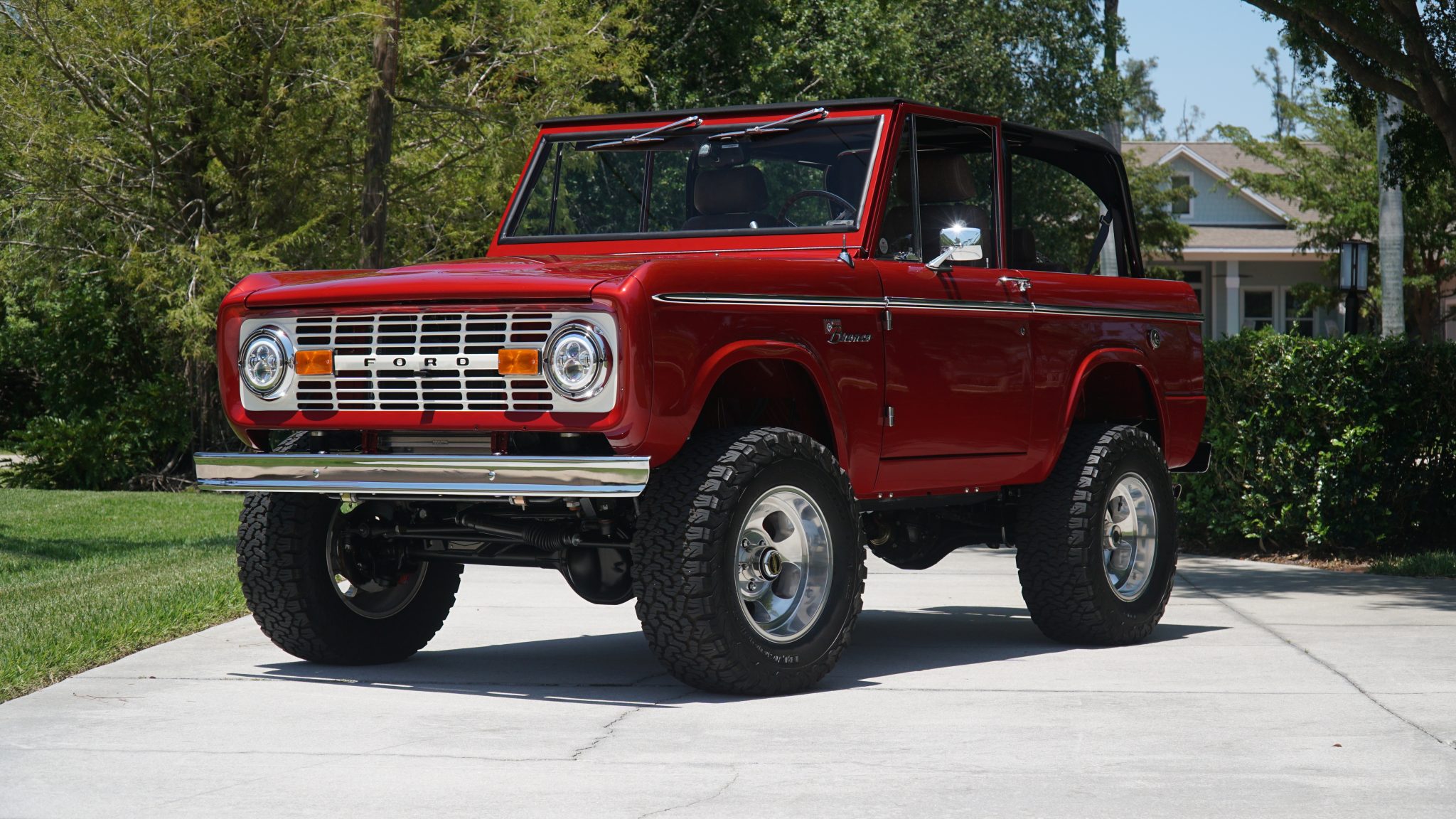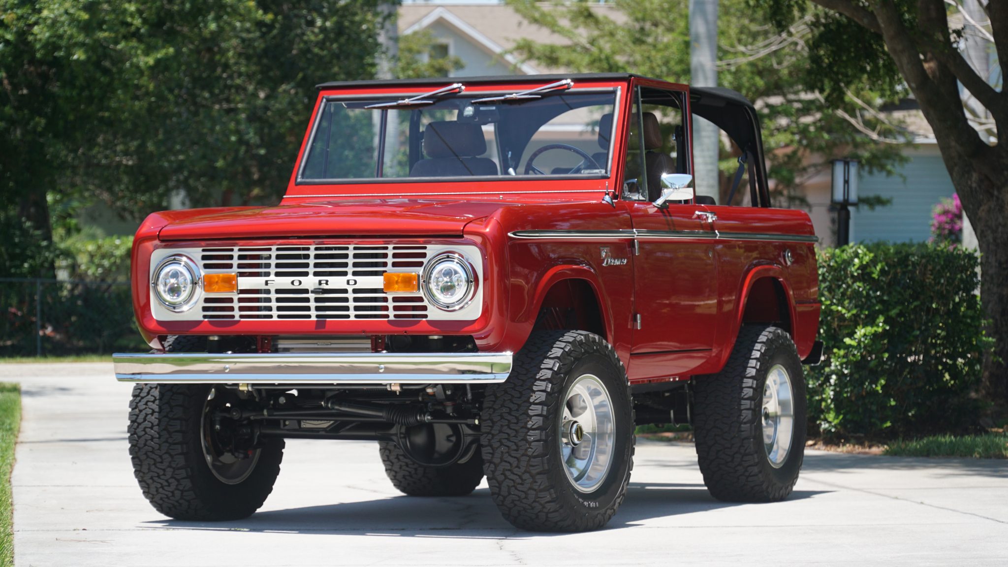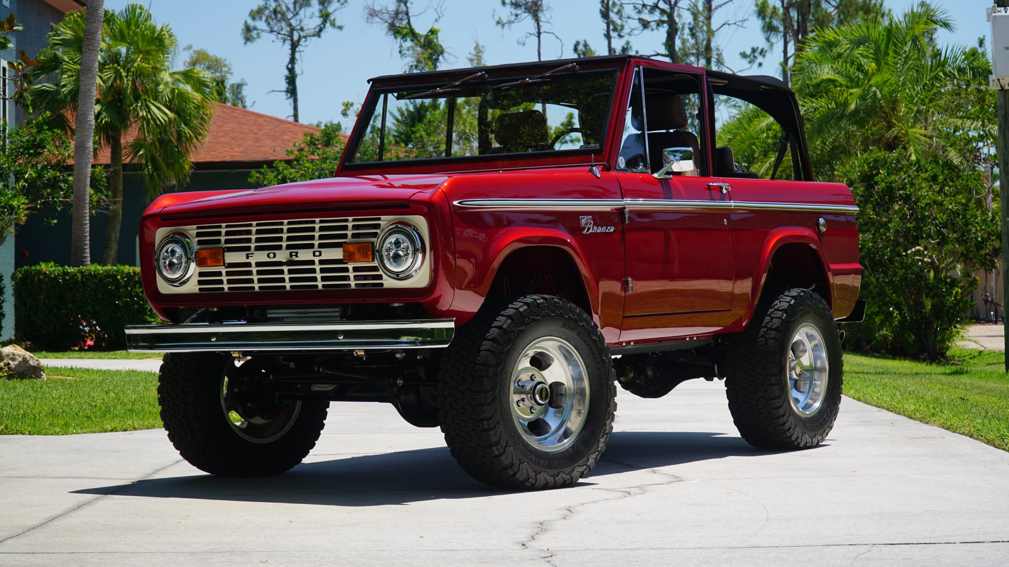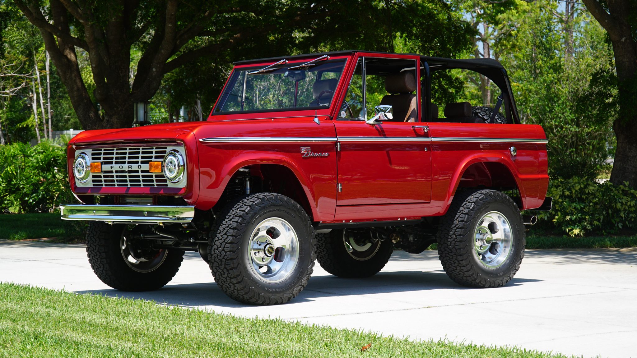 Slotted 17″ polished alloy wheels are mounted with 33 x 12.5″ BFGoodrich All-Terrain T/A K02 tires. A full-size spare is mounted on a rear swing-out carrier. The truck has been fitted with a Kincer chassis components, Bilsein shock absorbers, a 2″ body lift, and power steering. Braking is handled by a Hydroboost power brake system with Wilwood discs at all four corners.