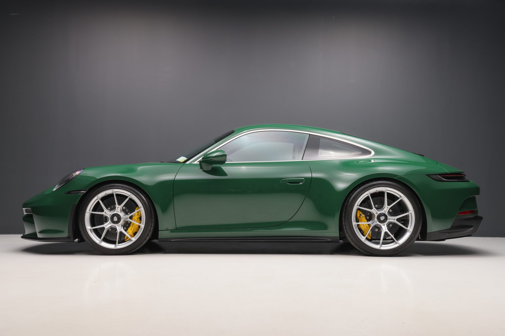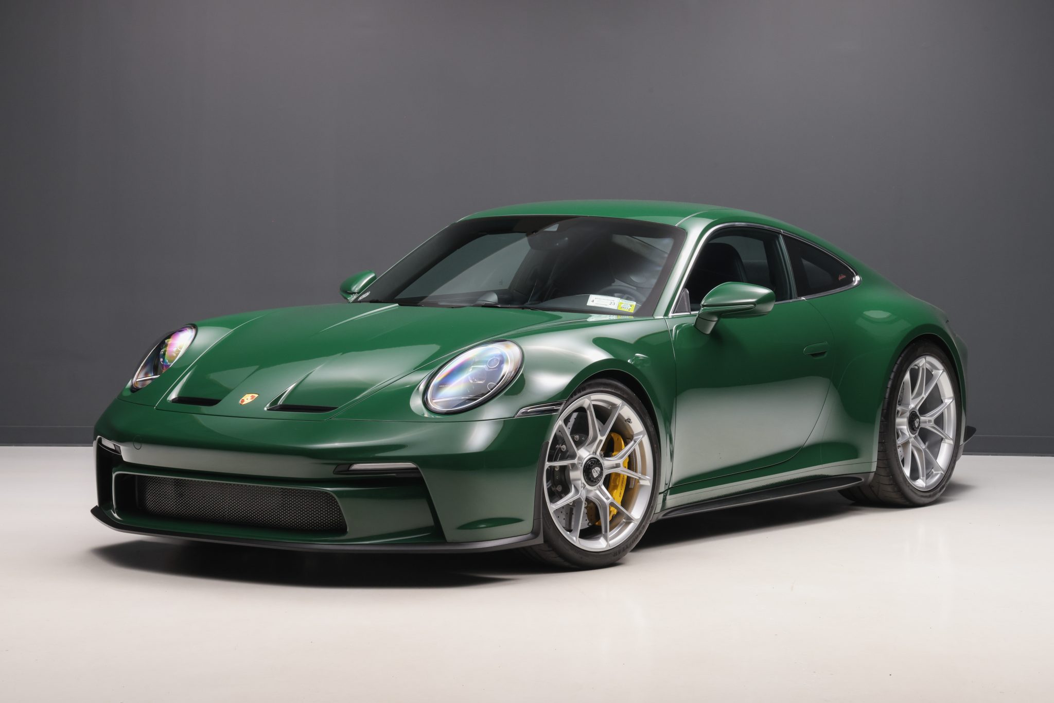 The 20″ front and 21″ rear GT3 center-lock wheels are mounted with staggered-width Goodyear Eagle F1 tires showing 2022 date codes. Stopping power is provided by yellow Porsche-branded calipers over cross-drilled and ventilated ceramic-composite discs at each corner. The car is equipped with a front-axle lift system and rear-axle steering.